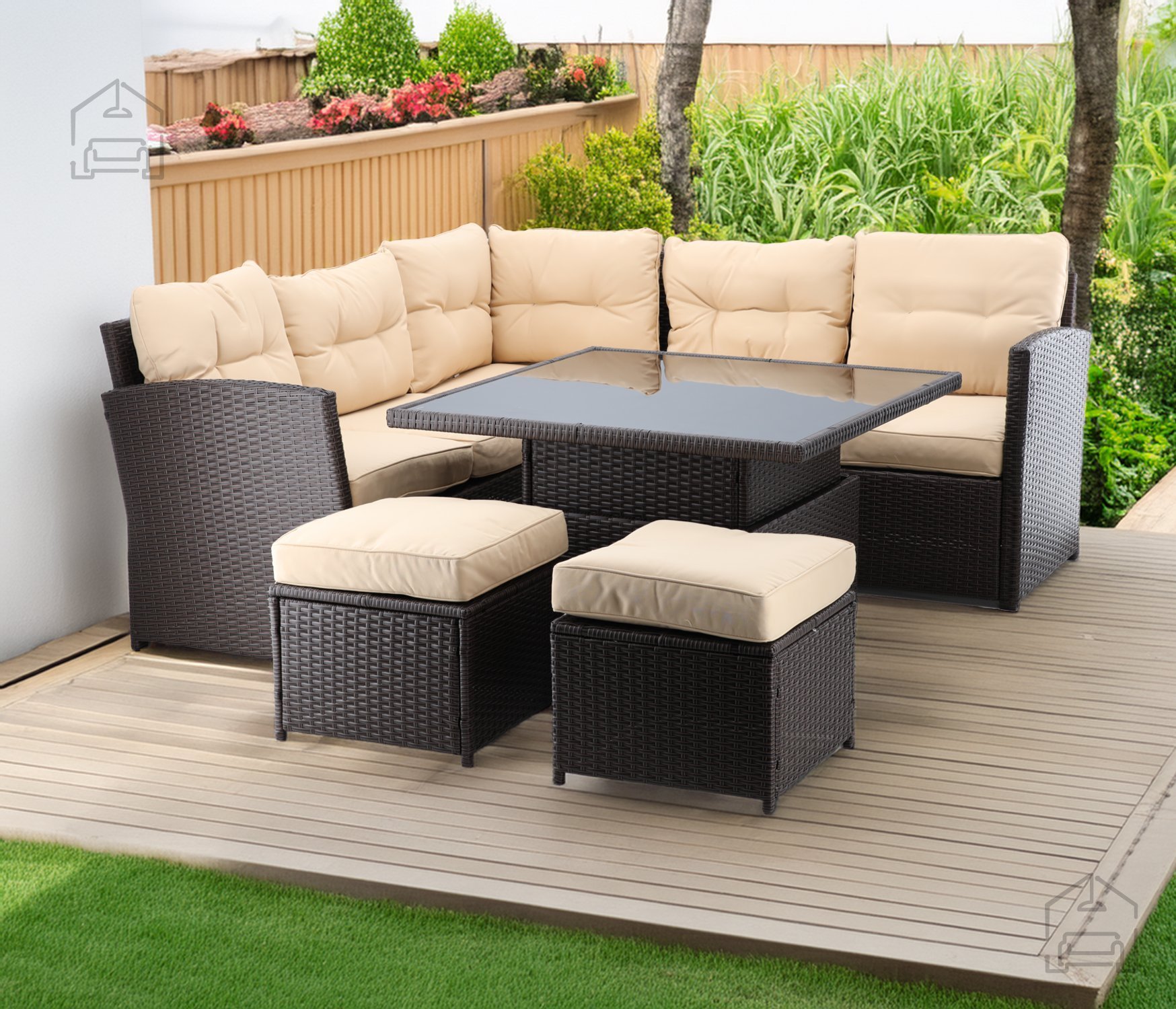 Komplet vsebuje kotno zofo, dva tabureja in mizo z nastavljivo višino, kar zagotavlja odlične pogoje za sprostitev za vas in vaše najbližje.