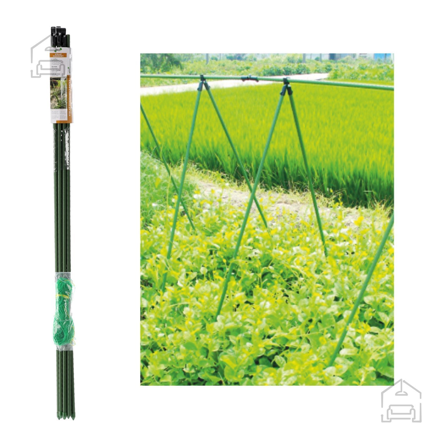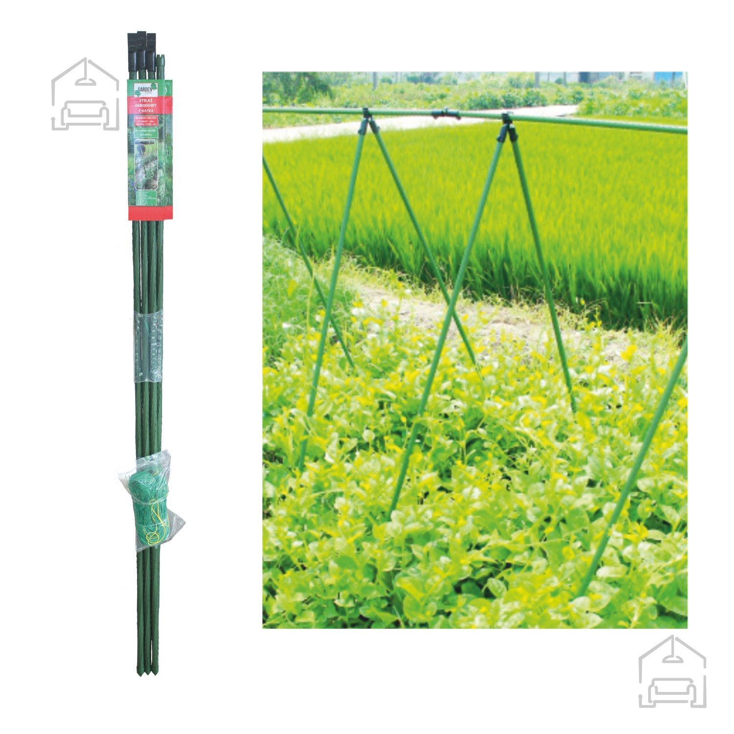Osnova okvirja so cevi s premerom 16 mm, izdelane iz kovine in prevlečene s kakovostno plastiko, ki ščiti pred rjo, UV-žarki in mehanskimi poškodbami. Z dolžino 1,5 m in mrežo velikosti 1,5×2,6 m je izdelek dovolj velik, da podpira več rastlin hkrati, ne da bi se te med seboj zapletale. Zelena barva okvirja se naravno zlije z rastlinjem in vrtno okolico, kar zagotavlja diskreten, a hkrati urejen videz gredic in rastlinjakov. Zaradi svoje oblike je okvir primeren tako za postavitev ob stene, ograje ali gredice kot tudi za uporabo v loncih na terasi.