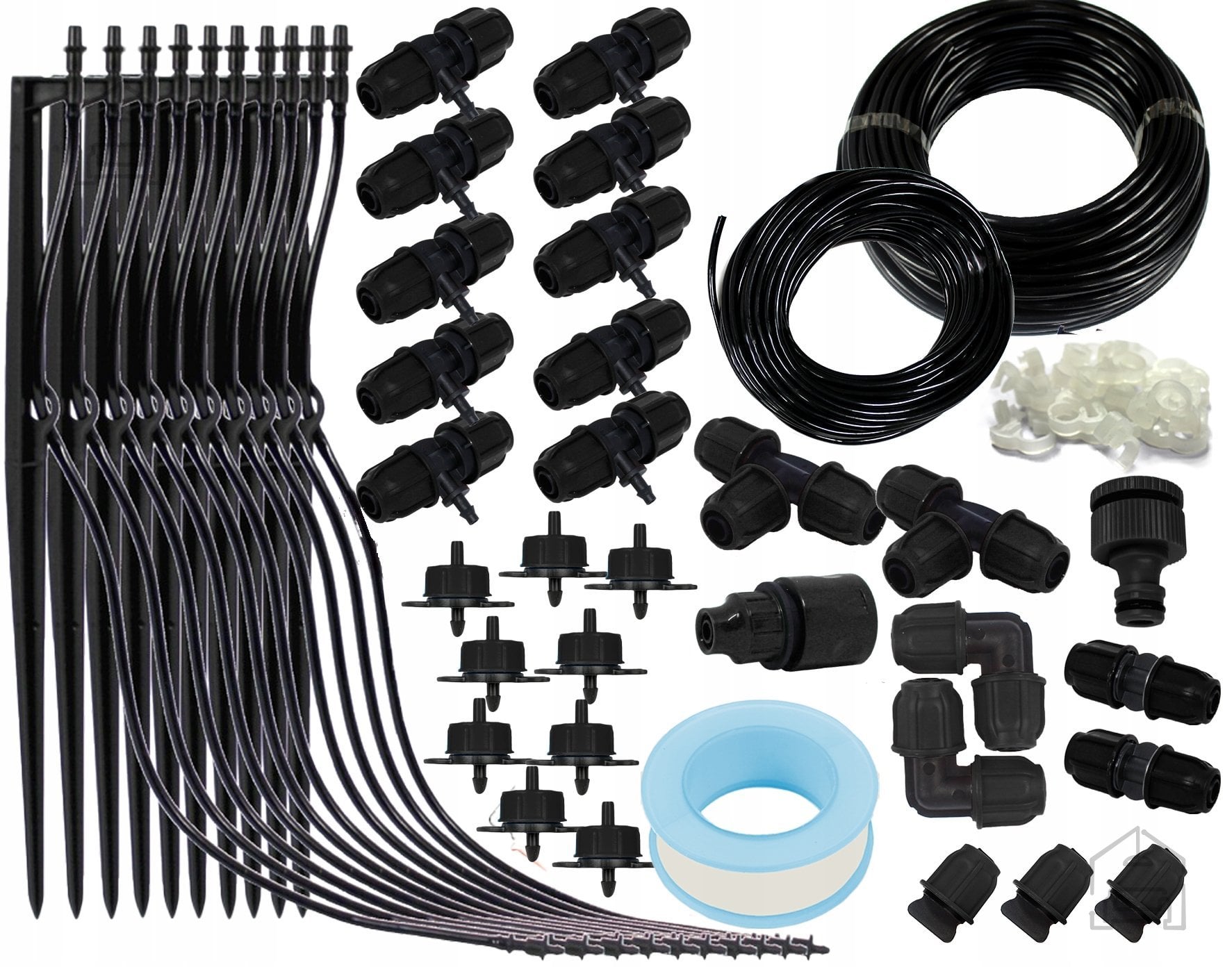 Komplet vsebuje vse potrebne elemente za vzpostavitev celovitega namakalnega sistema na vrtu, gredicah, balkonih ali rastlinjakih. Vključeni so: