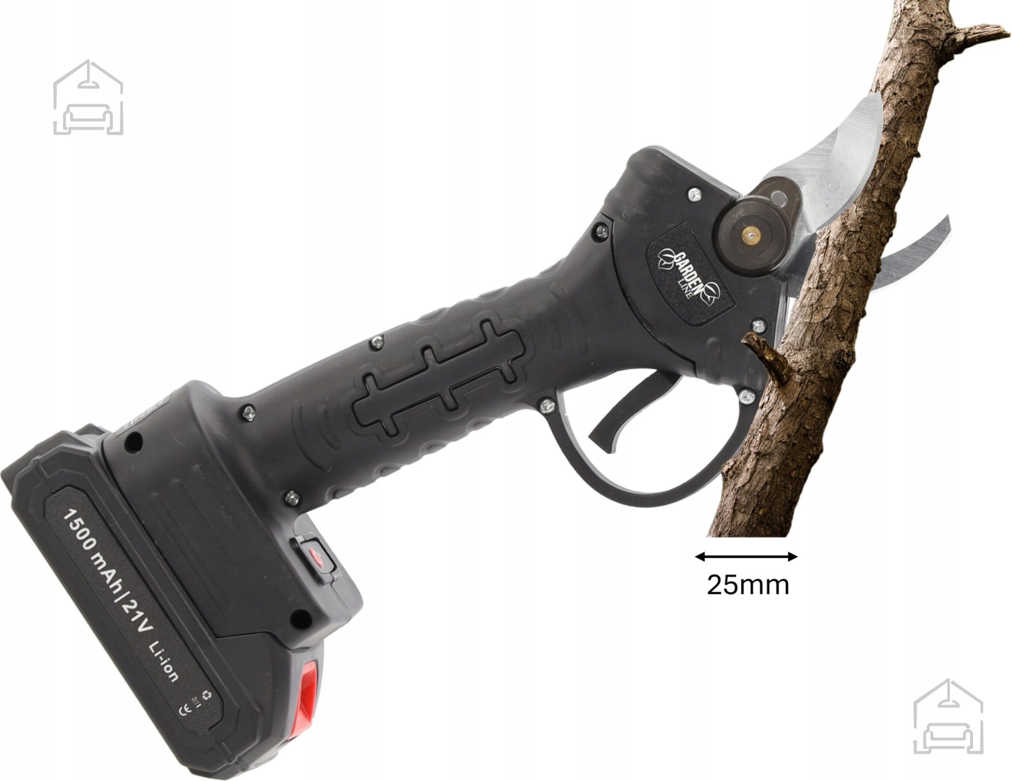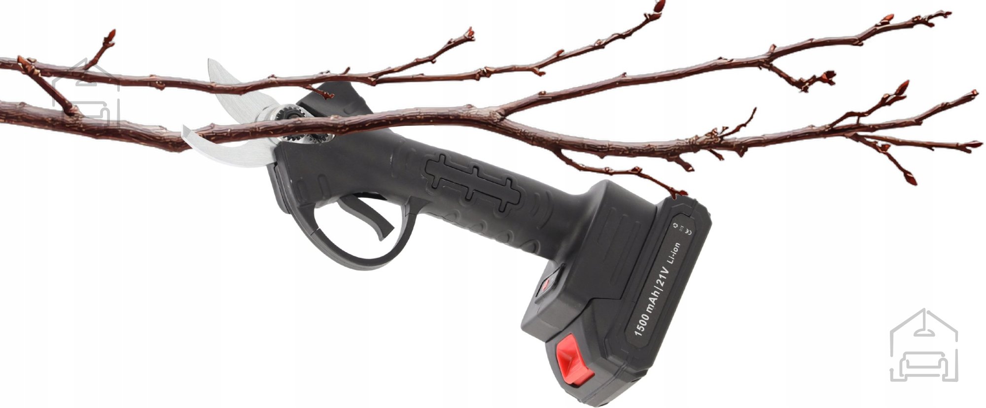 Njena kompaktna konstrukcija (29 × 11 × 6,5 cm) in ergonomsko oblikovan ročaj omogočata udoben oprijem, kar zmanjšuje utrujenost rok tudi pri daljšem delu. Akumulatorski pogon z napetostjo 21 V omogoča popolno svobodo gibanja, saj niste omejeni z dolžino kabla ali dostopom do električne vtičnice. To pomeni, da lahko škarje uporabljate tudi na večjih površinah, v sadovnjaku, vinogradu ali na mestih, kjer elektrika ni na voljo.