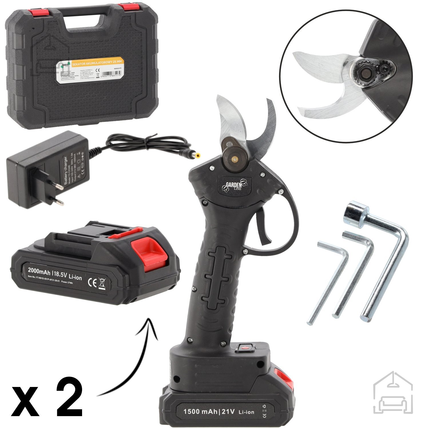 Dvojni komplet baterij je posebej praktičen pri delu na terenu – ena se polni, druga pa napaja škarje, kar omogoča neprekinjen cikel dela. Kompaktna škatla varuje orodje pred prahom, vlago in mehanskimi poškodbami ter omogoča urejeno shranjevanje vseh delov na enem mestu.