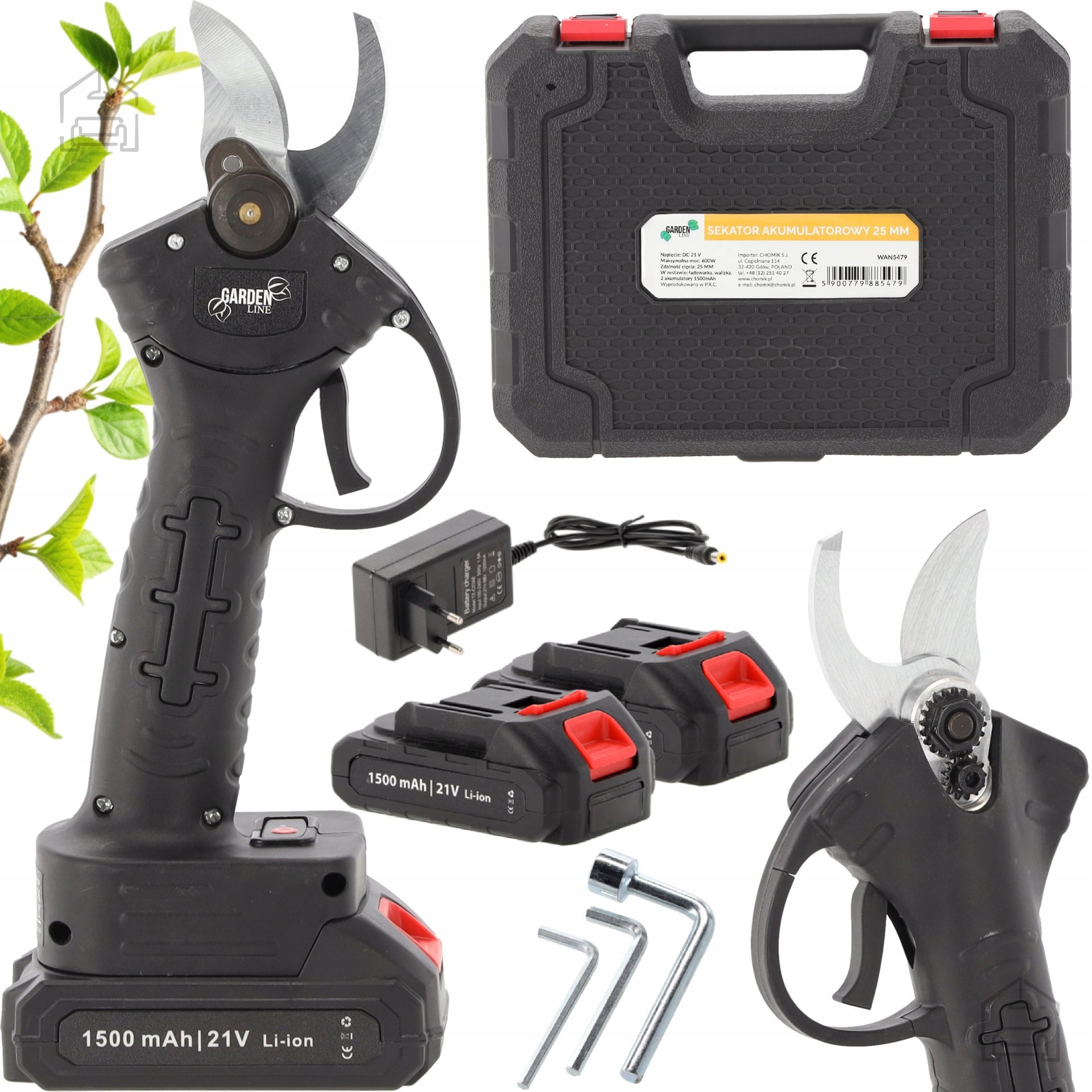 Akumulatorske škarje Chomik 21V 25mm so izjemna izbira za vse, ki cenijo kakovost, učinkovitost in enostavno uporabo. Z njimi boste hitro in brez napora poskrbeli za urejen videz grmovnic, dreves in okrasnih rastlin. Naprava združuje moč profesionalnega orodja in udobje, primerno za domačo uporabo. Poljski proizvajalec Chomik je znan po zanesljivih in cenovno dostopnih rešitvah, ki združujejo tehnološko naprednost in praktično uporabnost.