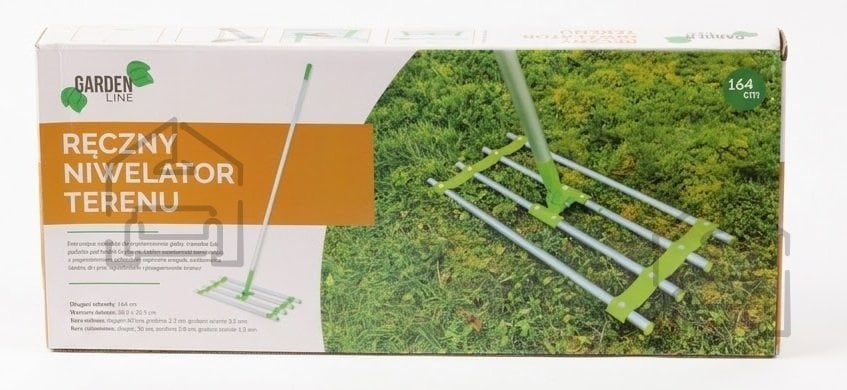 Skupne dimenzije nivelirja so 60,5 × 25,5 × 164 cm, kar zagotavlja široko delovno površino, s katero lahko enakomerno porazdelite zemljo ali pesek. Glava orodja meri 60,5 × 25,5 cm, kar omogoča učinkovito vlečenje in razporejanje materiala. Konstrukcija je sestavljena iz dveh osnovnih cevi: