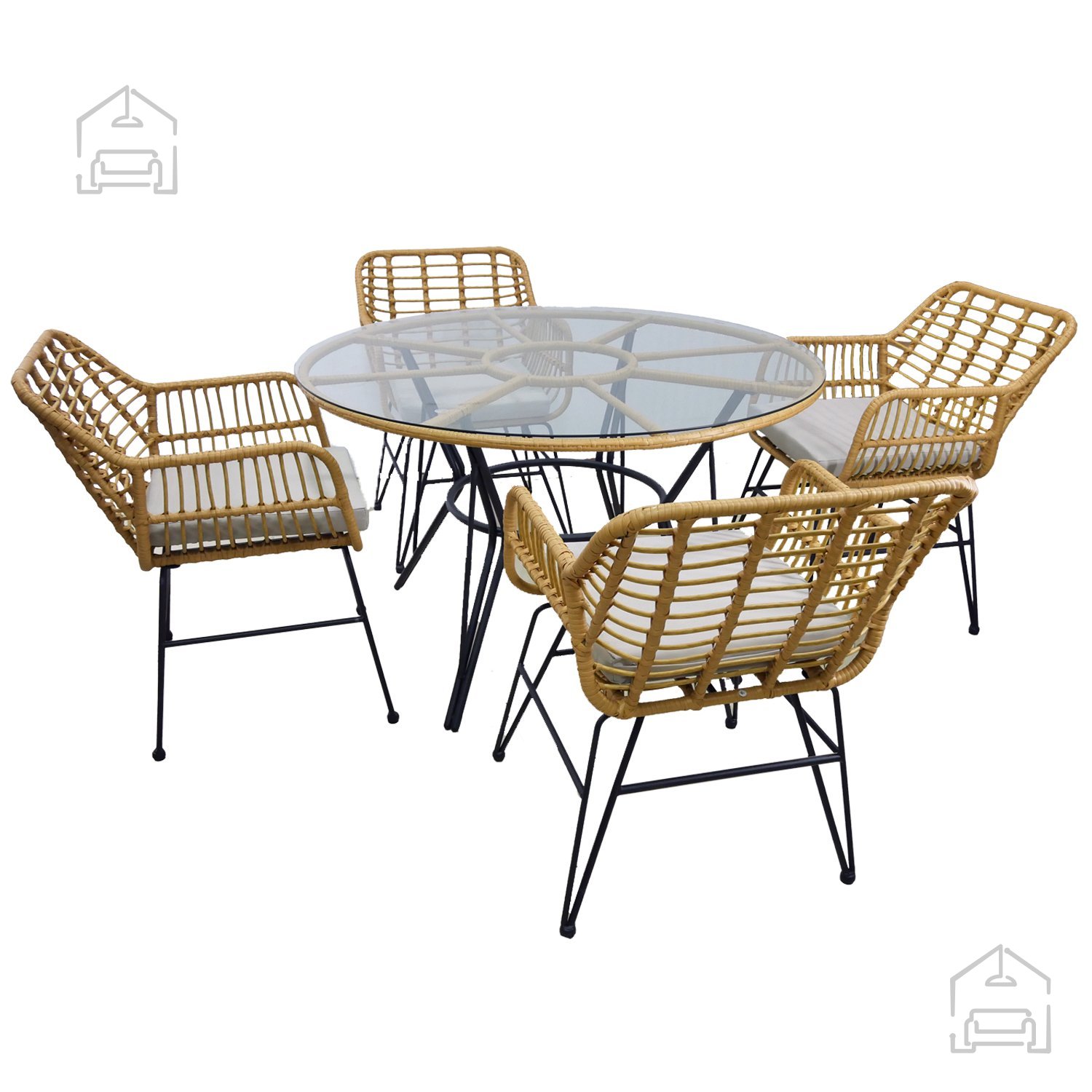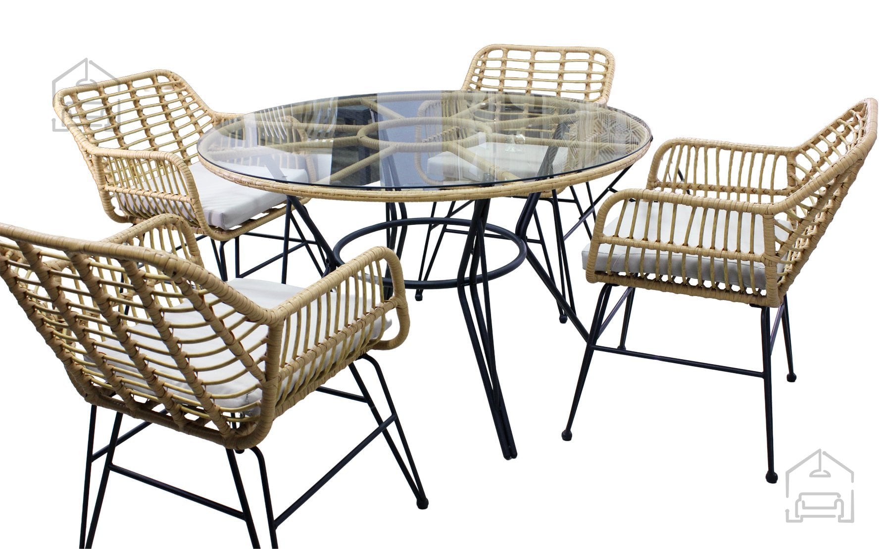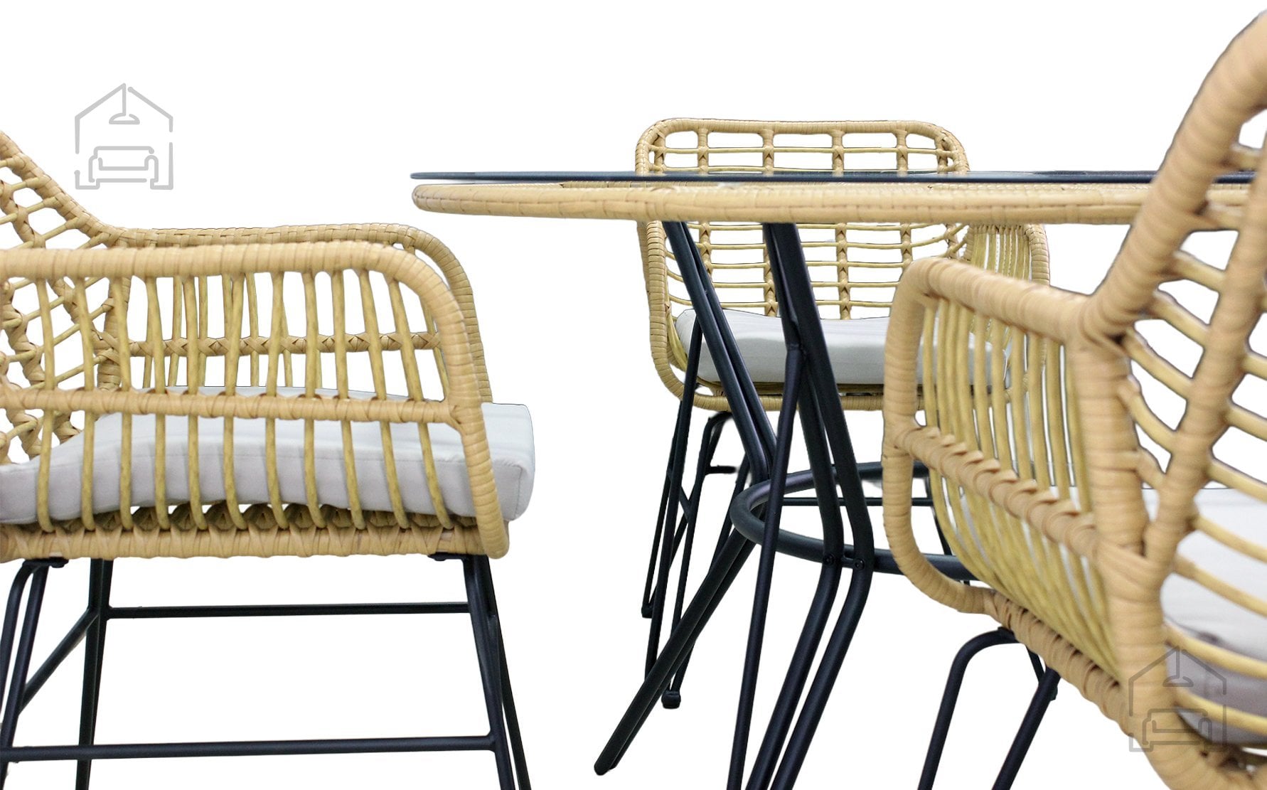 Ogrodje garniture je izdelano iz pocinkanega jekla, kar pomeni dodatno zaščito pred korozijo in stabilnost tudi pri pogosti uporabi na prostem. Površina iz technoratana je odporna na UV-žarke in vremenske vplive, zato material ne zbledi in ne poka po dolgotrajni izpostavljenosti soncu ali vlagi. Kombinacija ravnega in okroglega pletenja daje kompletu sodoben videz ter mehko, prijetno teksturo na dotik. Miza je opremljena s prozorno ploščo iz kaljenega stekla debeline 5 mm, ki je enostavna za čiščenje in odporna proti praskam. Takšna konstrukcija zagotavlja stabilnost in varnost med uporabo.