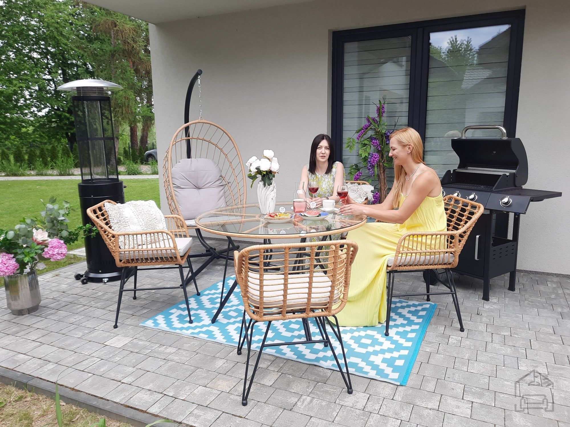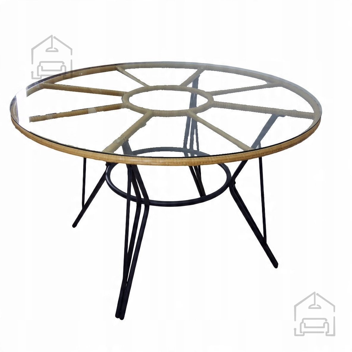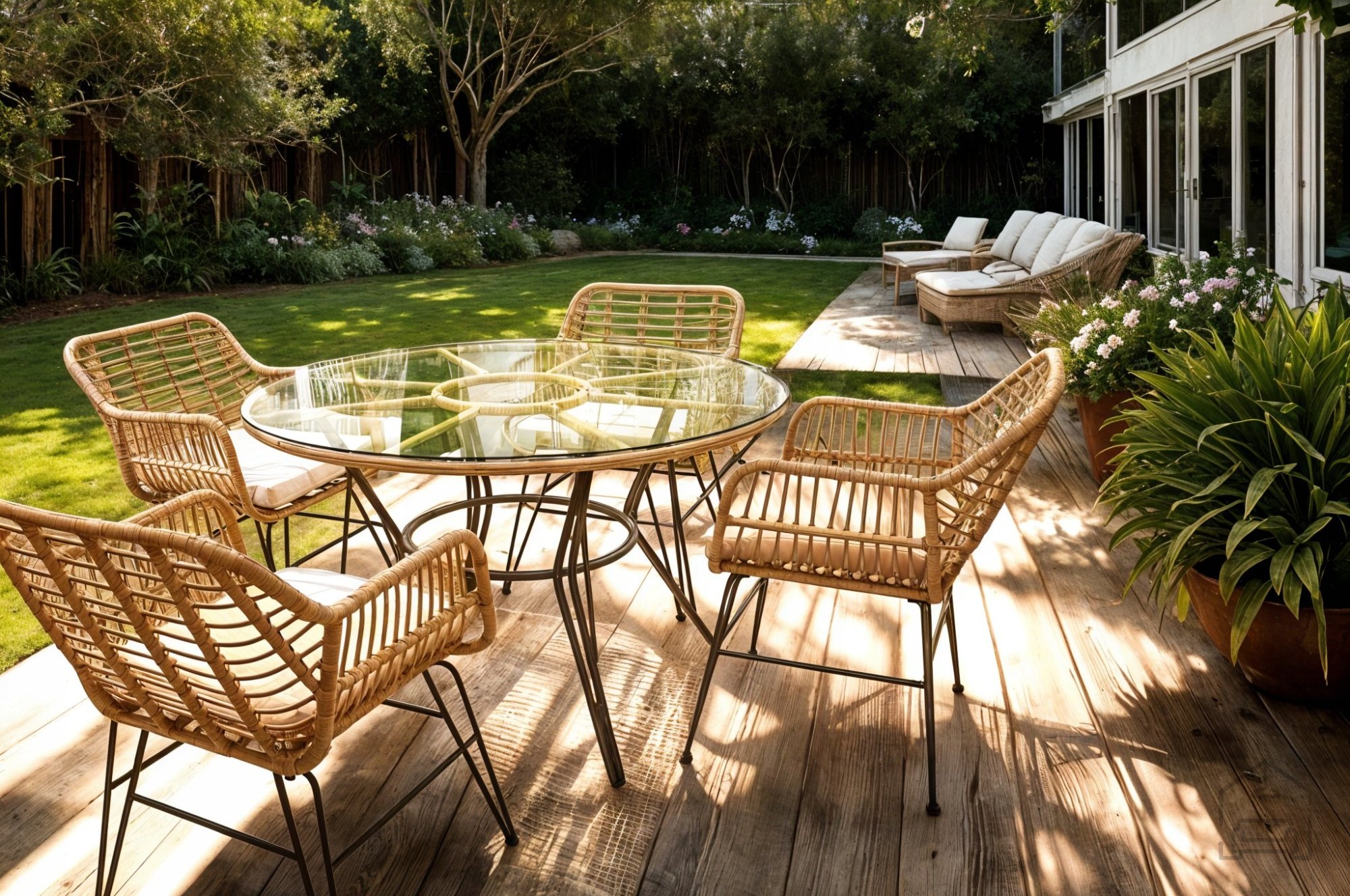 Ogrodje garniture je izdelano iz pocinkanega jekla, kar pomeni dodatno zaščito pred korozijo in stabilnost tudi pri pogosti uporabi na prostem. Površina iz technoratana je odporna na UV-žarke in vremenske vplive, zato material ne zbledi in ne poka po dolgotrajni izpostavljenosti soncu ali vlagi. Kombinacija ravnega in okroglega pletenja daje kompletu sodoben videz ter mehko, prijetno teksturo na dotik. Miza je opremljena s prozorno ploščo iz kaljenega stekla debeline 5 mm, ki je enostavna za čiščenje in odporna proti praskam. Takšna konstrukcija zagotavlja stabilnost in varnost med uporabo.