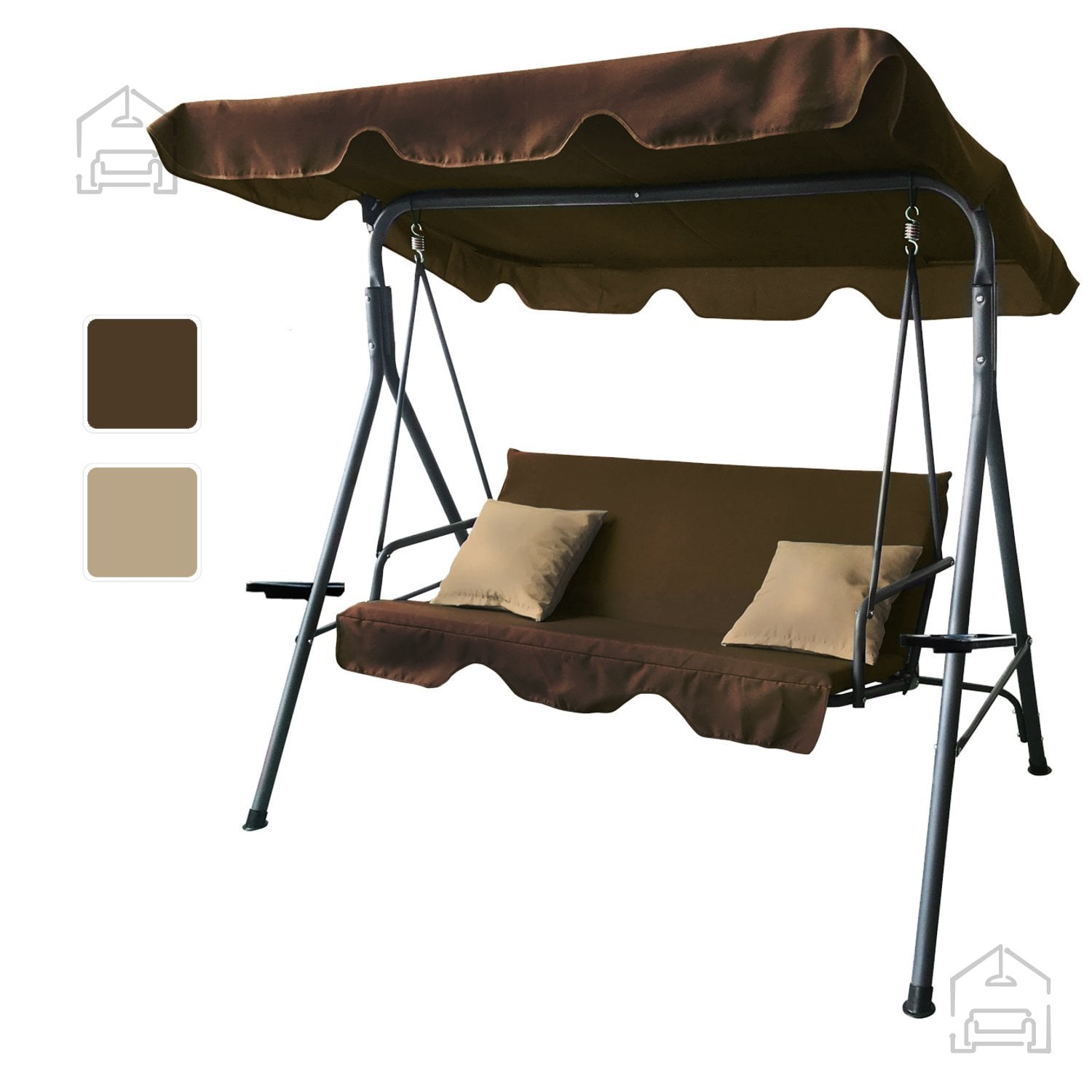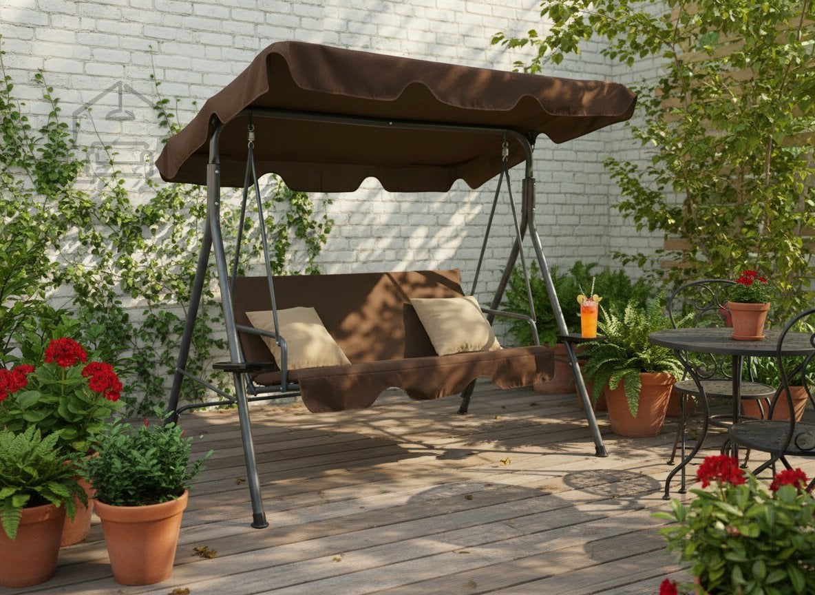 Kombinacija rjave konstrukcije in bež blazin daje gugalnici klasičen, a hkrati sodoben videz, ki se lepo poda k različnim slogom zunanje opreme – od rustikalnega vrta do minimalistične terase. Nevtralne barve omogočajo enostavno kombiniranje z drugimi vrtnimi kosi, kot so mize, ležalniki ali senčniki. Zaradi uravnoteženih tonov se gugalnica harmonično zlije z naravnim okoljem in ne izstopa, hkrati pa doda pridih elegance vsakemu prostoru.