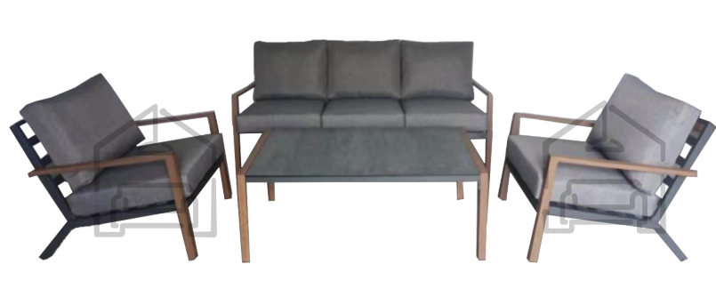 Osnova kompleta je izdelana iz trpežnega aluminija, ki je prašno lakiran v sivi barvi. Takšna obdelava ne zagotavlja le estetskega videza, ampak tudi dodatno zaščito pred korozijo in UV-žarki. Aluminij je lahek, a hkrati izjemno stabilen material, zato je komplet enostaven za premikanje, ne da bi pri tem izgubil svojo trdnost ali obliko. Sodobne ravne linije poudarjajo minimalističen slog, ki se ujema tako s sodobnimi kot klasičnimi zunanjimi ambienti.