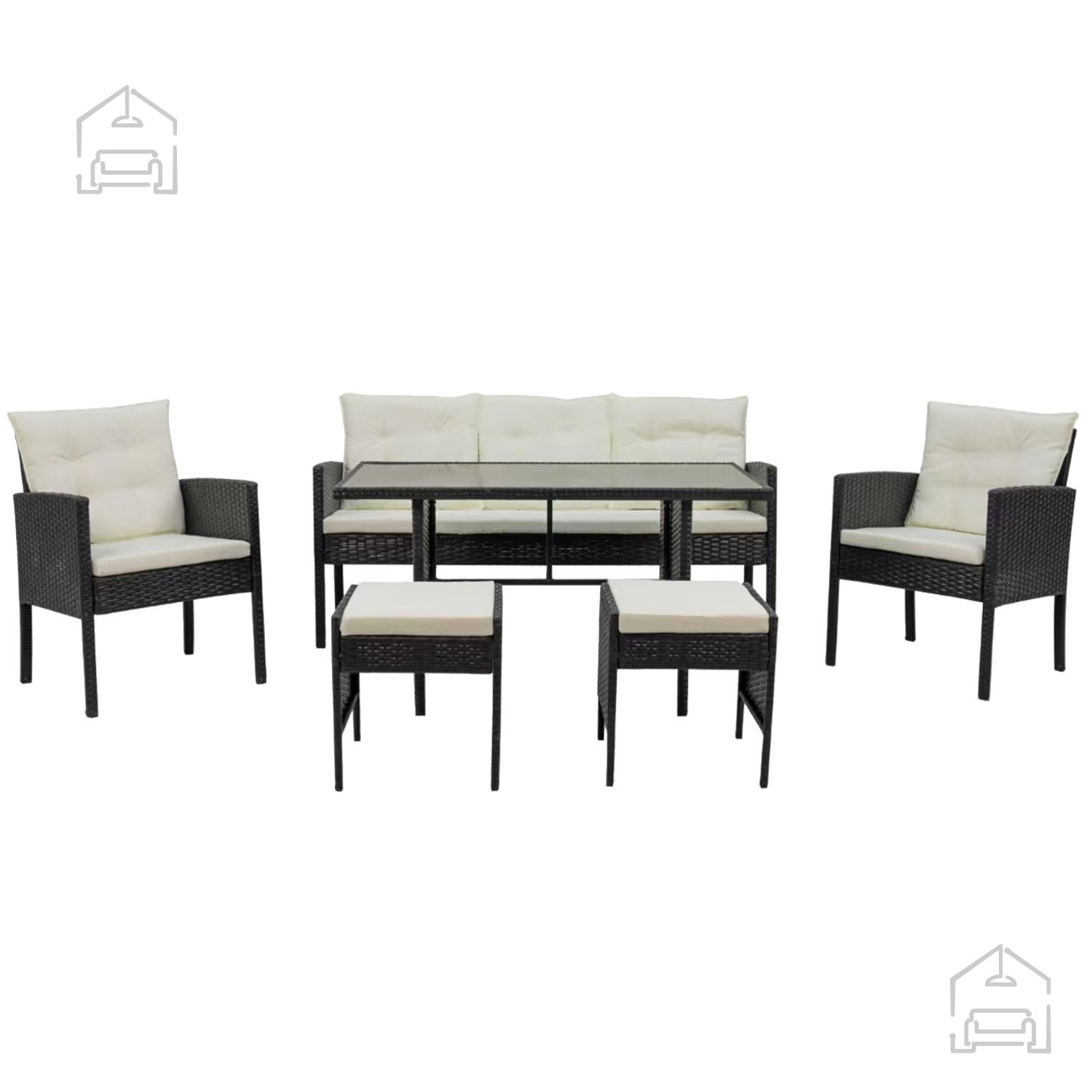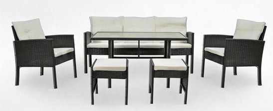 Vse sedežne površine in nasloni so opremljeni z blazinami iz poliestra, ki imajo snemljive prevleke z zadrgo. Debelina blazin znaša 5 cm pri sedežih in 7 cm pri naslonih, kar zagotavlja mehko, a stabilno sedenje. Kremna barva blazin lepo dopolnjuje črno strukturo ratana in dodaja garnituri vizualno toplino. Prevleke je mogoče enostavno odstraniti in oprati, kar omogoča hitro osvežitev videza po sezoni ali po daljši uporabi.