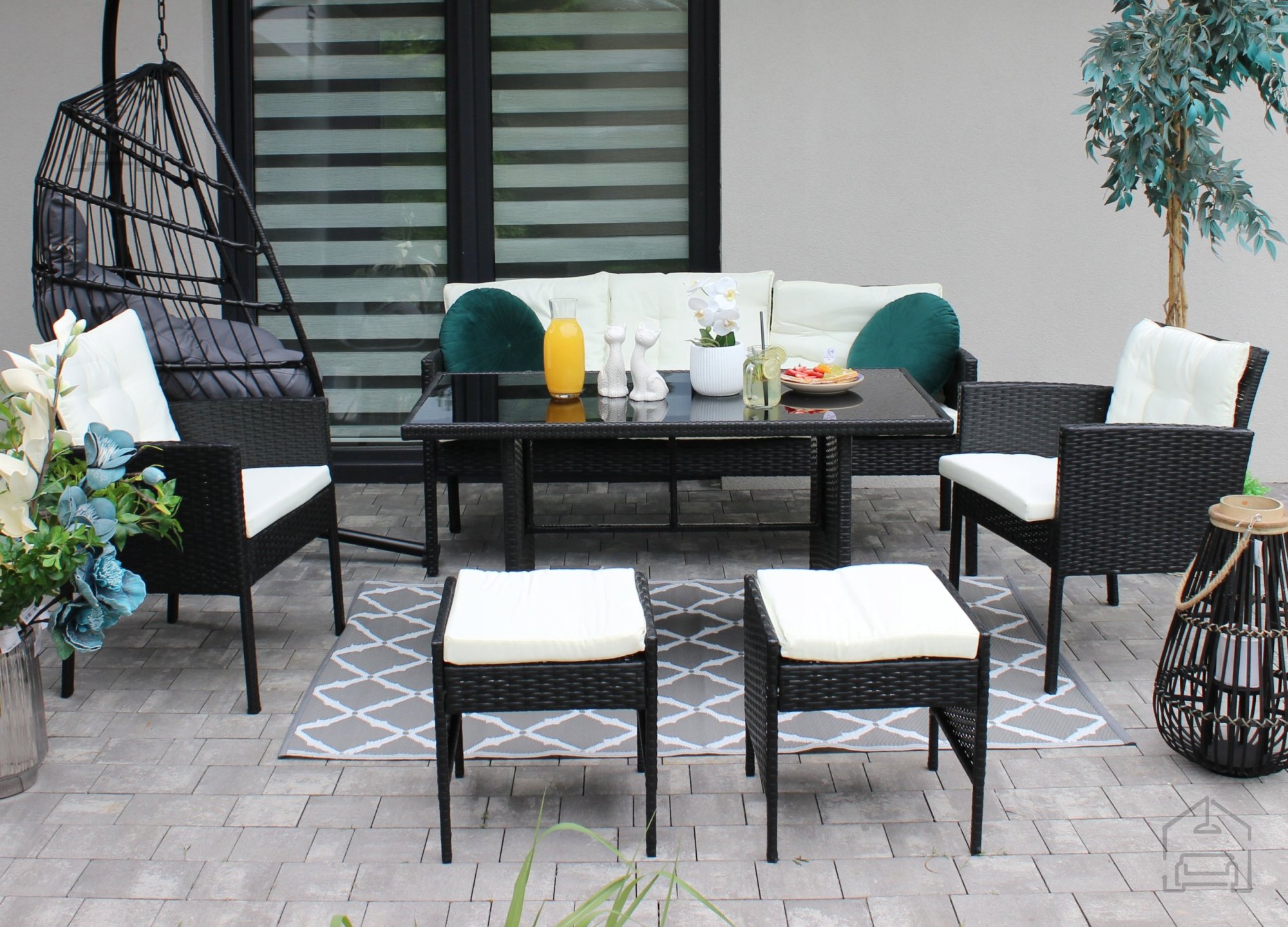 Če iščete vrtno garnituro, ki združuje sodoben dizajn, udobje in trpežnost, je Chomik Vaduz prava izbira. S svojo elegantno črno barvo, kremnimi detajli in premišljeno konstrukcijo bo postala osrednji kos vašega zunanjega prostora, ki vabi k sprostitvi in druženju v vseh letnih časih.