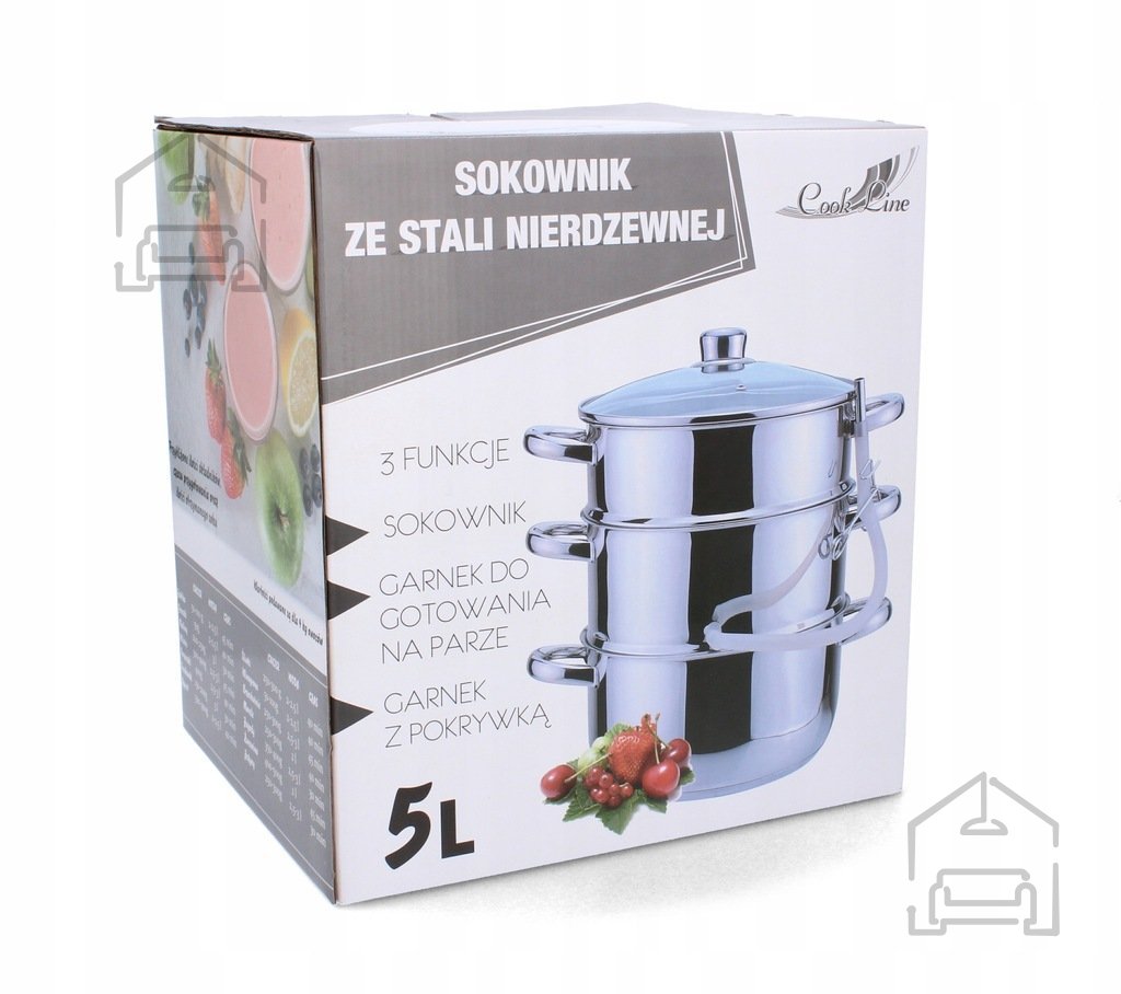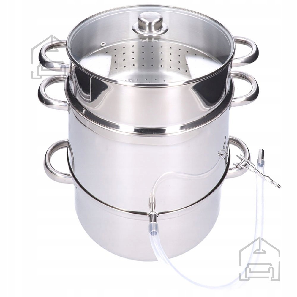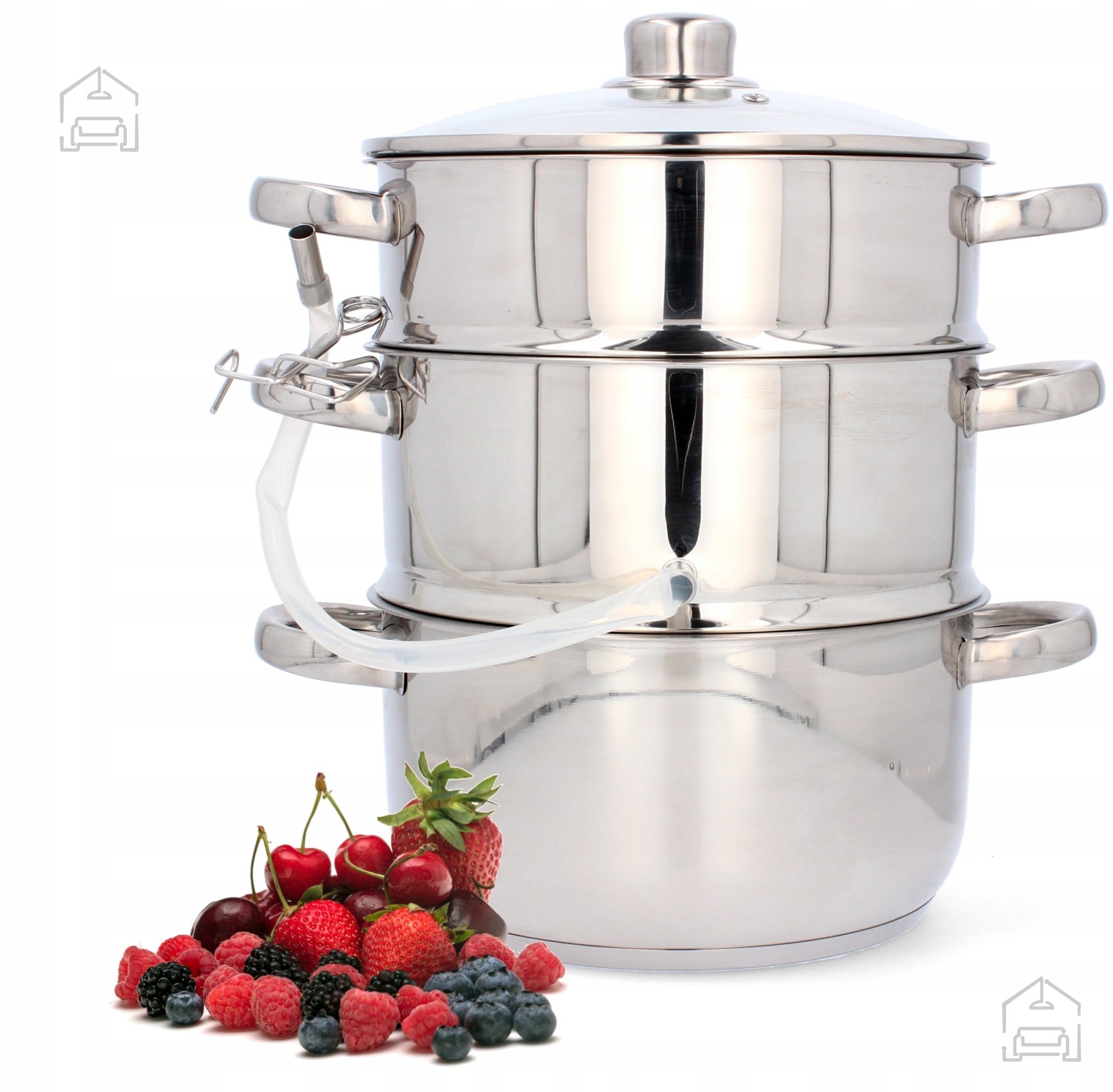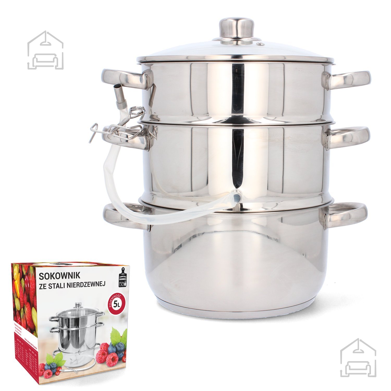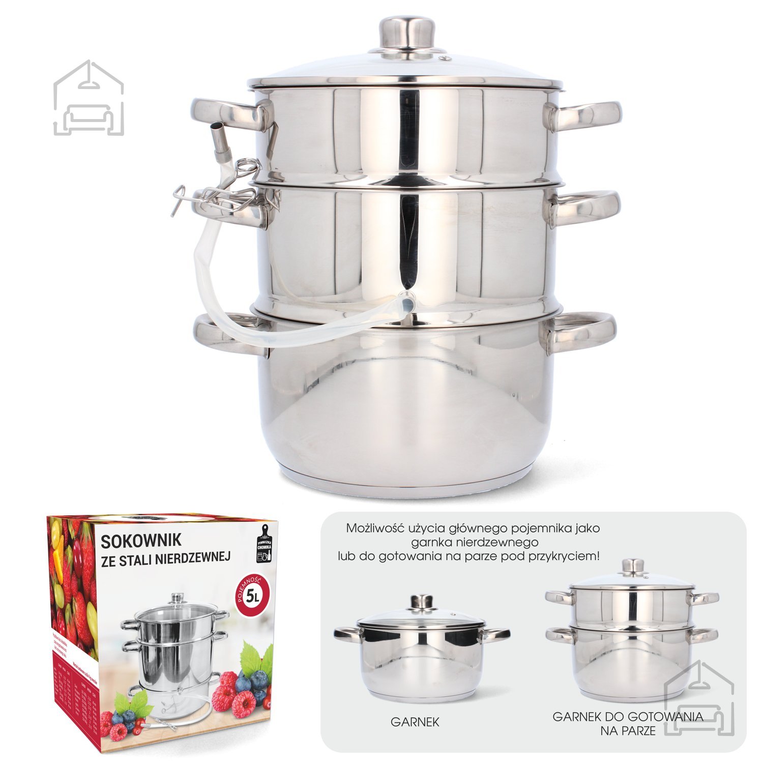 Sokovnik nerjaven 5 l 3v1 znamke Chomik združuje tri uporabne funkcije v enem elegantnem in trpežnem izdelku. Zaradi prostornine 5 litrov in premera 23 cm omogoča pripravo večjih količin sadnega soka, kuhanje na pari ali uporabo kot navadnega lonca s pokrovom. Izdelan je iz visokokakovostnega nerjavnega jekla s posebnim večplastnim dnom, ki zagotavlja enakomerno porazdelitev toplote ter učinkovito in varno uporabo na različnih vrstah kuhalnih plošč. Poljski proizvajalec Chomik je znan po kombinaciji tradicionalne obrti in sodobne tehnologije, kar se jasno odraža v vsakem detajlu tega sokovnika.