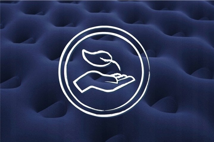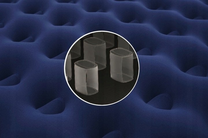 Osnova vzmetnice je izdelana iz visokokakovostnega vinila, ki je znan po svoji odpornosti proti poškodbam in deformacijam. Material je dovolj debel, da prenese vsakodnevno uporabo, hkrati pa ostaja lahek za prenašanje. Zgornja plast iz mehkega velurja pa zagotavlja prijeten dotik in preprečuje drsenje rjuhe. Takšna kombinacija materialov omogoča, da vzmetnica ohranja svojo obliko in udobje tudi po večkratnem napihovanju in praznjenju. Površina se enostavno čisti z vlažno krpo, kar olajša vzdrževanje.