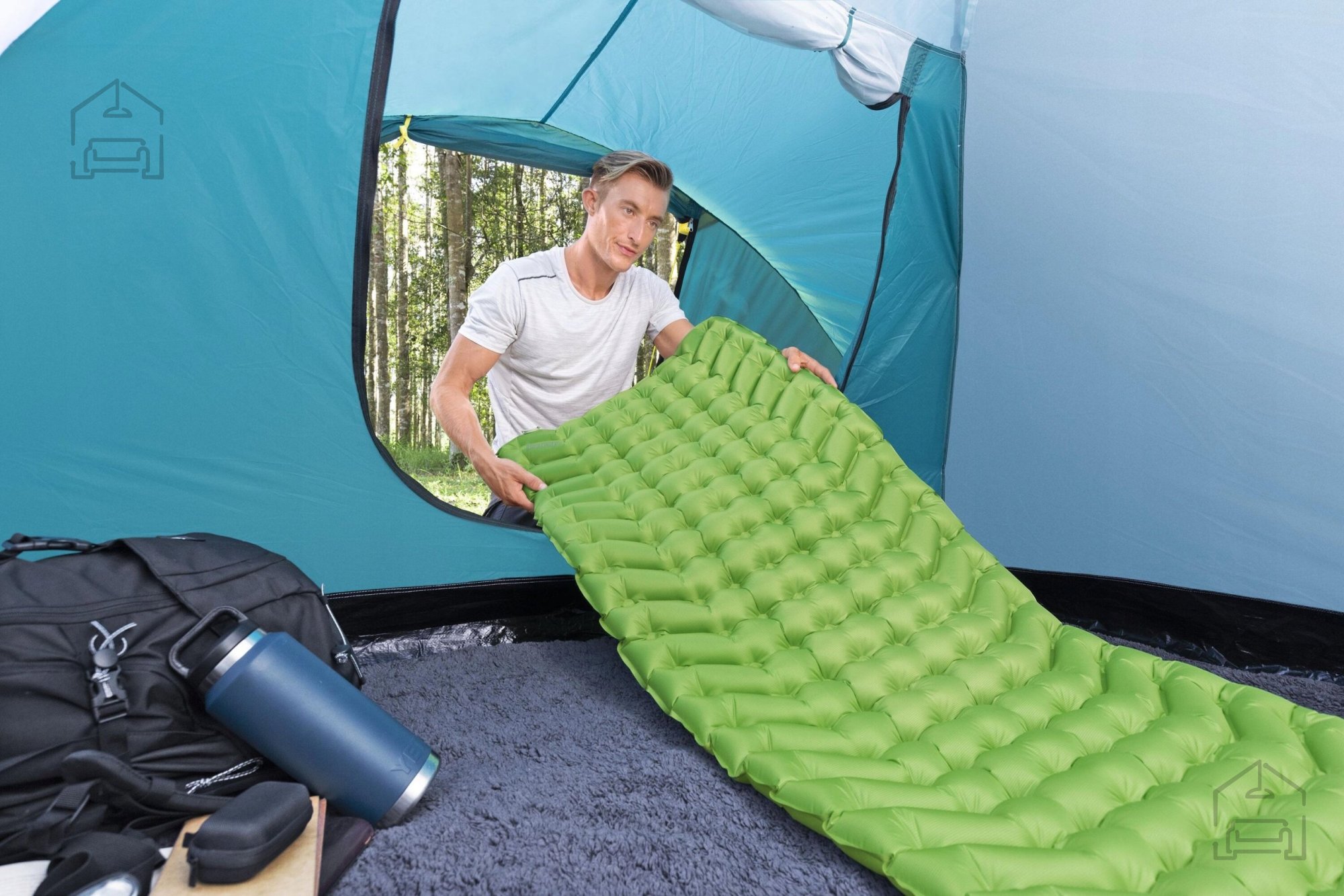 Podloga za kampiranje – BES69615 je napihljiva potovalna blazina, izdelana za tiste, ki cenijo udobje, kompaktnost in zanesljivost v naravi. Zasnovana je za kampiranje, pohodništvo in potovanja, kjer je vsaka podrobnost pomembna. Njena najlonska tkanina ripstop 70D zagotavlja izjemno trpežnost in odpornost proti trganju, hkrati pa ohranja nizko težo in enostavno prenosljivost. Konstrukcija CrossWing™ z zračnimi žepi proti drsenju ustvarja stabilno ležišče, ki se prilagaja telesu in preprečuje neželene premike med spanjem. S svojo zeleno barvo se lepo zlije z naravnim okoljem, hkrati pa ostaja elegantno subtilna.