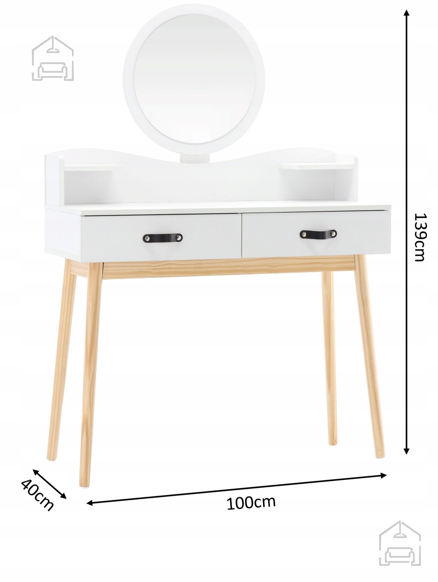 Ker ima mizica kompaktno zasnovo in čiste linije, se zlahka prilagodi različnim prostorskim razmeram in slogom pohištva. Lahko jo dopolnite z elegantnim stolčkom z oblazinjenim sediščem ali minimalističnim taburejem, ki bo poskrbel za udobje med nego obraza ali nanosom ličil. Zaradi višine 139 cm ogledalo sega v idealno višino za sedenje, kar pomeni, da bo vsakodnevna uporaba prijetna in ergonomsko pravilna. Površina mizne plošče je dovolj široka (100 cm), da omogoča udobno razporeditev pripomočkov, medtem ko globina 40 cm zagotavlja stabilnost in varno postavitev tudi v ožjih prostorih.