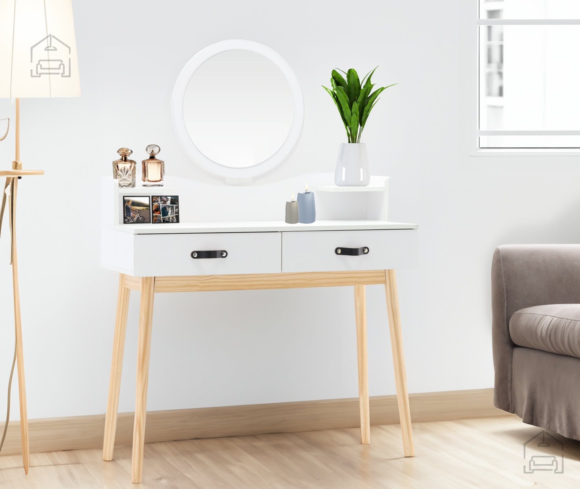 Elegantna in funkcionalna toaletna mizica znamke Chomik je ustvarjena za vse, ki cenijo preprost, a izpopolnjen dizajn in želijo v svojem domu ustvariti kotiček za nego, ličenje ali urejanje vsakodnevnih detajlov. Kombinacija belega laka in detajlov v svetlem lesu v prostor vnese občutek svežine, svetlobe in nežne elegance. Zahvaljujoč premišljenim dimenzijam 100 × 40 × 139 cm se mizica odlično prilega tako večjim spalnicam kot manjšim garderobam ali celo sodobnim kopalnicam, kjer je prostor omejen, a stil pomemben.
