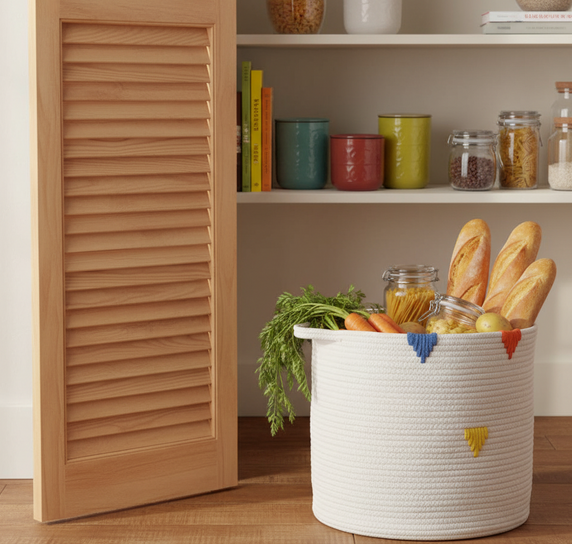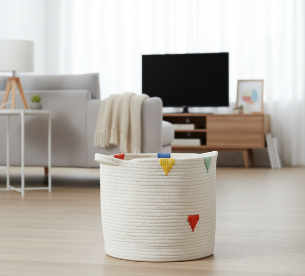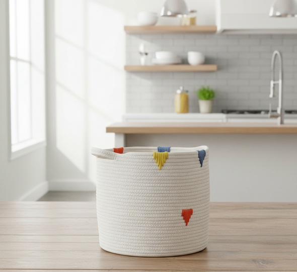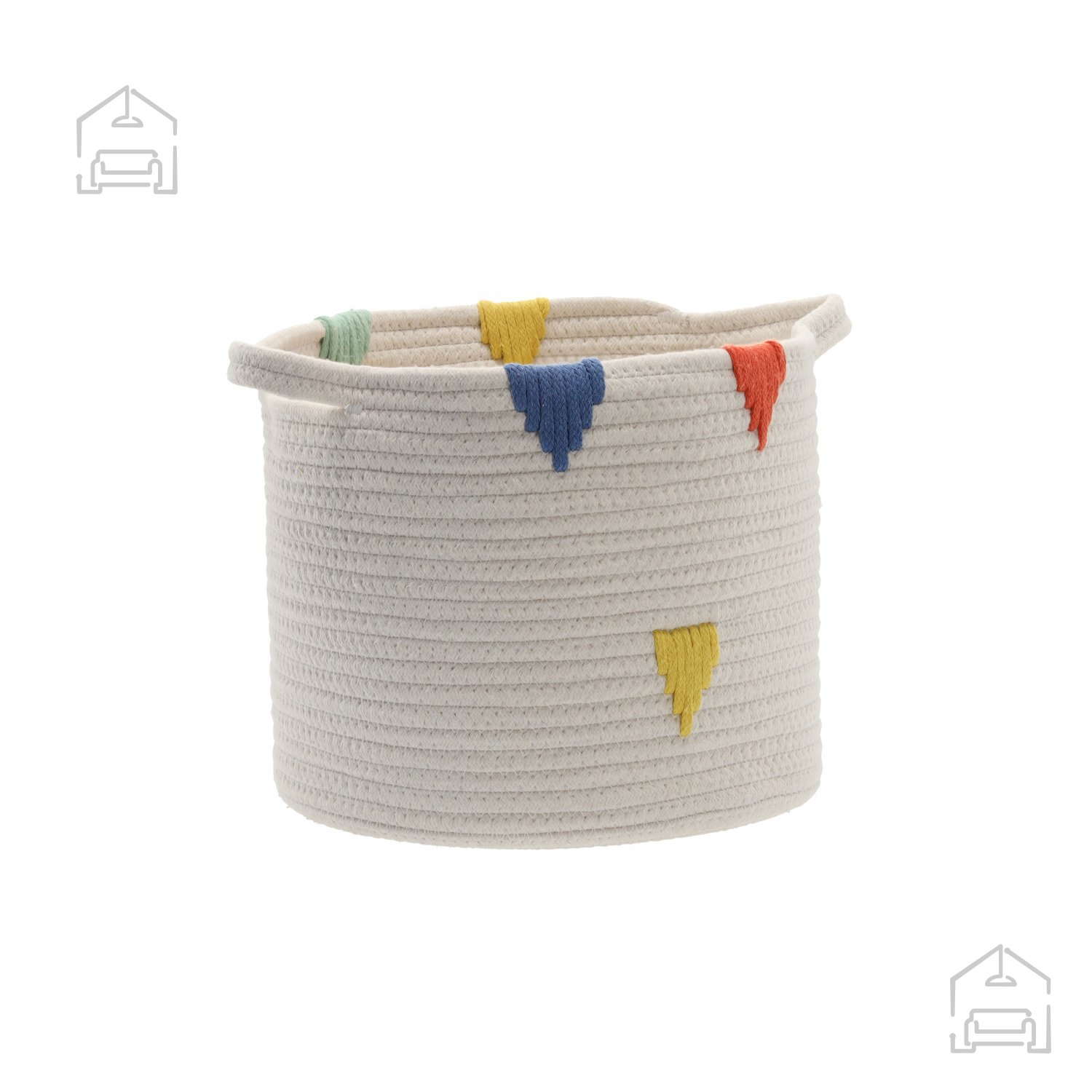 Kombinacija bele barve in barvnega vzorca prinaša svežino in toplino v prostor. Takšen dizajn je primeren tako za minimalistično kot za bolj igrivo notranjo opremo. Koš se lepo dopolnjuje z naravnimi materiali, kot so les ali tkanine v nevtralnih tonih, hkrati pa lahko deluje kot barvni poudarek v prostoru. Zaradi svoje nevtralne osnovne barve se zlahka kombinira z drugimi dodatki, kot so tekstil, preproge ali dekorativne škatle.