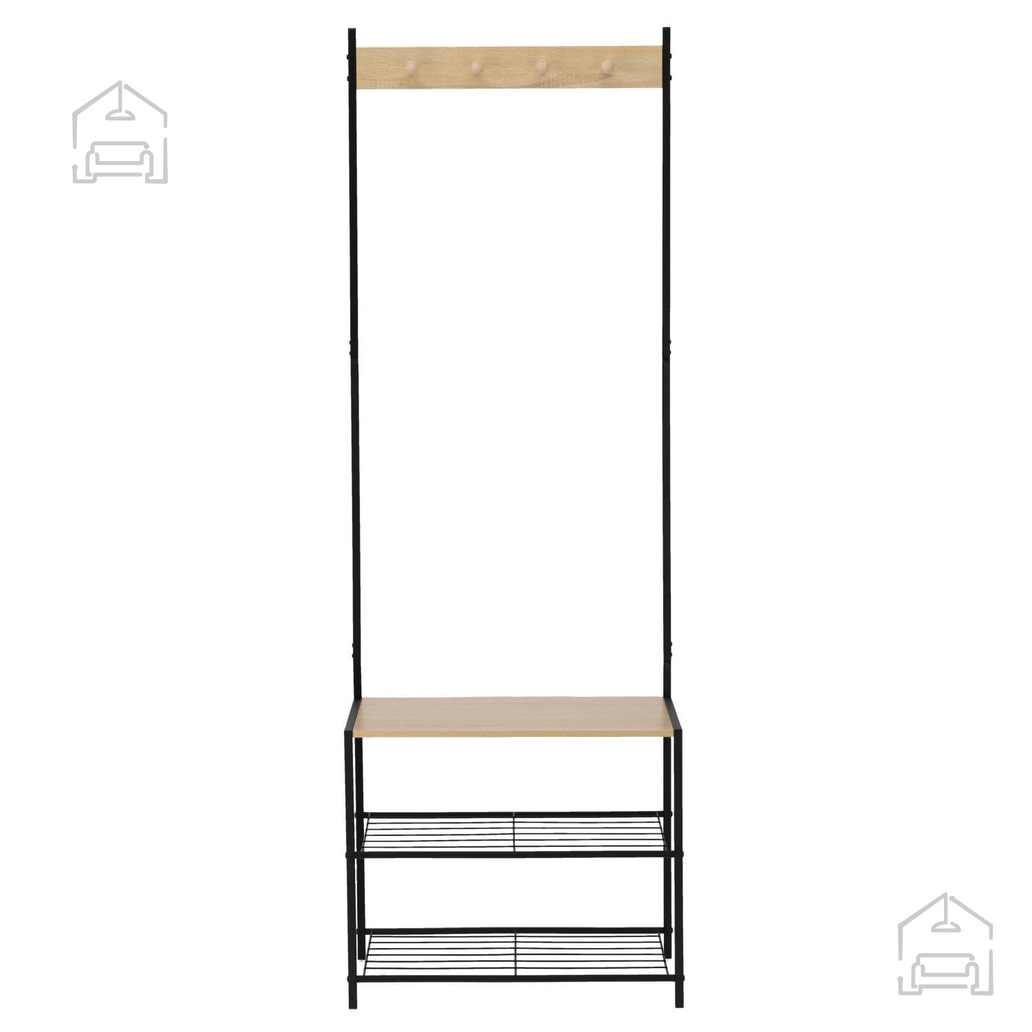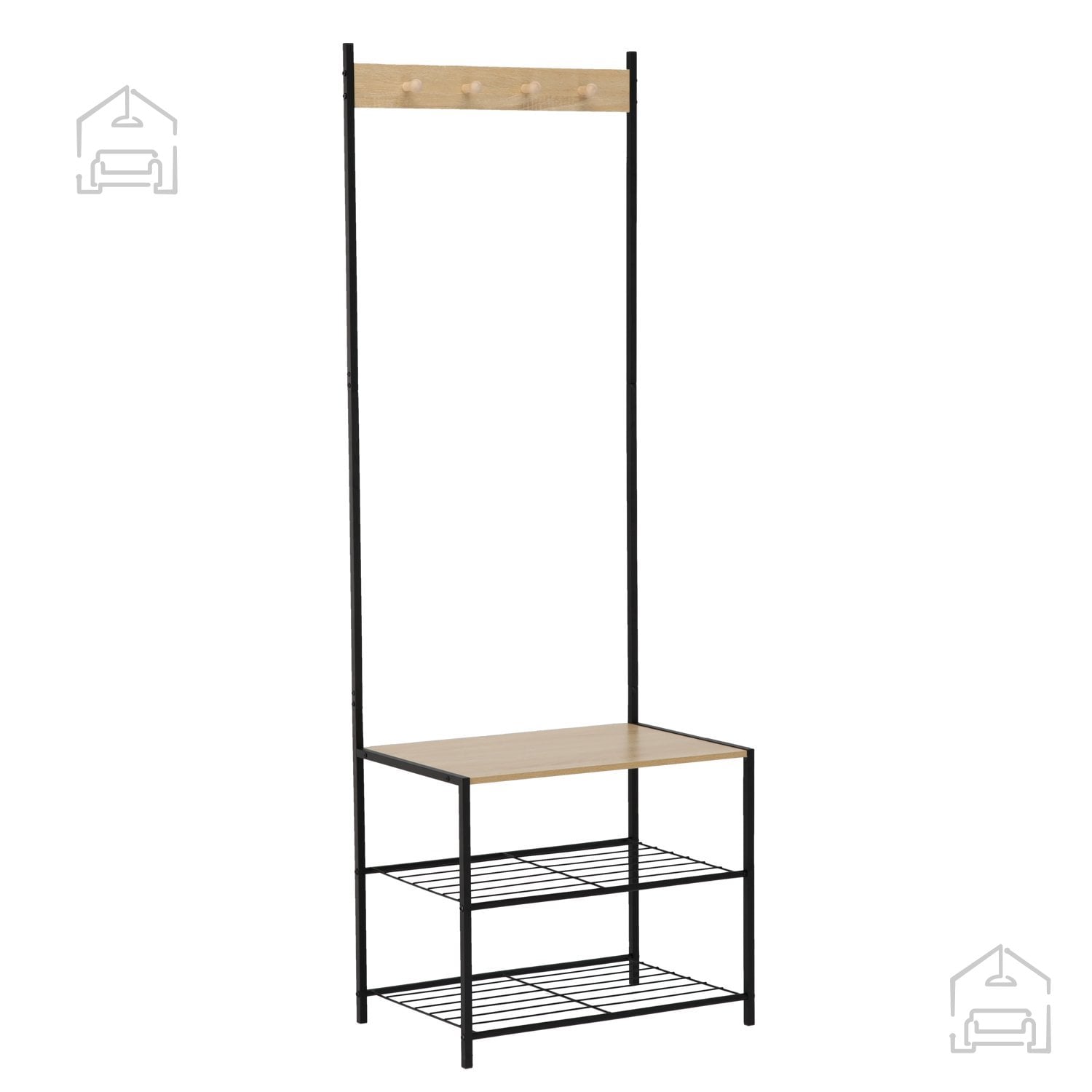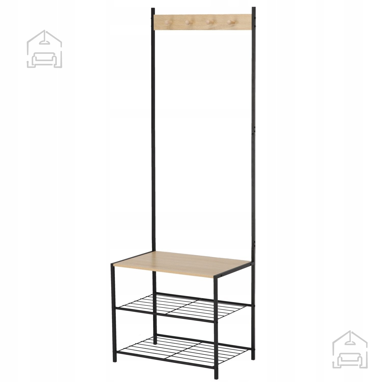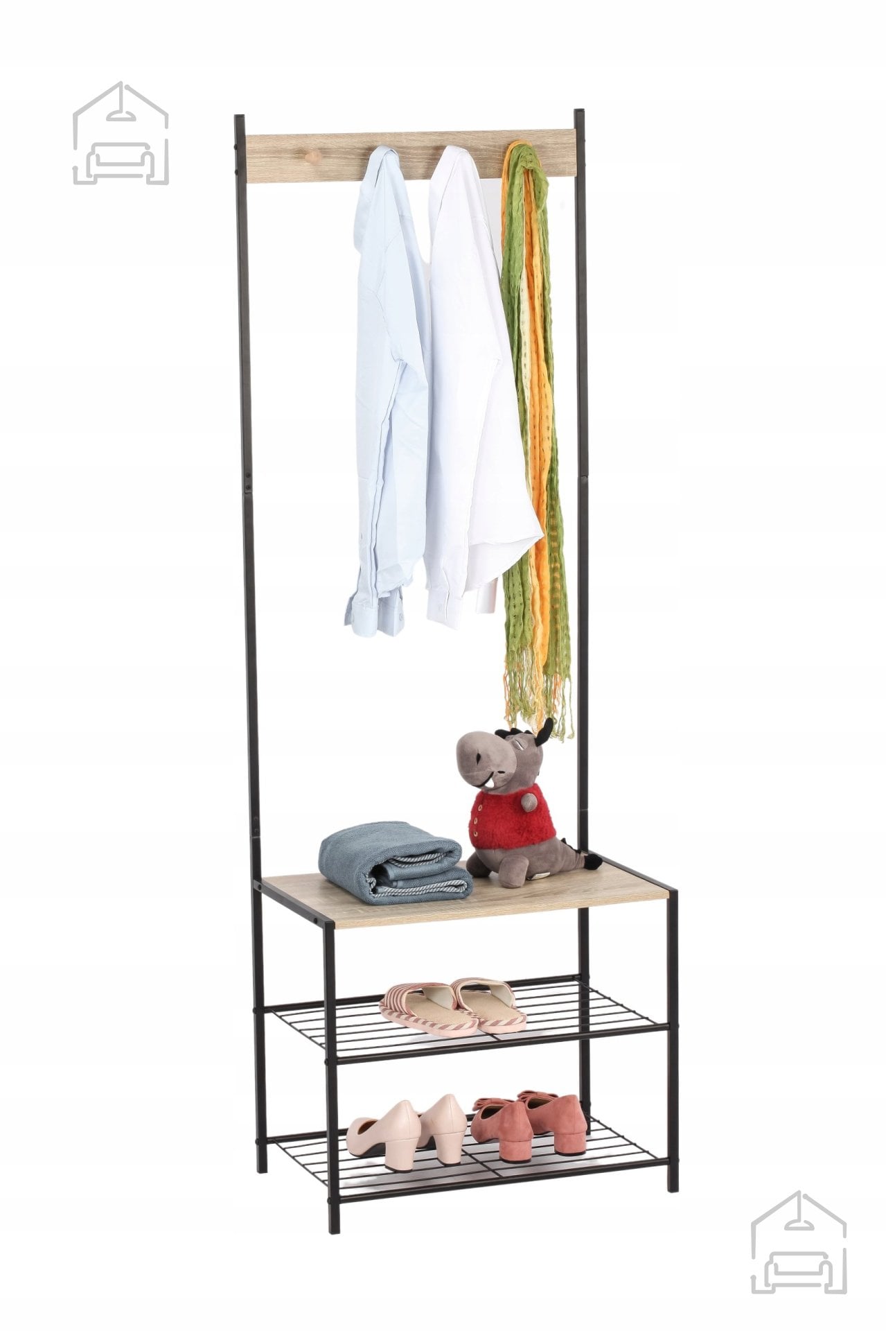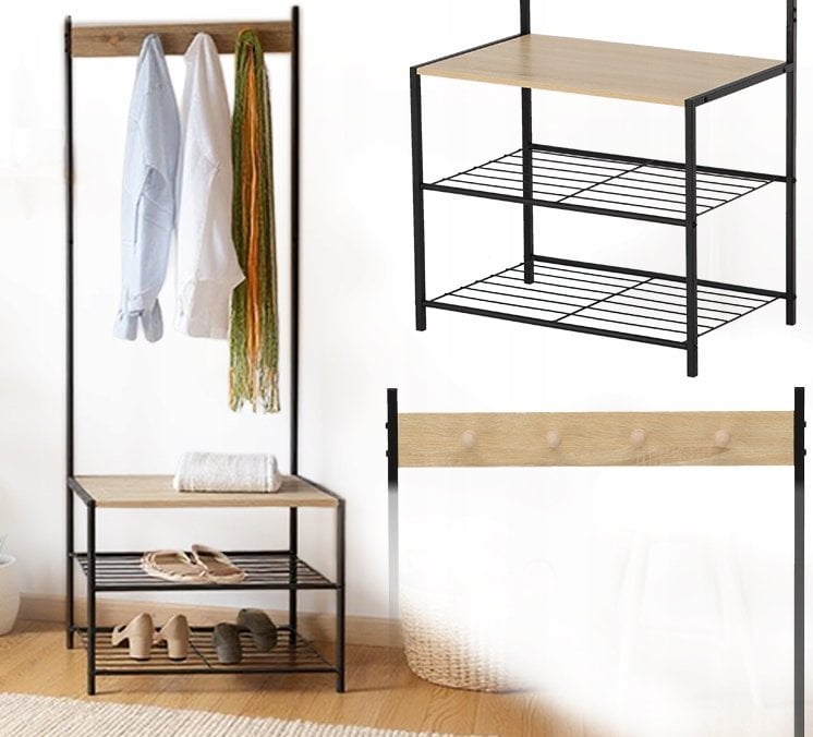 Stojalo z 3 policami *1173 znamke Chomik združuje prefinjen dizajn in praktičnost, ki ju pričakujemo od sodobnega pohištva. Njegova samostoječa zasnova omogoča enostavno postavitev brez vrtanja v stene, kar pomeni, da ga lahko po želji premaknete in prilagodite razporeditvi prostora. S svojo višino 175 cm in uravnoteženimi merami 60 × 40 cm nudi več kot dovolj prostora za odlaganje in obešanje vsakodnevnih predmetov. Štirje kovinski kavlji omogočajo priročno shranjevanje plaščev, jaken, klobukov ali torbic, medtem ko tri police ponujajo prostor za čevlje, škatle, modne dodatke ali dekorativne elemente.