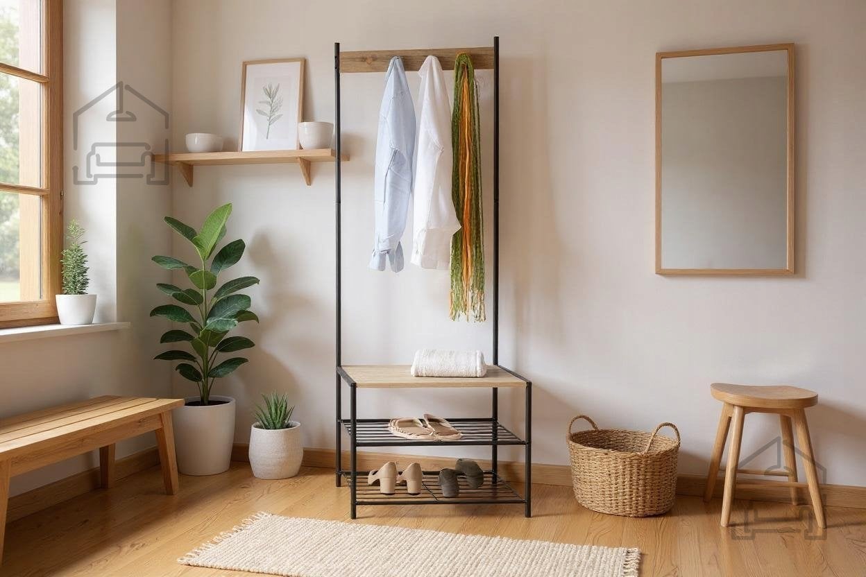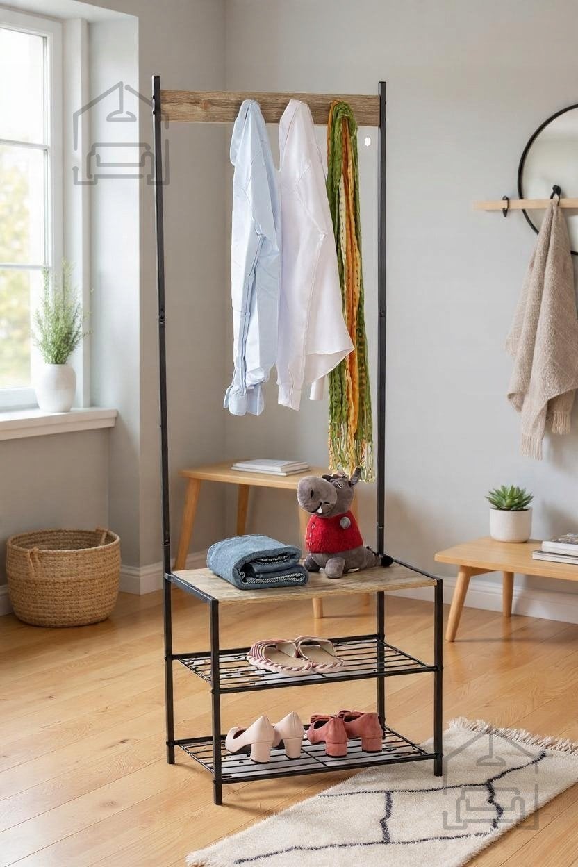Stojalo Chomik je zasnovano tako, da združuje več funkcij v enem kosu pohištva. V predsobi lahko služi kot priročen obešalnik za plašče in torbe, v garderobi kot dodaten prostor za čevlje in dodatke, v spalnici pa kot minimalističen organizator oblačil. Zaradi samostoječe strukture ga lahko uporabljate tudi v najemniških stanovanjih ali prostorih, kjer vrtanje v stene ni dovoljeno. Enako dobro se poda sodobnim interierjem kot tudi bolj klasičnim ambientom, saj njegova preprosta linija ne dominira prostoru, temveč ga dopolnjuje s subtilno eleganco.