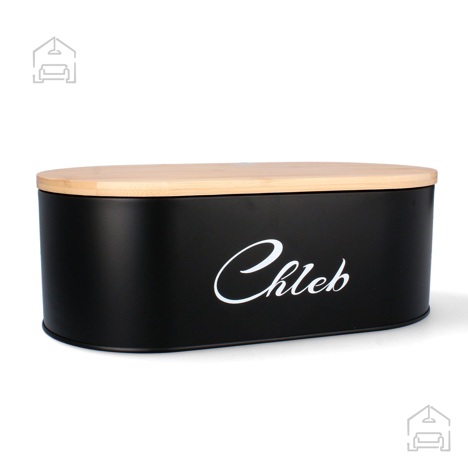 Črna emajlirana škatla za kruh z bambusovim pokrovom in belim napisom »kruh«.