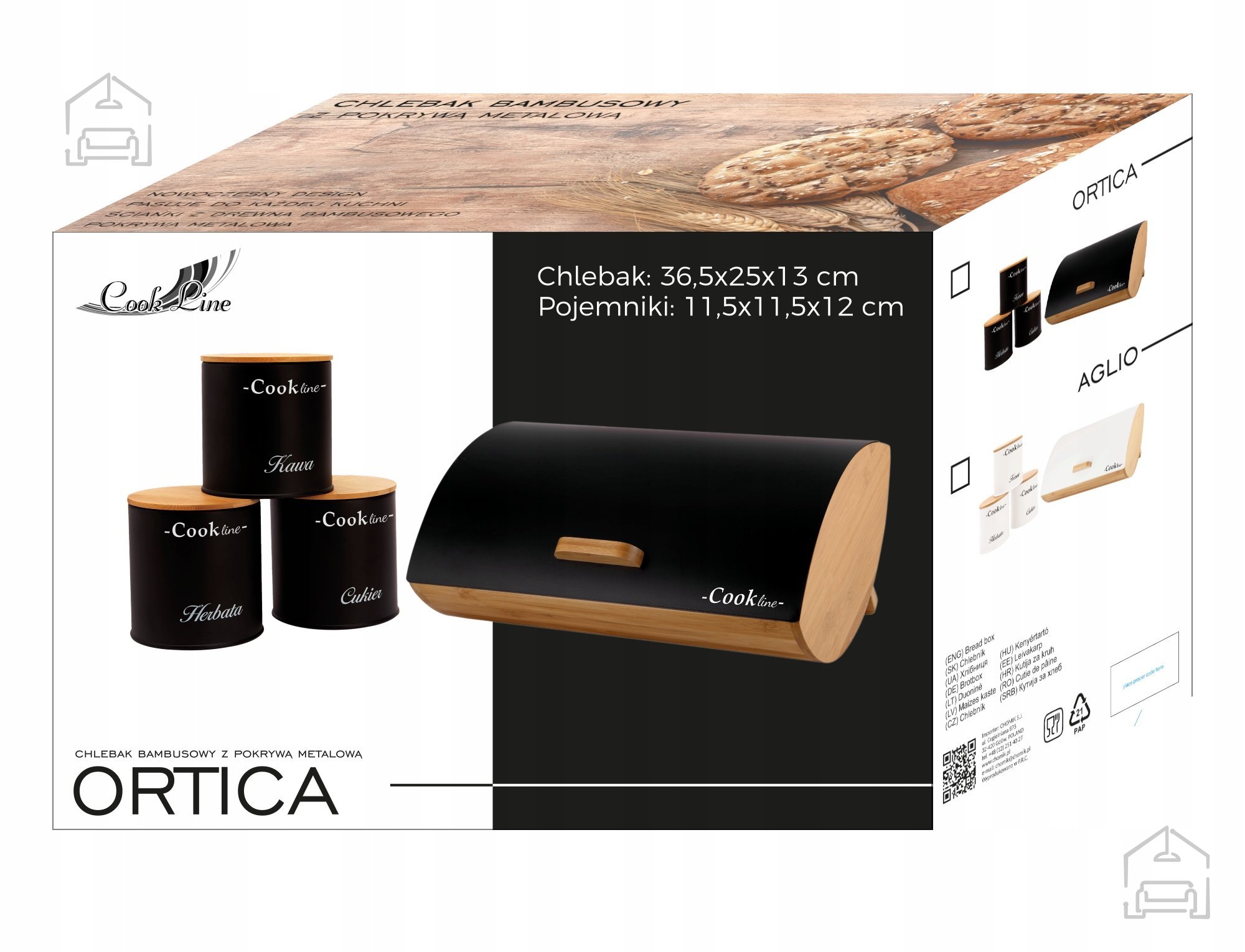 Ta elegantna škatla za kruh dimenzij 36,5 × 25 × 13 cm je zasnovana tako, da ohranja svežino kruha in hkrati prinaša prefinjen estetski pridih v vsako kuhinjo. Izdelana je iz naravnega bambusa, znanega po svoji trpežnosti, odpornosti na vlago in prijetnem naravnem videzu, medtem ko robusten kovinski pokrov v mat črni barvi dodaja sodoben kontrast. V kompletu so priložene tri praktične posodice dimenzij 11,5 × 11,5 × 12 cm, ki omogočajo shranjevanje različnih dodatkov – od kave, sladkorja in čaja do oreščkov ali začimb. Na zadnji strani škatle najdete tudi recept za domači hrustljavi kruh, ki spodbuja k ustvarjalnosti in uživanju v sveže pečenem kruhu.