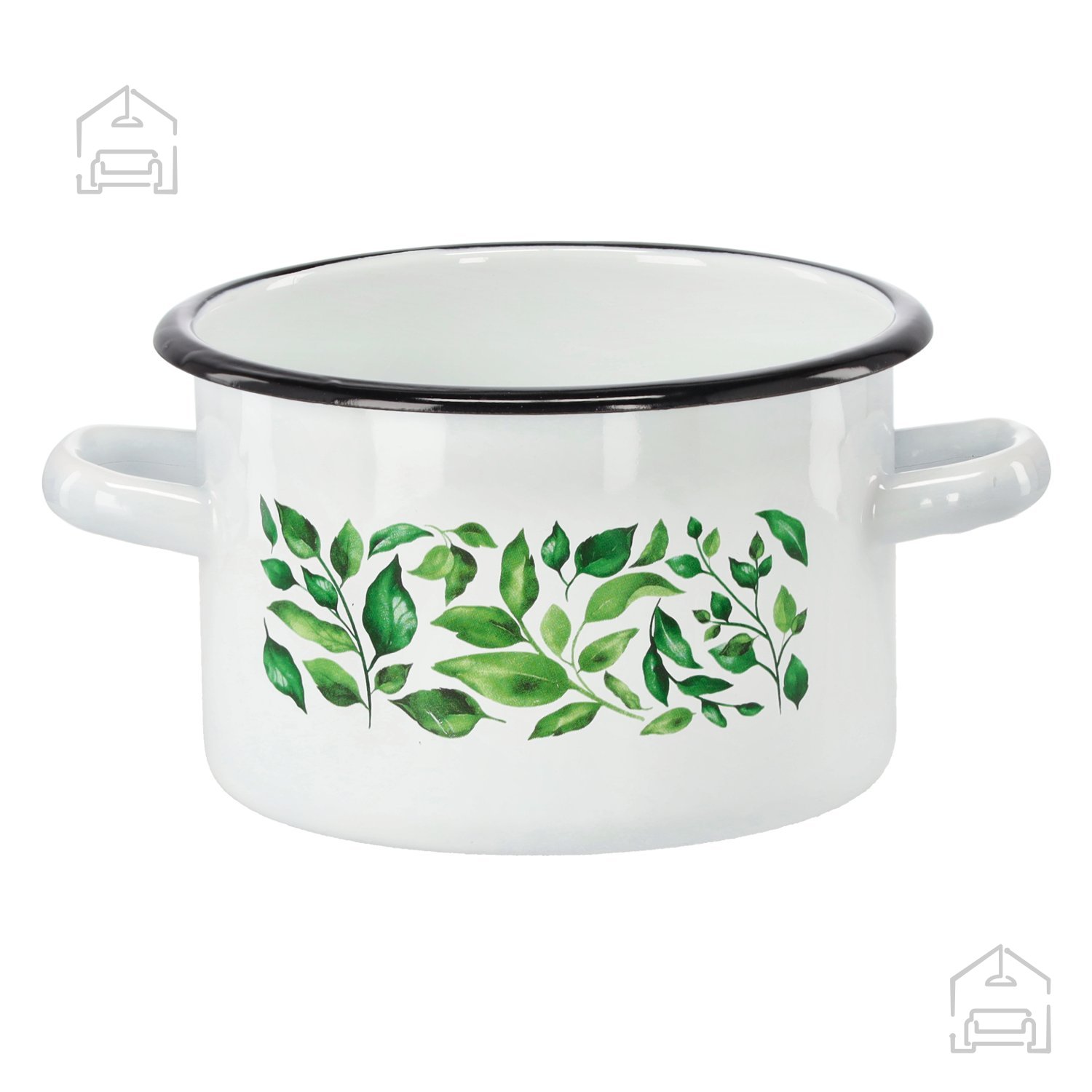 Izdelek: Emaliiran lonec Prostornina: 2 l Premer: 16 cm Barva: bela Vzorec: fikus Material: emajl Uporaba: vsakodnevno kuhanje