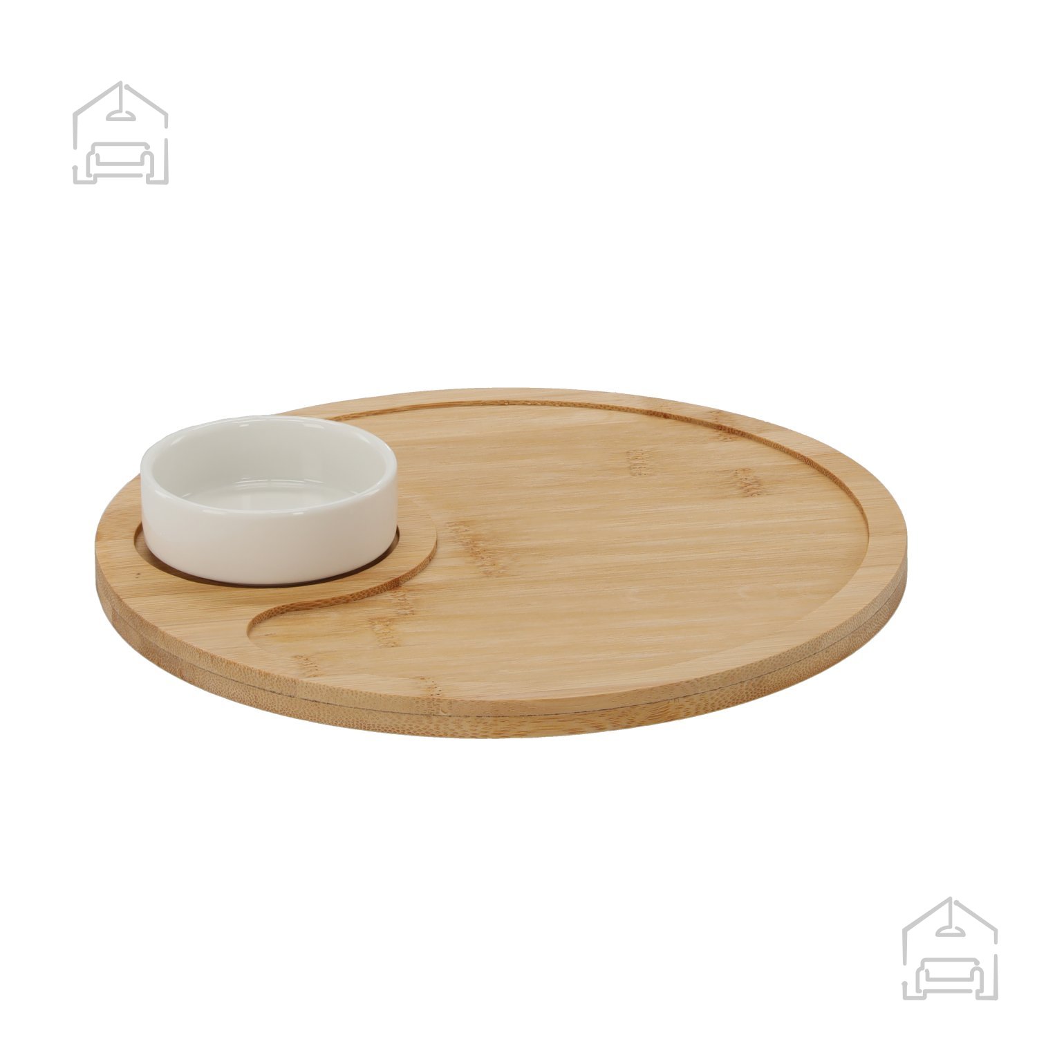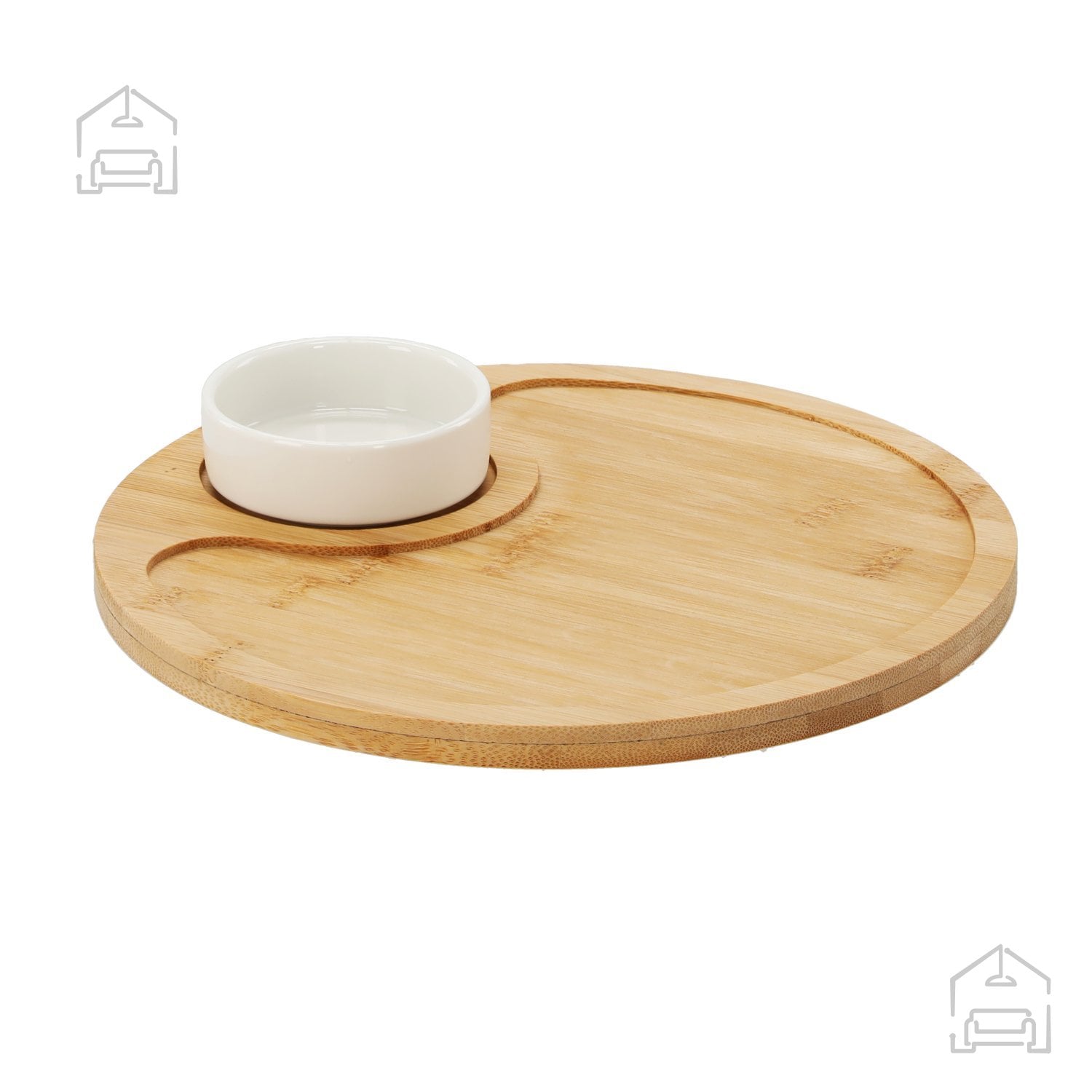 Chomikov komplet za serviranje predjedi v okrogli izvedbi se ponaša z minimalističnim, a sodobnim dizajnom, ki se odlično poda k različnim slogom pogrinjka. Čist, zaobljen rob pladnja omogoča udoben oprijem, medtem ko posodica v sredini ali ob strani nudi priročen prostor za omake, oreščke ali namaze. Takšna kombinacija je nepogrešljiva pri postrežbi antipastov, sirovih plošč, zelenjavnih prigrizkov ali celo sladic. Njegova nevtralna oblika se brez težav zlije z drugimi kuhinjskimi dodatki, zato ga lahko uporabite tako pri vsakodnevnih obrokih kot pri prazničnih pogostitvah.
