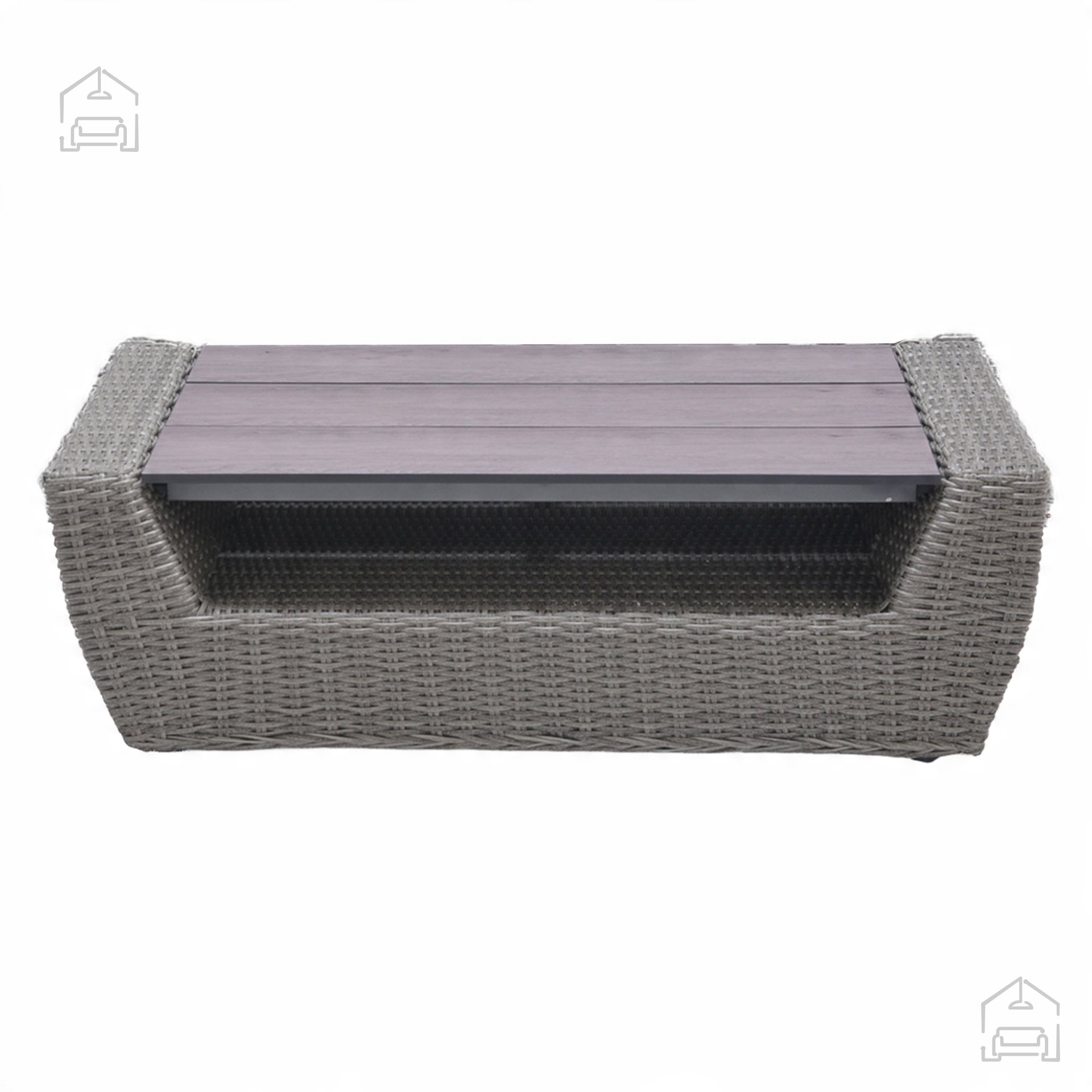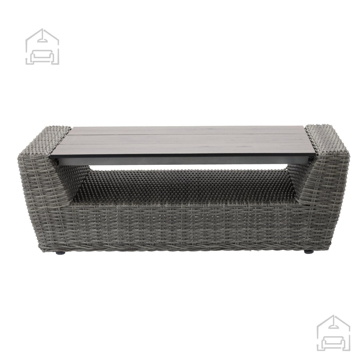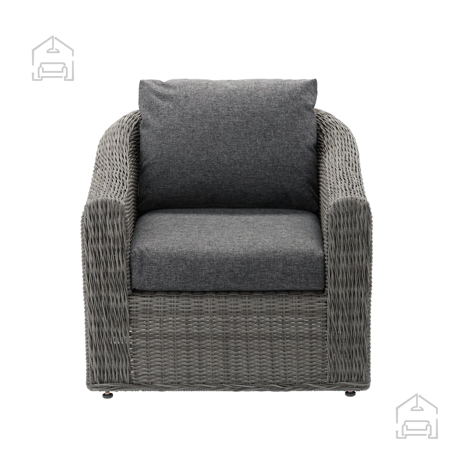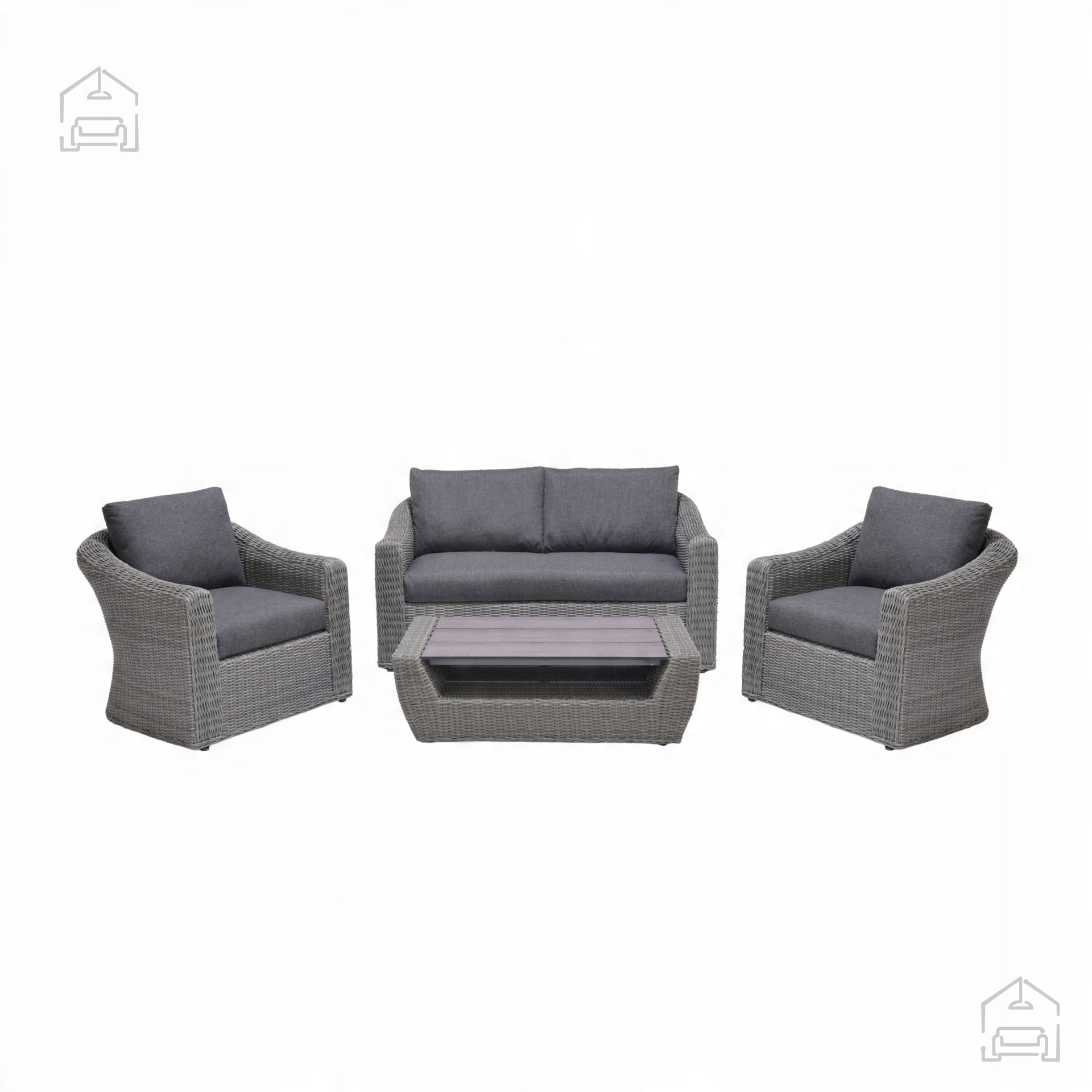 Stilski komplet vrtnega pohištva, idealen za sprostitev na terasi, balkonu ali na vrtu. Komplet vsebuje: - dvosedežno zofo, - dva udobna fotelja z naslonjalnimi in sediščnimi blazinami, - praktično klubsko mizico s ploščo v barvi lesa. Konstrukcija pohištva je izdelana iz trpežnega tehnorattana, odpornega na vremenske razmere, kar zagotavlja trajnost in enostavno vzdrževanje čistoče. Mehke, debele blazine v sivih odtenkih zagotavljajo udobje pri sedenju in estetski videz. Komplet združuje klasičen dizajn z moderno funkcionalnostjo ter ustvarja prijeten kotiček za sprostitev na prostem. - dimenzije fotelja: 85 x 86 x 78 cm - dimenzije zofe: 88 x 155 x 78 cm - dimenzije mizice: 110 x 67 x 36 cm - plošča mizice je izdelana iz trpežnega in estetskega materiala FSC™ DuraBoard®, odpornega na vremenske razmere, nastalega iz mešanice evkaliptusovih žagovin in polietilenske smole