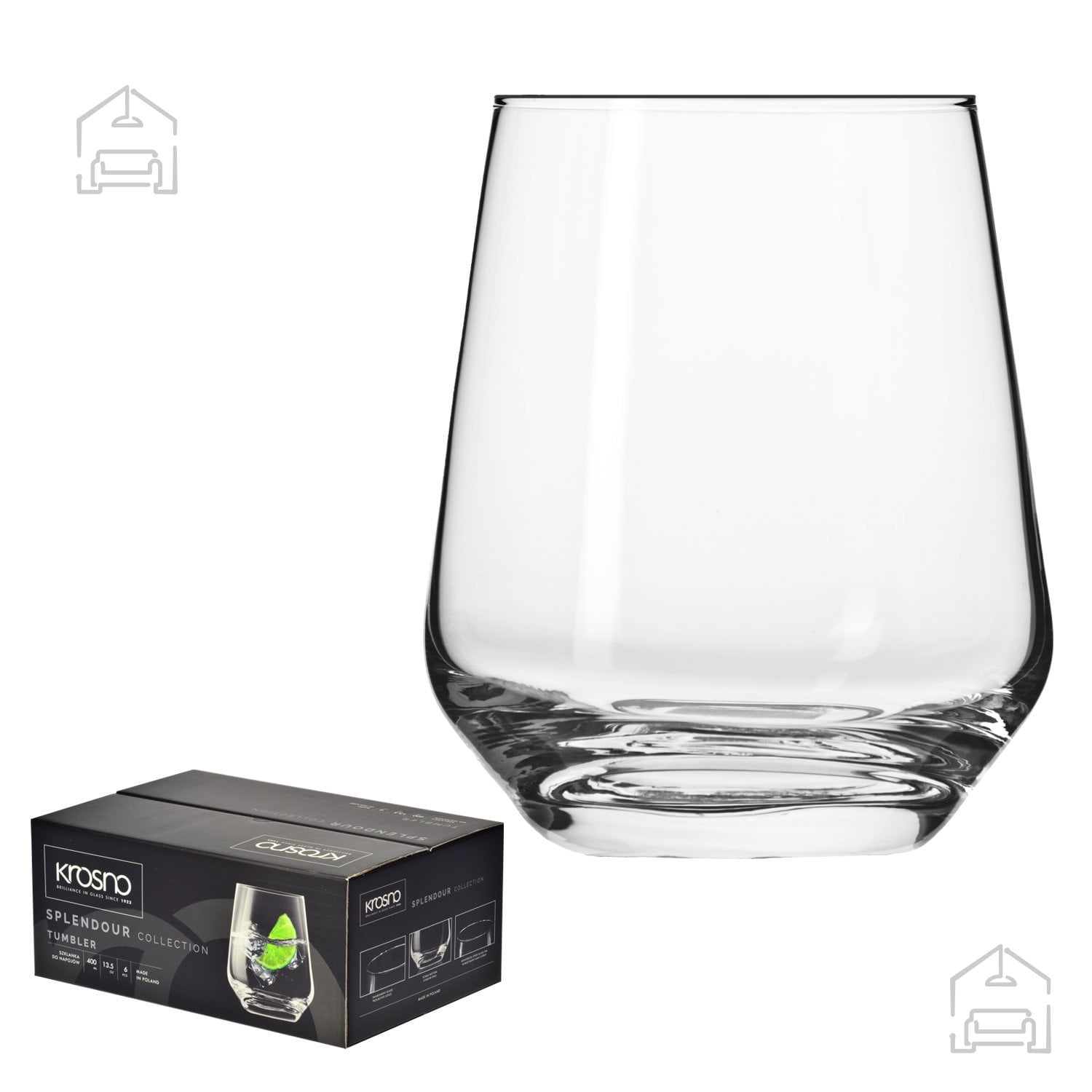 Kozarci Splendour so zaradi svoje prostornine idealni za različne vrste pijač – od vode, sokov in ledenega čaja do koktajlov, viskija ali sadnih napitkov. Nizka oblika omogoča stabilnost na mizi in lažje zlaganje v pomivalnem stroju, hkrati pa je primerna tudi za postrežbo hladnih sladic, sadnih solat ali manjših porcij pijač z ledom. Enoten volumen 400 ml omogoča natančno merjenje in skladno postrežbo več gostov hkrati.