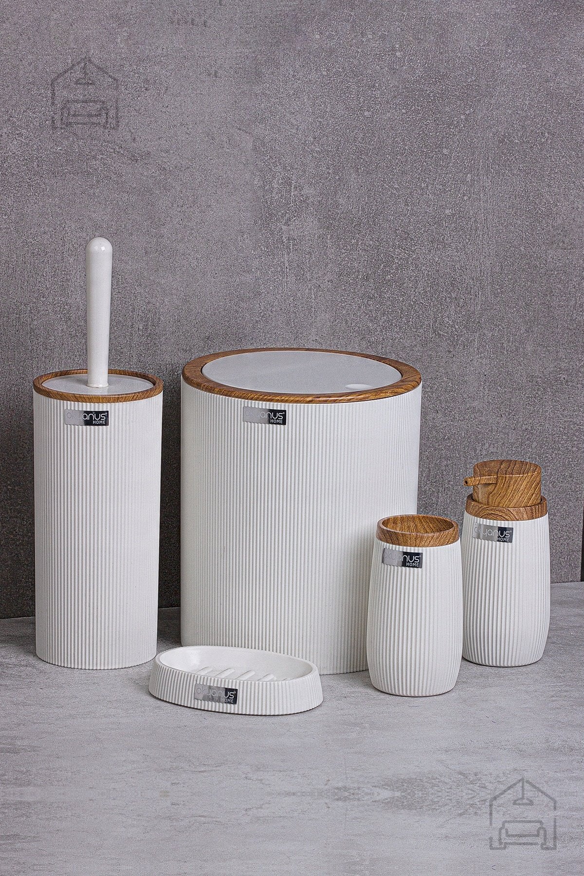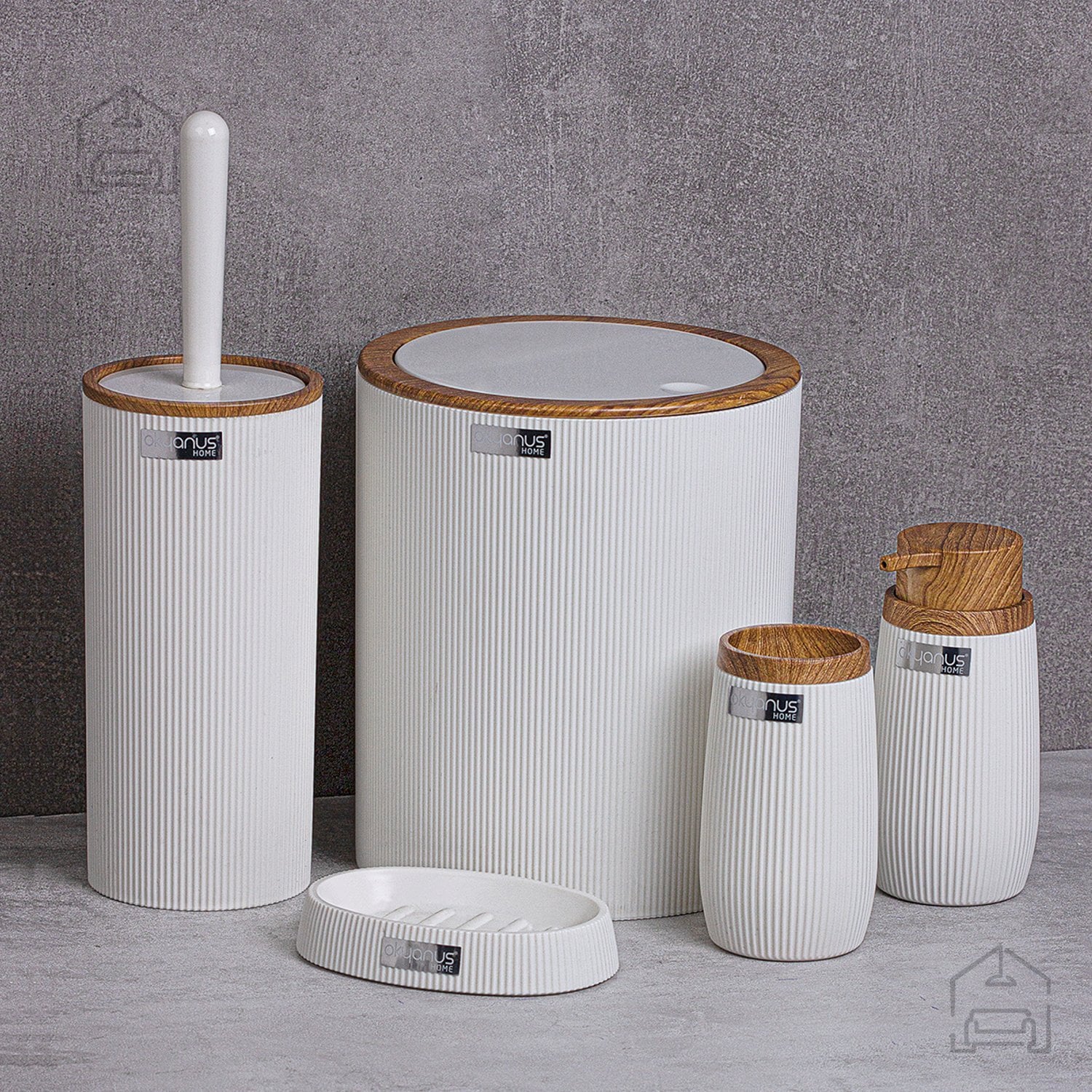 Čeprav je komplet izdelan iz plastike, se ponaša z izjemno natančno obdelavo površine, ki vizualno spominja na naraven les. Ta kombinacija daje kopalnici občutek topline, hkrati pa ohranja vse praktične prednosti sintetičnih materialov – odpornost proti vlagi, koroziji in madežem. Vsak element kompleta je lahek, a stabilen, kar omogoča preprosto premikanje in čiščenje brez nevarnosti poškodb.