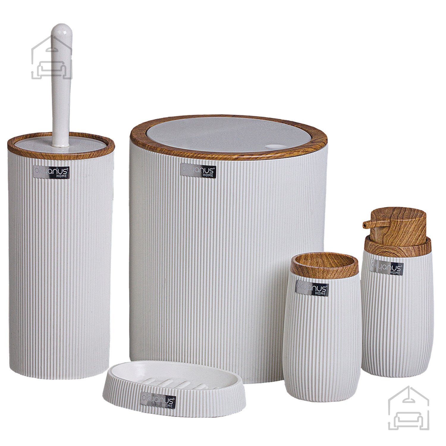 Bela barva z lesnim videzom in trpežna plastika: Komplet kopalniški okrogli 5-delni – Chomik.