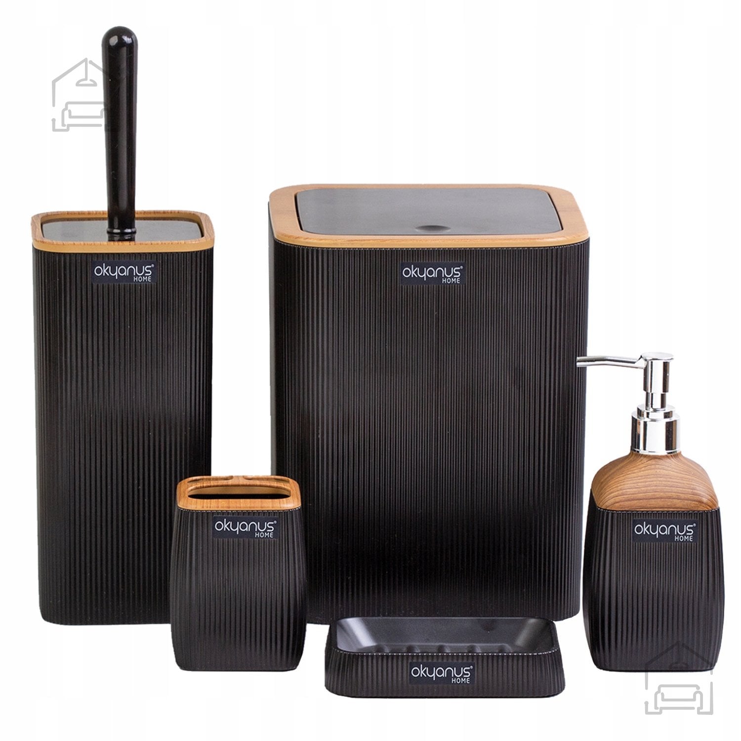 Črna barva z lesenimi zaključki: Komplet kopalniški kvadratni 5-delni – Chomik. Ta elegantno zasnovan komplet iz trpežne umetne mase združuje sodoben minimalizem in toplino lesenega videza, kar ustvari harmoničen in prefinjen videz kopalnice. Vsak kos v kompletu je funkcionalno zasnovan in izdelan z mislijo na vsakodnevno uporabo, hkrati pa deluje kot estetski dodatek, ki dopolni prostor. Komplet je idealna izbira za vse, ki želijo v svojo kopalnico vnesti pridih naravnosti in hkrati ohraniti enostavnost čiščenja ter odpornost na vlago.