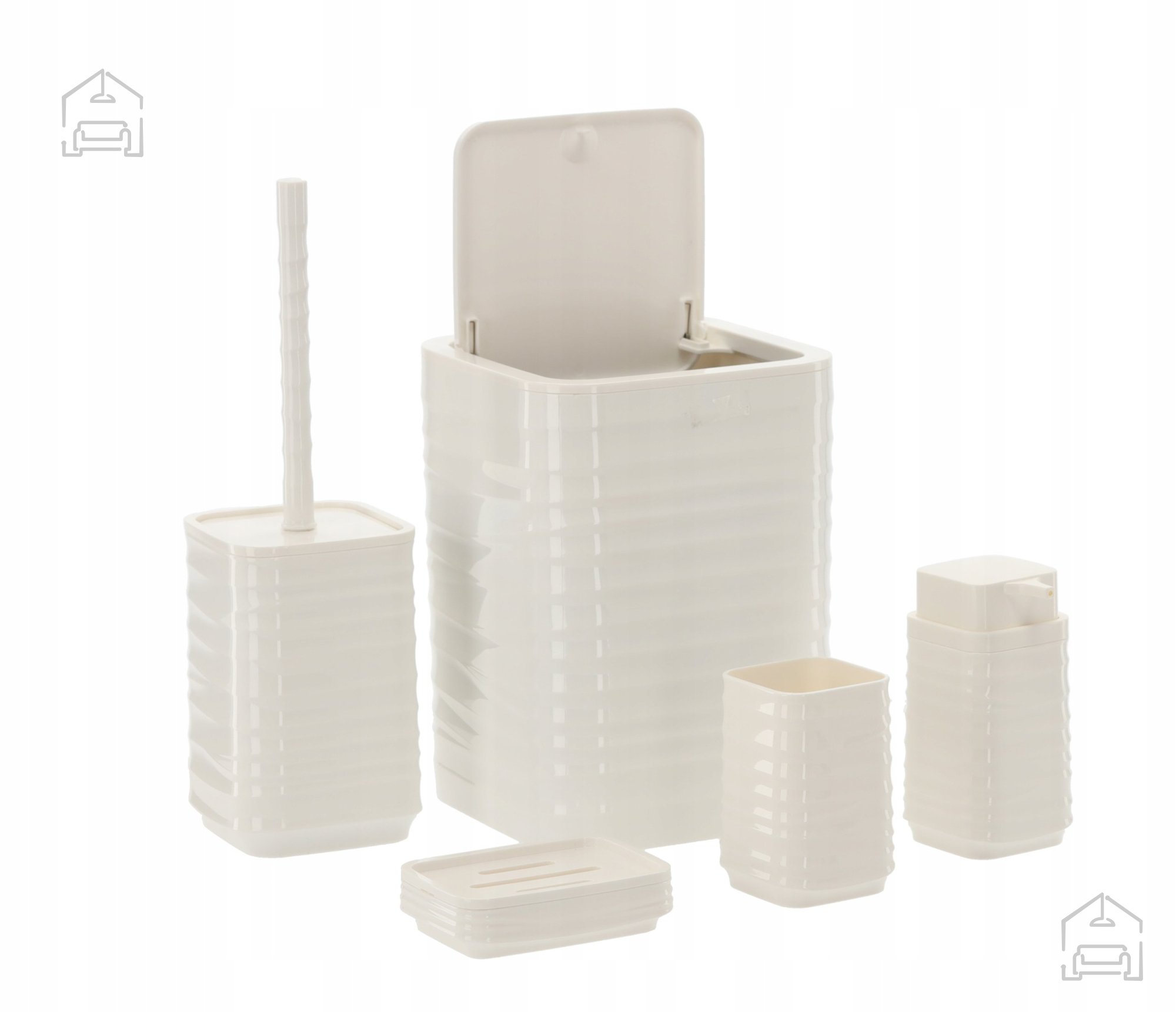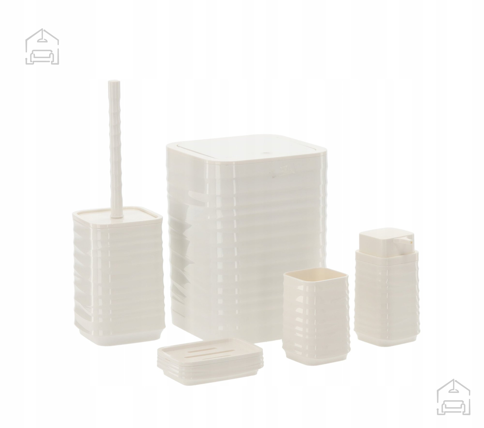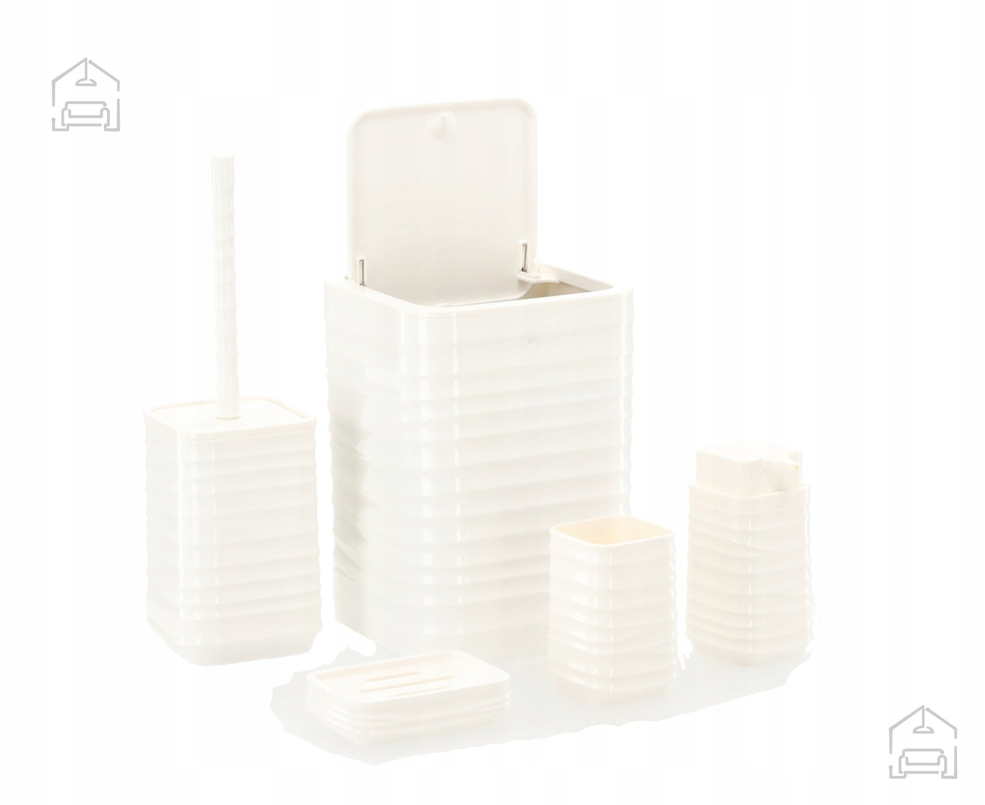 Umetna masa v sijoče beli barvi: Kopalniška garnitura kvadratna 5 delov *4403 – Chomik. Ta elegantni komplet združuje funkcionalnost, trpežnost in dovršen minimalistični dizajn, ki se popolnoma poda vsaki sodobni kopalnici. Zaradi svoje enotne barvne zasnove in kvadratnih linij se garnitura harmonično zlije z različnimi stili – od modernih in industrijskih do klasičnih kopalniških ambientov, kjer prevladuje čistoča in red.