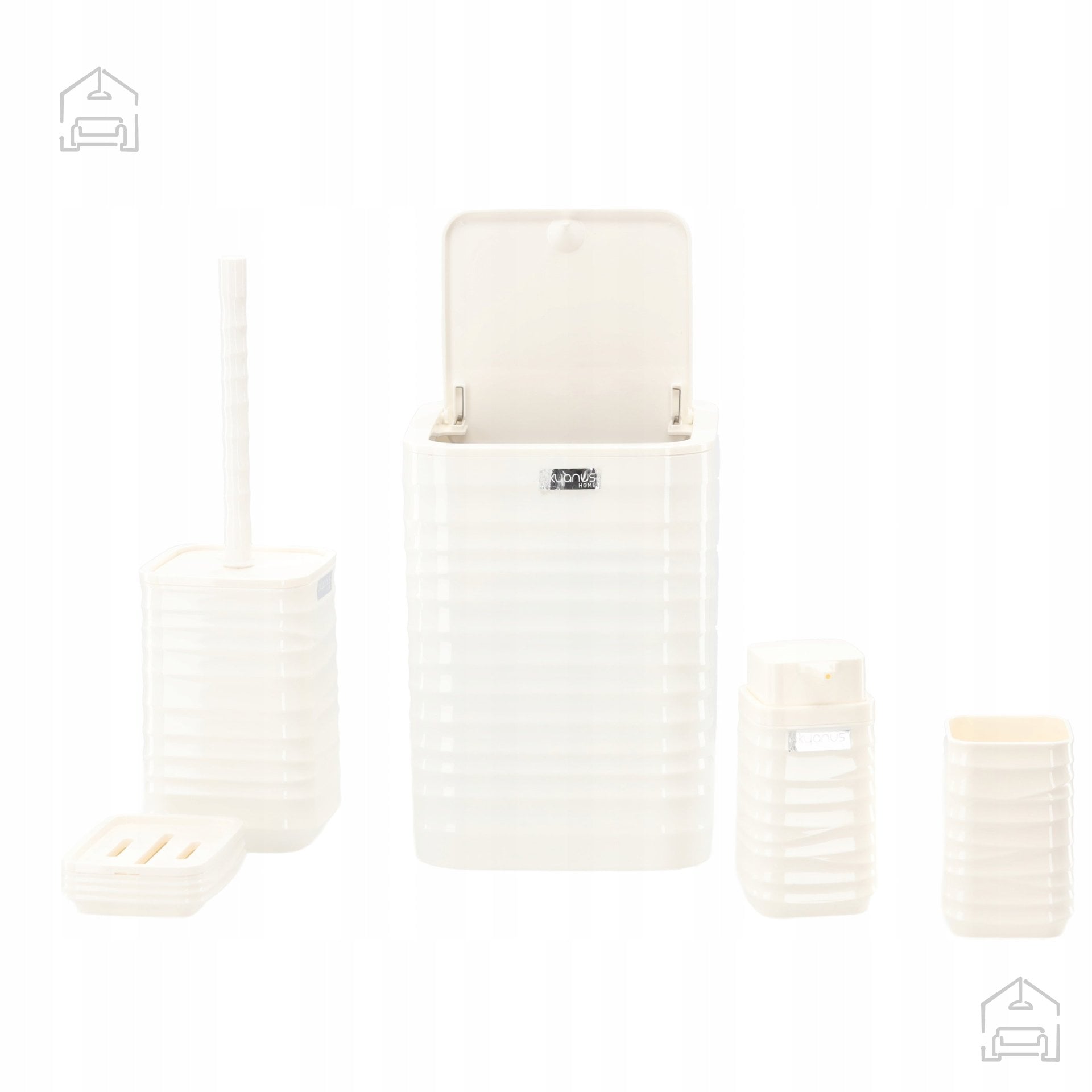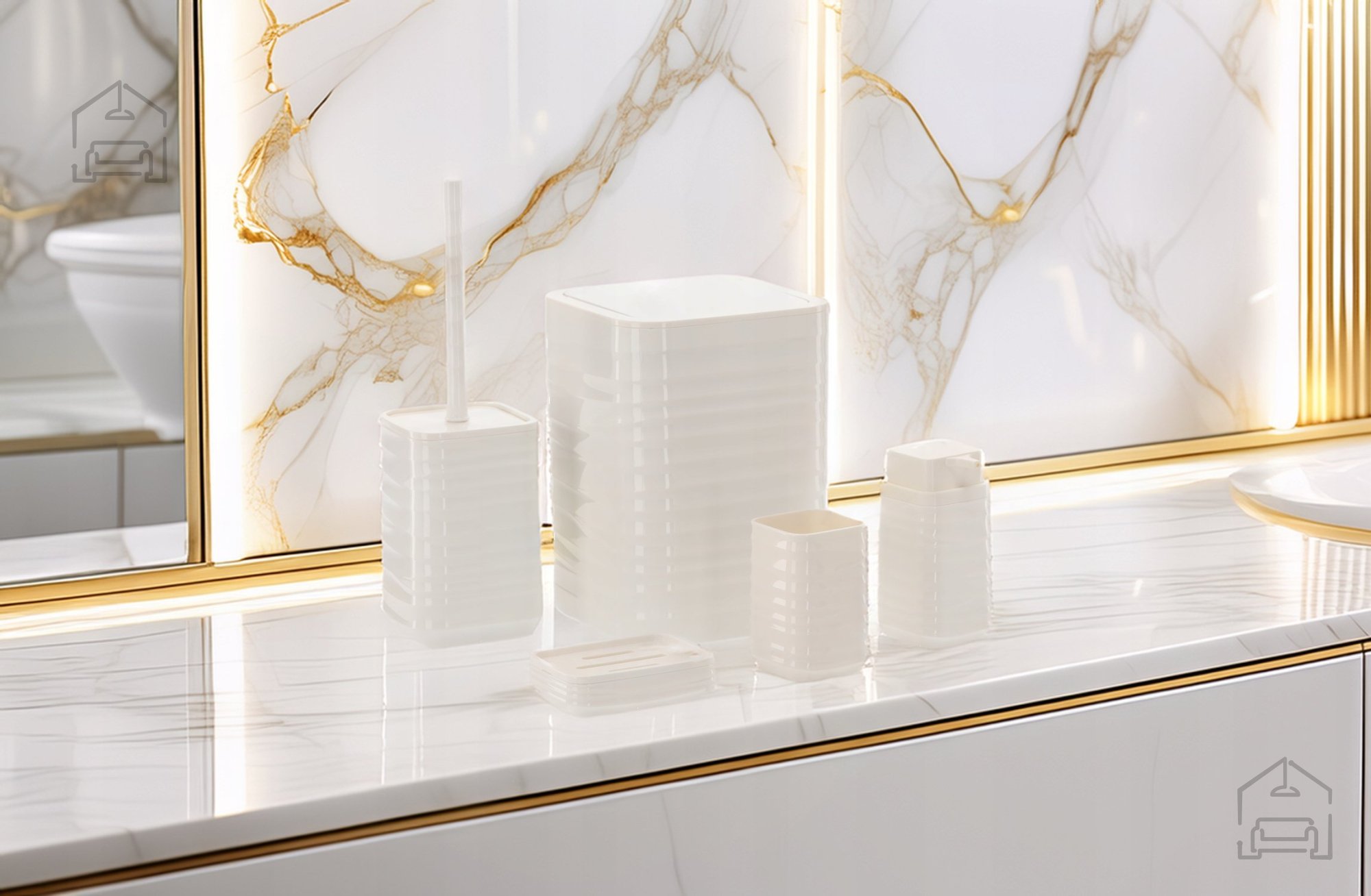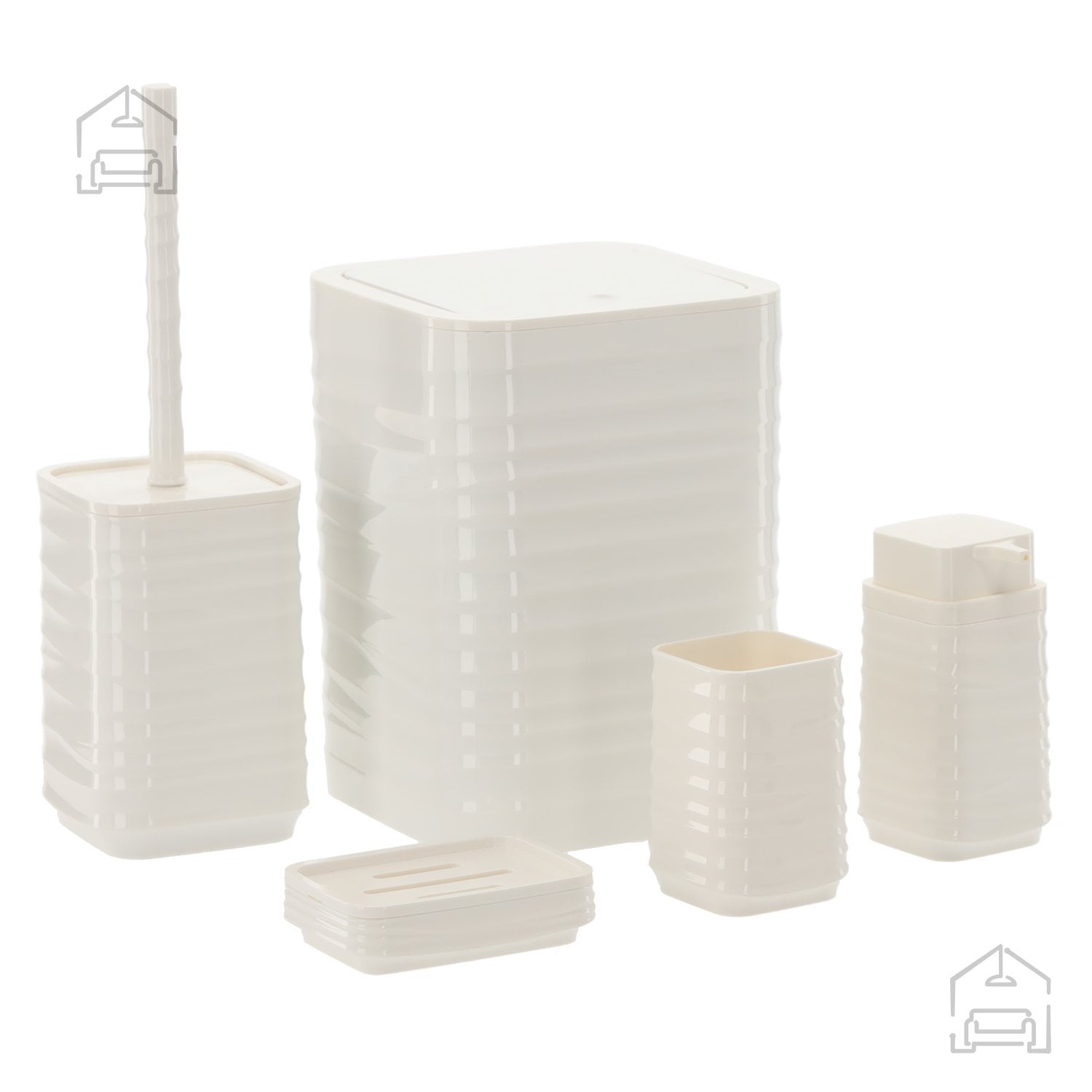 Umetna masa v sijoče beli barvi: Kopalniška garnitura kvadratna 5 delov *4403 – Chomik. Ta elegantni komplet združuje funkcionalnost, trpežnost in dovršen minimalistični dizajn, ki se popolnoma poda vsaki sodobni kopalnici. Zaradi svoje enotne barvne zasnove in kvadratnih linij se garnitura harmonično zlije z različnimi stili – od modernih in industrijskih do klasičnih kopalniških ambientov, kjer prevladuje čistoča in red.