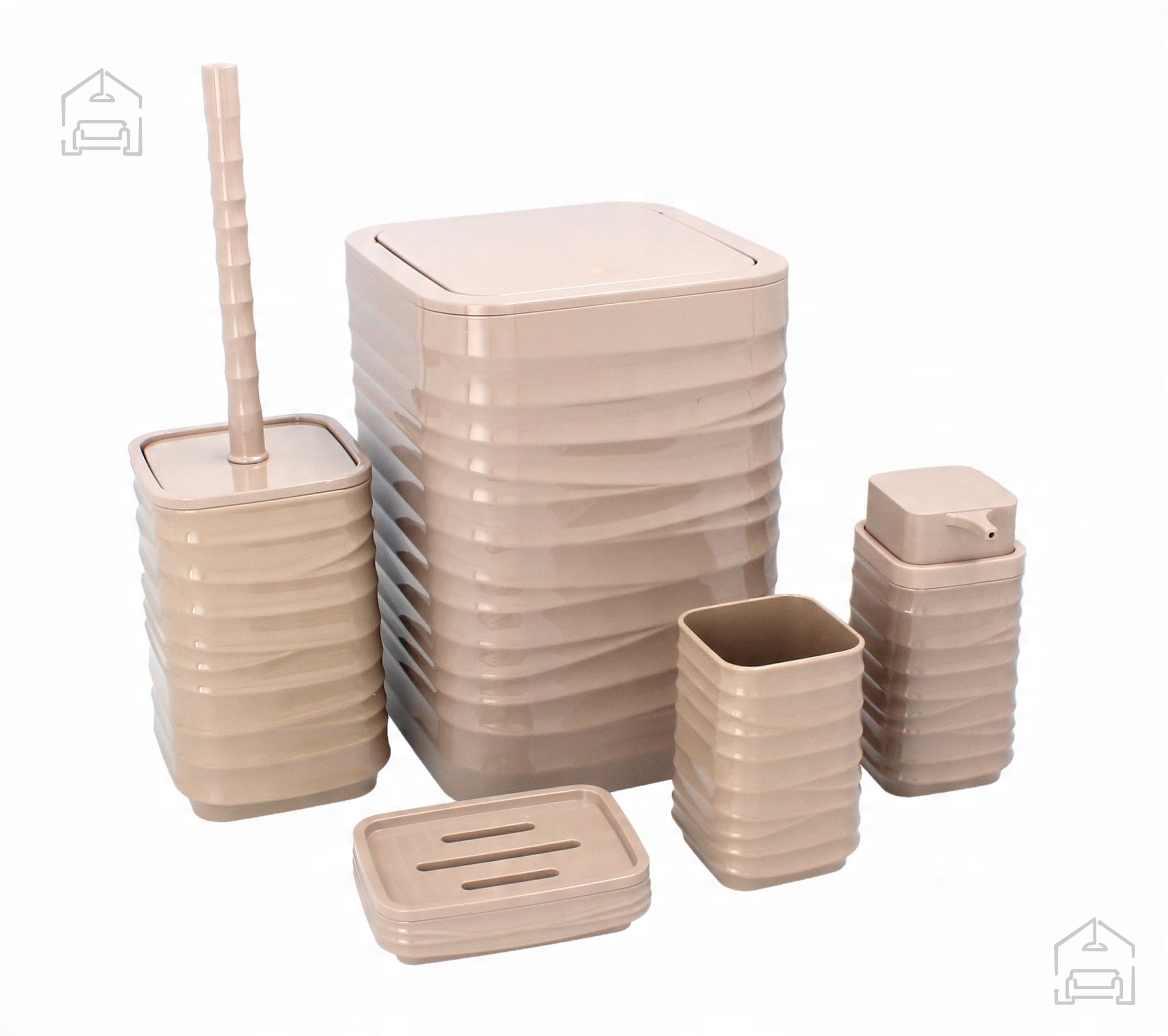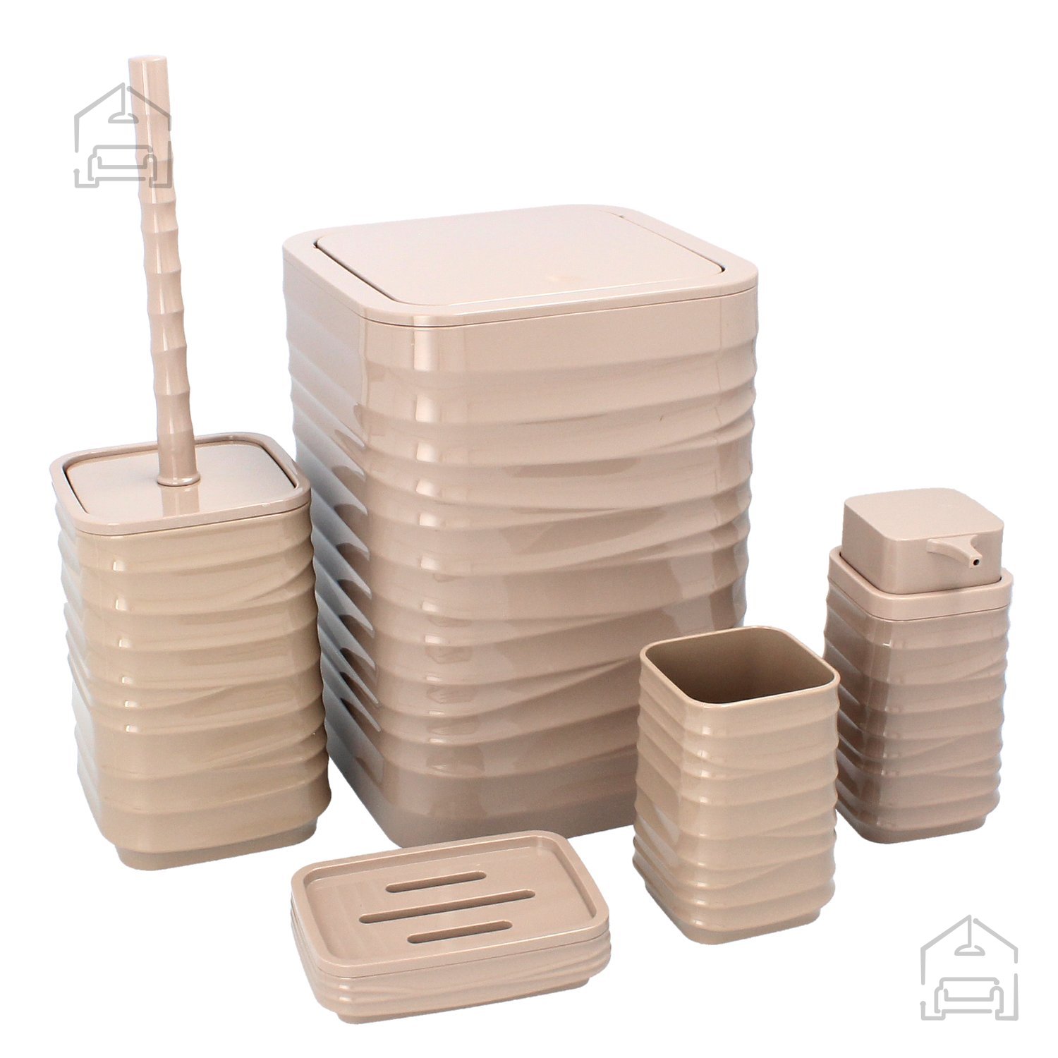 Rjava barva tega kompleta je topla in prijetna, zato se lepo vklopi v raznolike stile kopalnic – od klasičnih do sodobnih. Kvadratna oblika posameznih elementov daje prostoru urejen in sodoben videz, hkrati pa olajša razporeditev na policah ali ob umivalniku. Ker je plastika lahka, je komplet primeren tudi za manjše kopalnice, kjer je pomembno, da dodatki ne zavzamejo preveč prostora, a še vedno nudijo vse potrebno udobje.