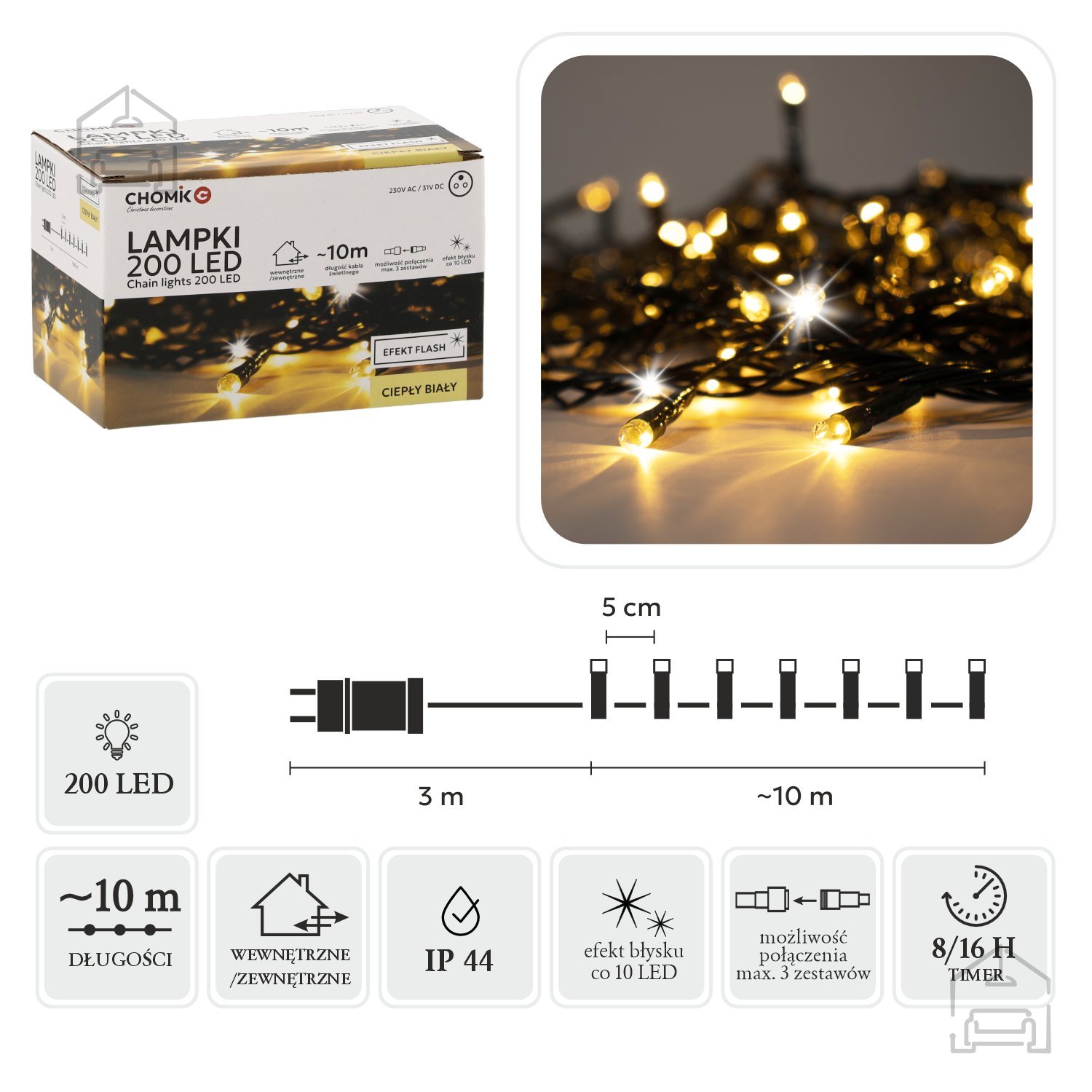 Količina diod: 200 Barva diod: toplo bela + hladen flash Dolžina: 13 m (svetlobni del 10 m + kabel 3 m) Barva: izolacija zelena, transformator črn Programator: stalni, pomnilnik + časovnik 8/16 h Zaščita: IP44, CE certifikat Napetost: 230 V / 31 V, razmik diod 5 cm, povezava do 3 verig