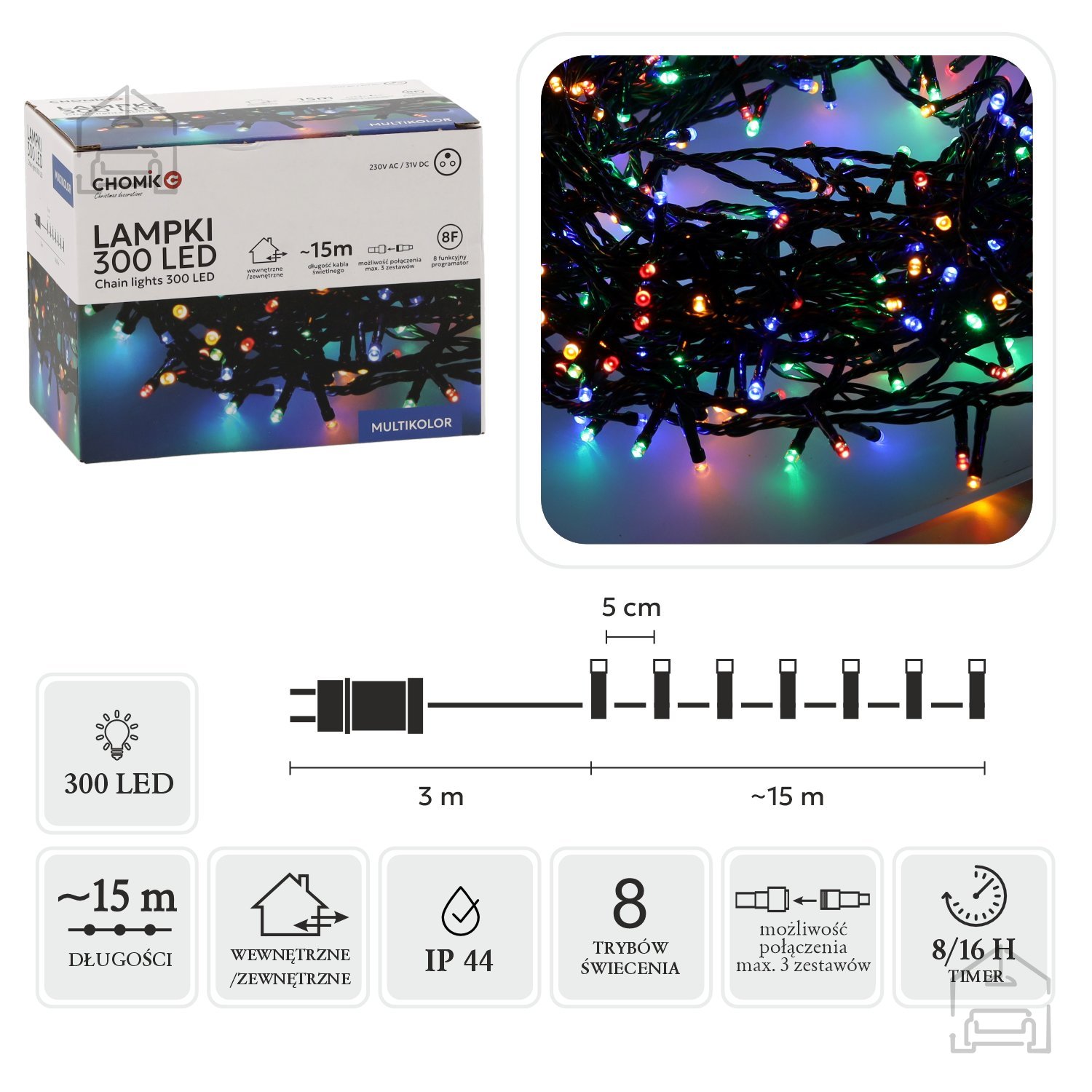 Količina diod: 300 multibarvnih Dolžina: 18 m (svetlobni del 15 m + kabel 3 m) Razmak diod: 5 cm Izolacija/transformator: zelena/črna Programator: 8 funkcij, pomnilnik, časovnik 8/16 h Priklop: do 3 verige Napetost: 230 V / 31 V, IP44, CE