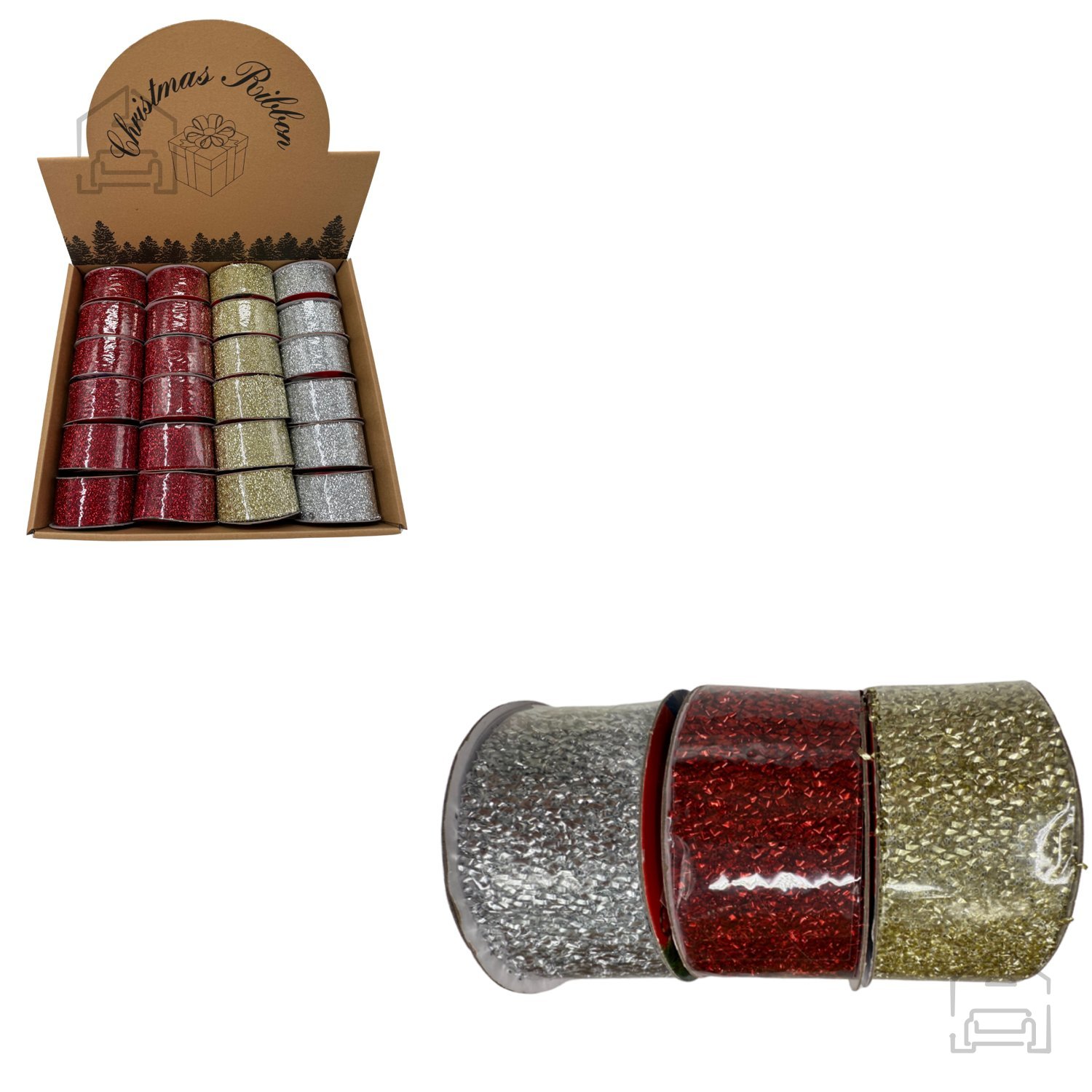 Praznični okrasni trak 3,8 cm x 2,7 m mešanica barv rdeča/zlata/srebrna pak=24kos *9768