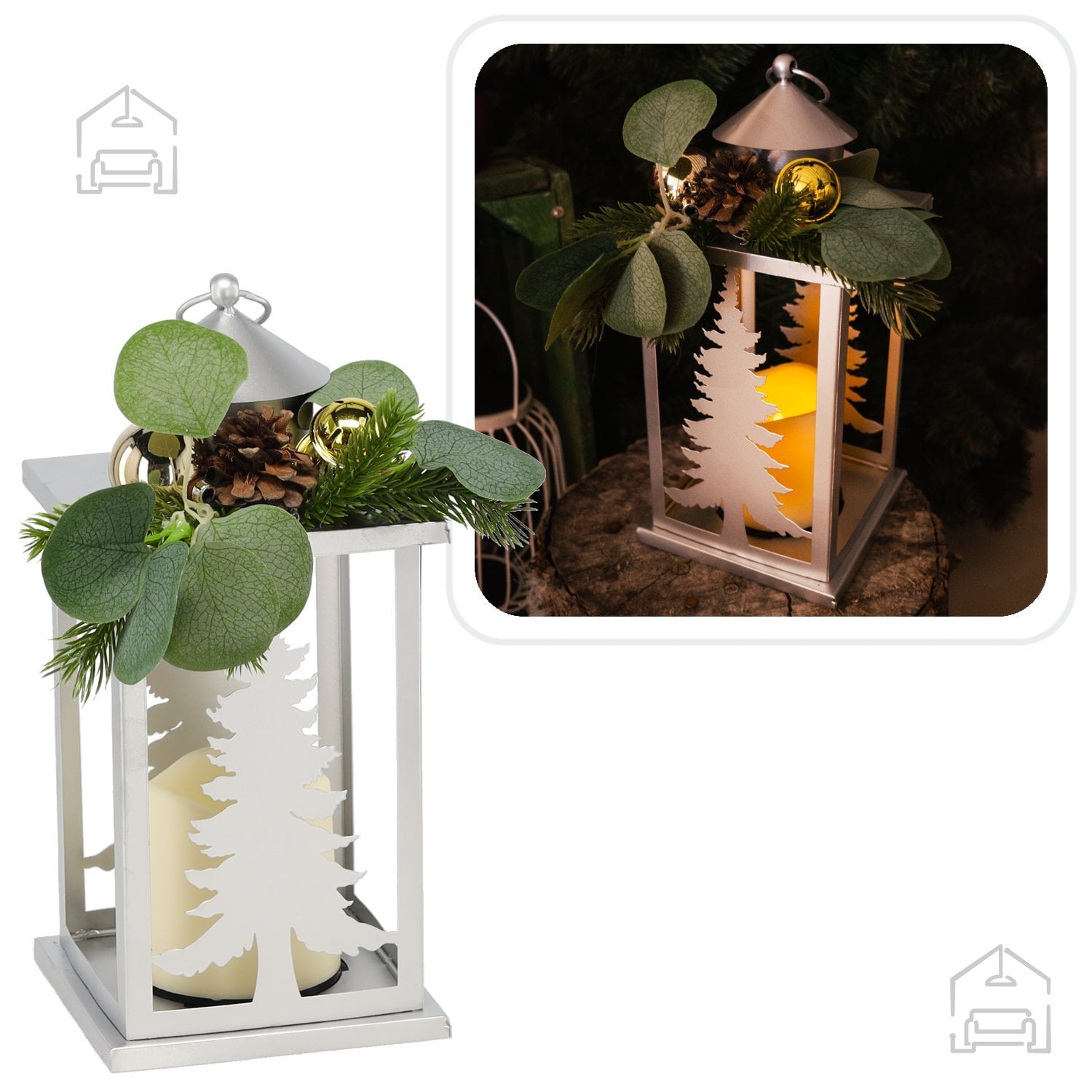 Chomikova praznična laterna združuje tradicionalno obliko s sodobnimi materiali in tehnološko dovršeno LED razsvetljavo. Srebrni kovinski okvir daje vtis plemenitosti in čistosti, medtem ko notranja okrasitev z majhnimi božičnimi drevesci, zelenimi vejicami in naravnim storžem pričara občutek topline in bližine narave. Ta kombinacija kovinskega leska in naravnih elementov ustvarja harmonično celoto, ki se lepo ujema tako z modernimi kot tudi s klasičnimi interierji.