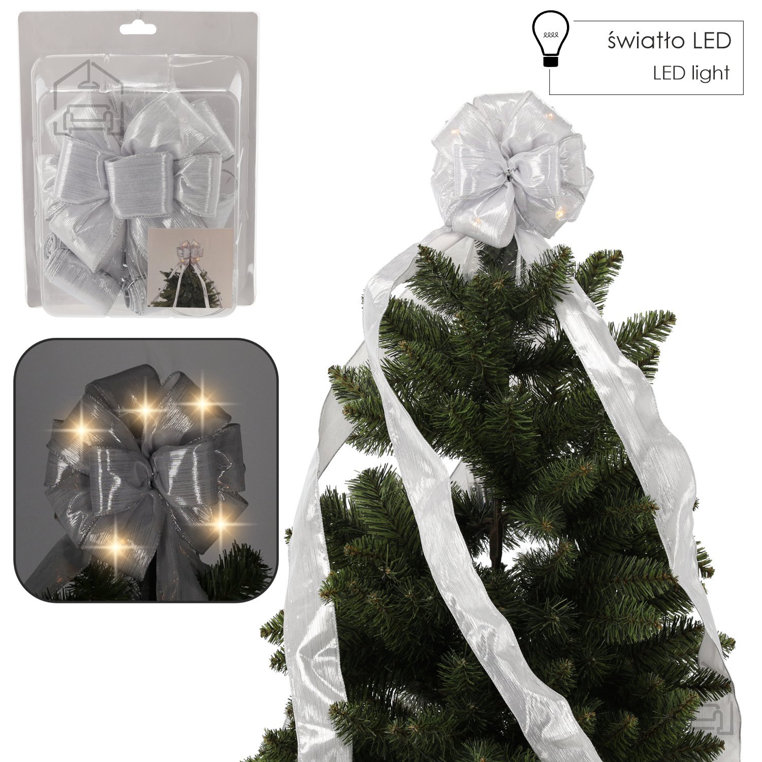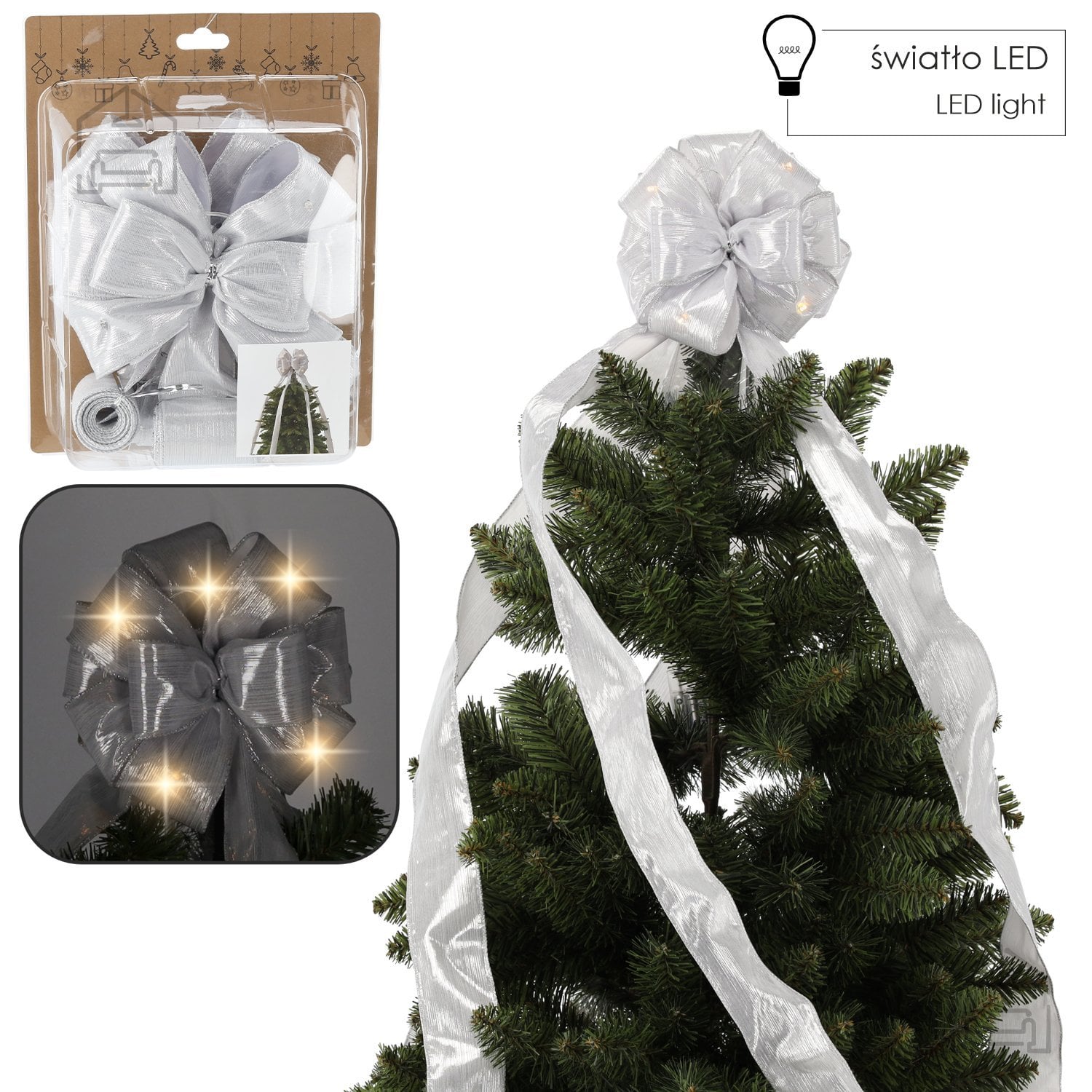 Srebrna LED osvetlitev dolžine 1,8 m: Kokarda na vrh božičnega drevesa – Chomik.