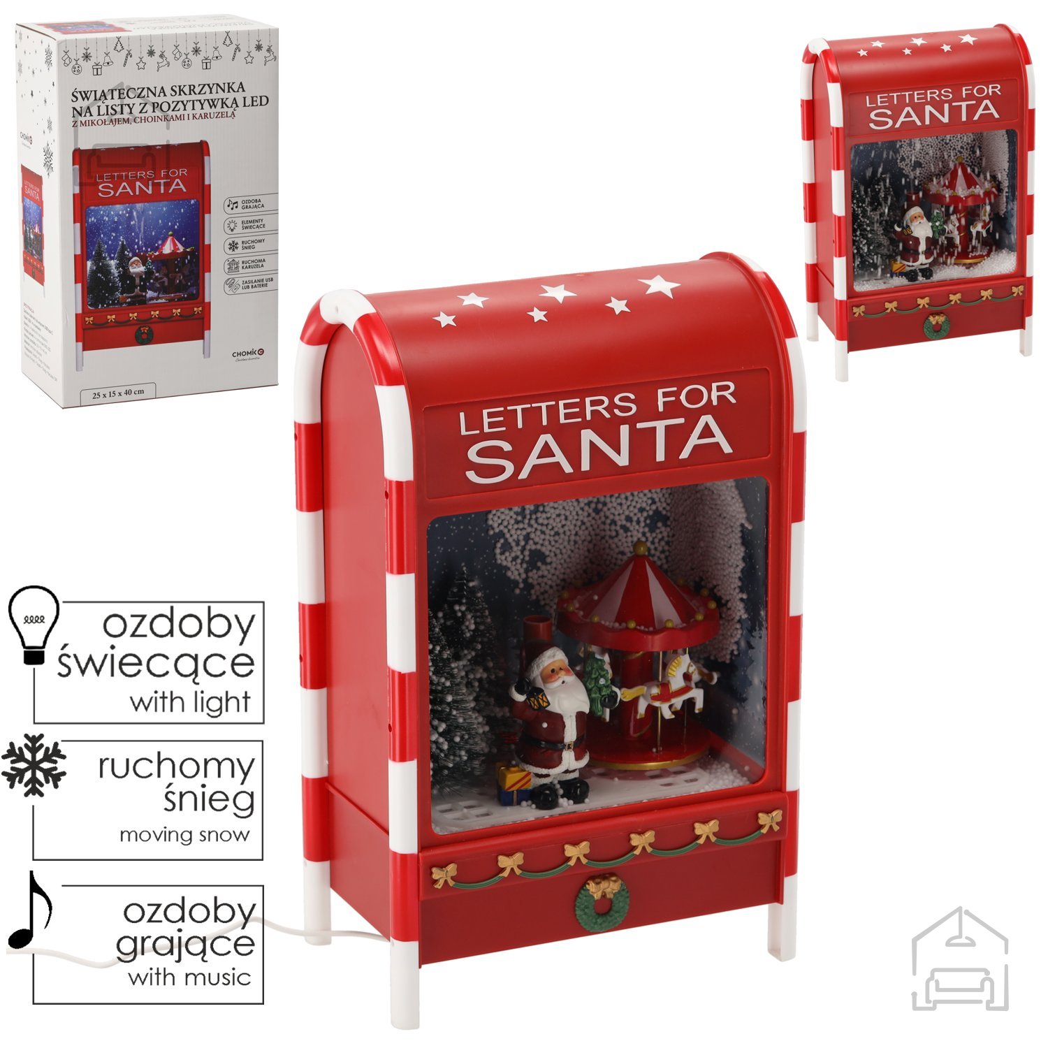 Dimenzije 25 × 15 × 40 cm: Božična poštna skrinjica – Chomik. Ta očarljiva dekoracija združuje toplino prazničnega duha z napredno LED osvetlitvijo in glasbenim mehanizmom, ki ustvarja čaroben ambient v vsakem domu ali vrtu. Izdelana je iz kakovostne plastike v živahni rdeči barvi, dopolnjujejo pa jo podrobno oblikovani motivi božička, snežnih dreves in vrtiljaka, ki se nežno vrti ob spremljavi osmih prazničnih melodij. Zaradi svoje velikosti in oblikovanja je primerna tako za notranjo kot zunanjo uporabo, kjer pritegne poglede in vnese toplino praznikov.