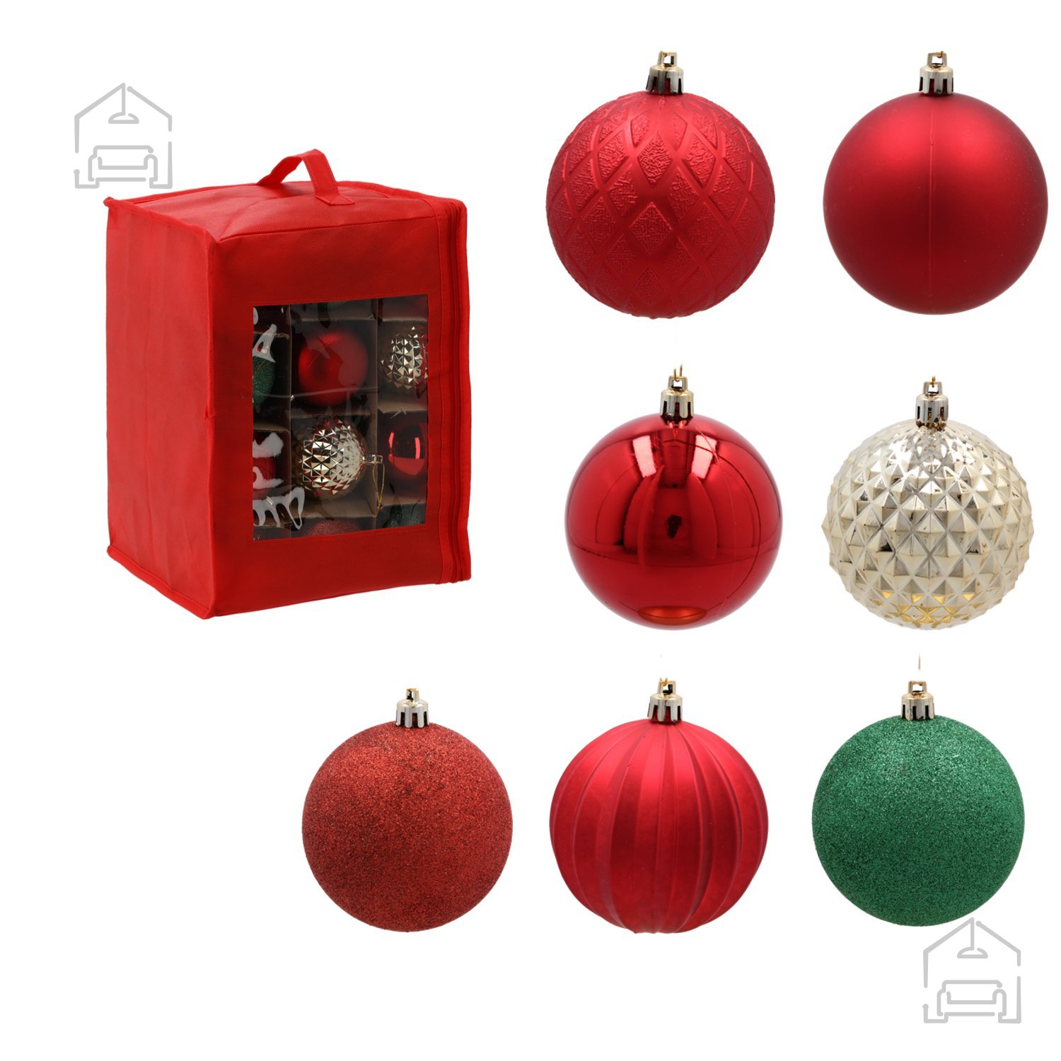 Komplet je zapakiran v rdečo torbo z zadrgo, ki omogoča enostavno prenašanje in shranjevanje. Ta torba ni le vizualno privlačna, temveč tudi izjemno funkcionalna – po praznikih jo preprosto zaprete in pospravite v omaro ali na podstrešje, brez strahu, da bi se kroglice poškodovale ali izgubile. Notranjost torbe je zasnovana tako, da omogoča urejeno razporeditev vseh 36 krogel, kar dodatno prispeva k njihovi ohranjenosti za naslednje praznične sezone.