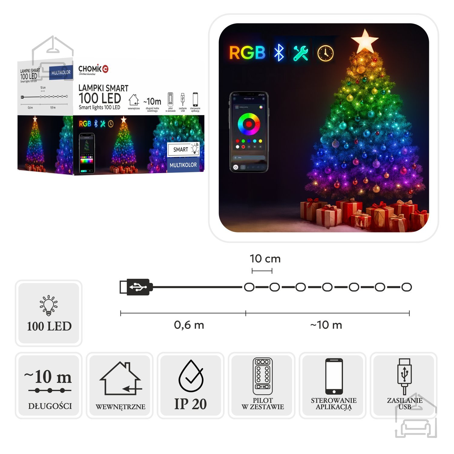Količina diod: 100 RGB Dolžina svetlobnega dela: 10 m Dolžina napajalnega kabla: 0,6 m Razdalja med diodami: 10 cm Razred zaščite: IP20 Uporaba: notranja Upravljanje: daljinec ali aplikacija Zengge (smart) Vtič: USB Certifikat: CE