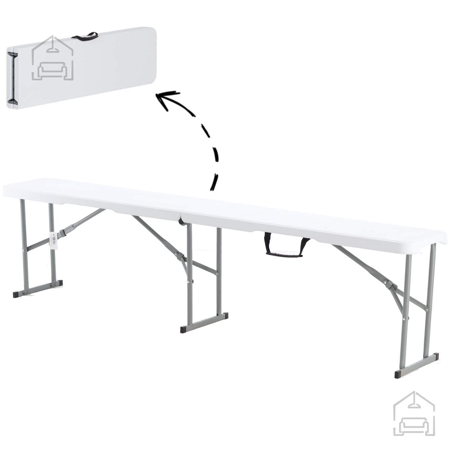 TURISTIČNA/CATERING ZLOŽLJIVA KLOP Zelo praktična in lahka klop, glede na njene dimenzije. Odlično se bo obnesla med družinskimi prireditvami na vrtu, porokami na prostem, kampiranjem ali na prodajnih stojnicah. TEHNIČNI PODATKI: Barva: Bela Dimenzije (dolž; šir; viš): 180 x 28 x 43,5 cm Debelina sedeža: 4 cm Material: Jeklen okvir + sedež iz polietilena HDPE Noge z oporniki: Da Nedrseče nogice: Da Stabilna konstrukcija: Da Material, enostaven za čiščenje: Da Za uporabo v notranjih in zunanjih prostorih: Da