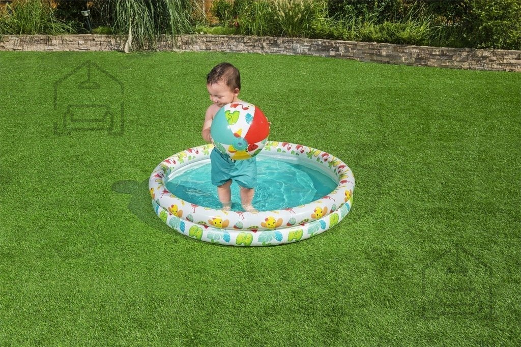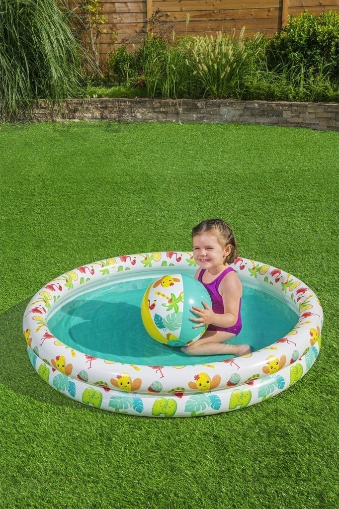 Bazen, prilagojen za najmlajše otroke, okrašen s pisanimi motivi, bo zagotovo všeč vašemu otroku. K bazenu sta priložena napihljiv rešilni obroč ter napihljiva žoga z enakimi okraski. Vsi izdelki so izdelani iz trpežnega in za otroke varnega vinila, ki je bil preizkušen glede vzdržljivosti. Napihljiv otroški bazenček je namenjen družinam, ki želijo skozi vse leto uživati v čudoviti zabavi s svojim malčkom. Konstrukcija z dvema obročema olajša napihovanje in preprečuje prevrnitev bazenčka (ko leži na ravni podlagi). Sama montaža in demontaža sta zelo preprosti ter ne zahtevata uporabe dodatnega orodja.