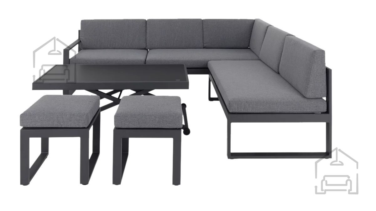 Komplet vključuje blazine: za tabureje debeline 7 cm in za zofo debeline 10 cm.