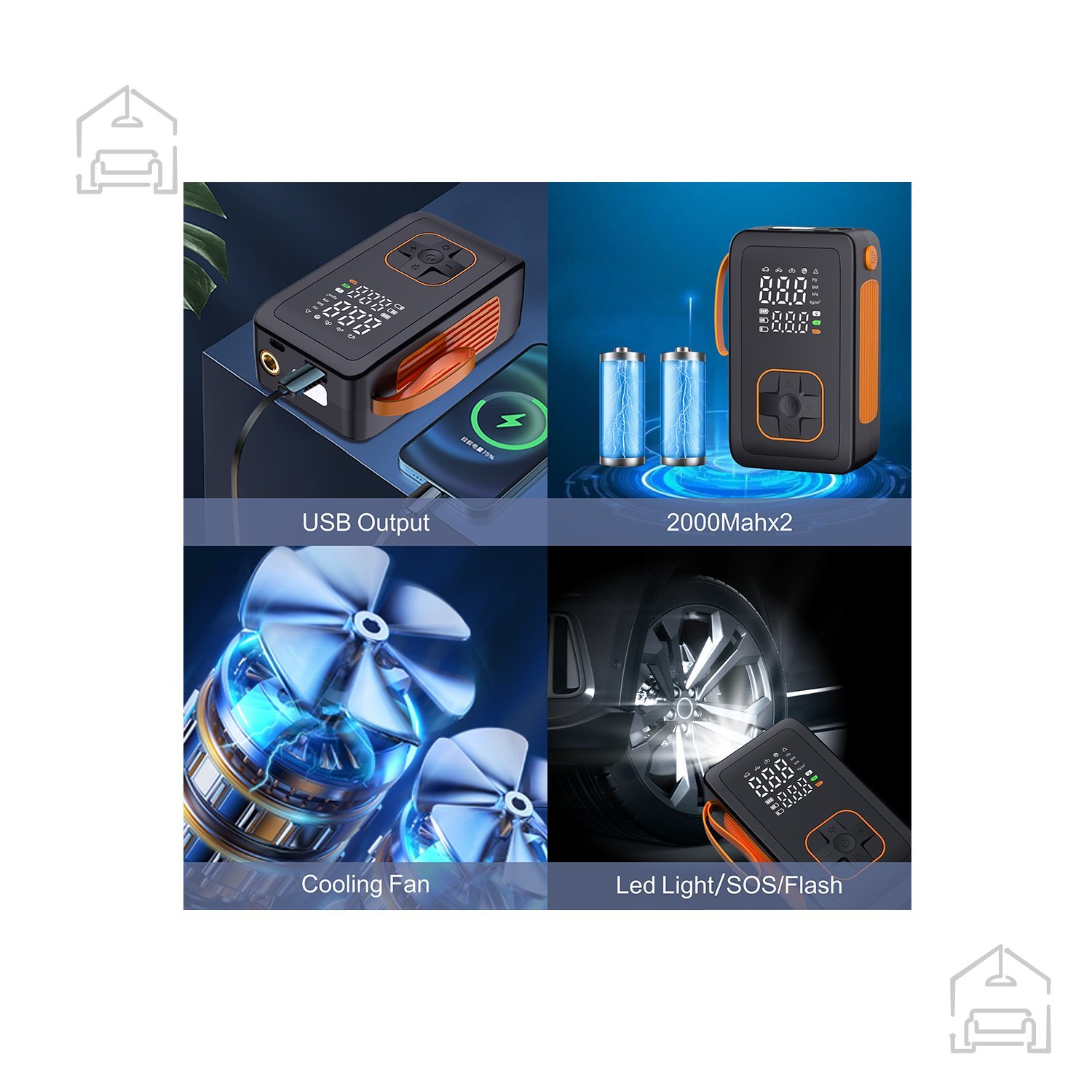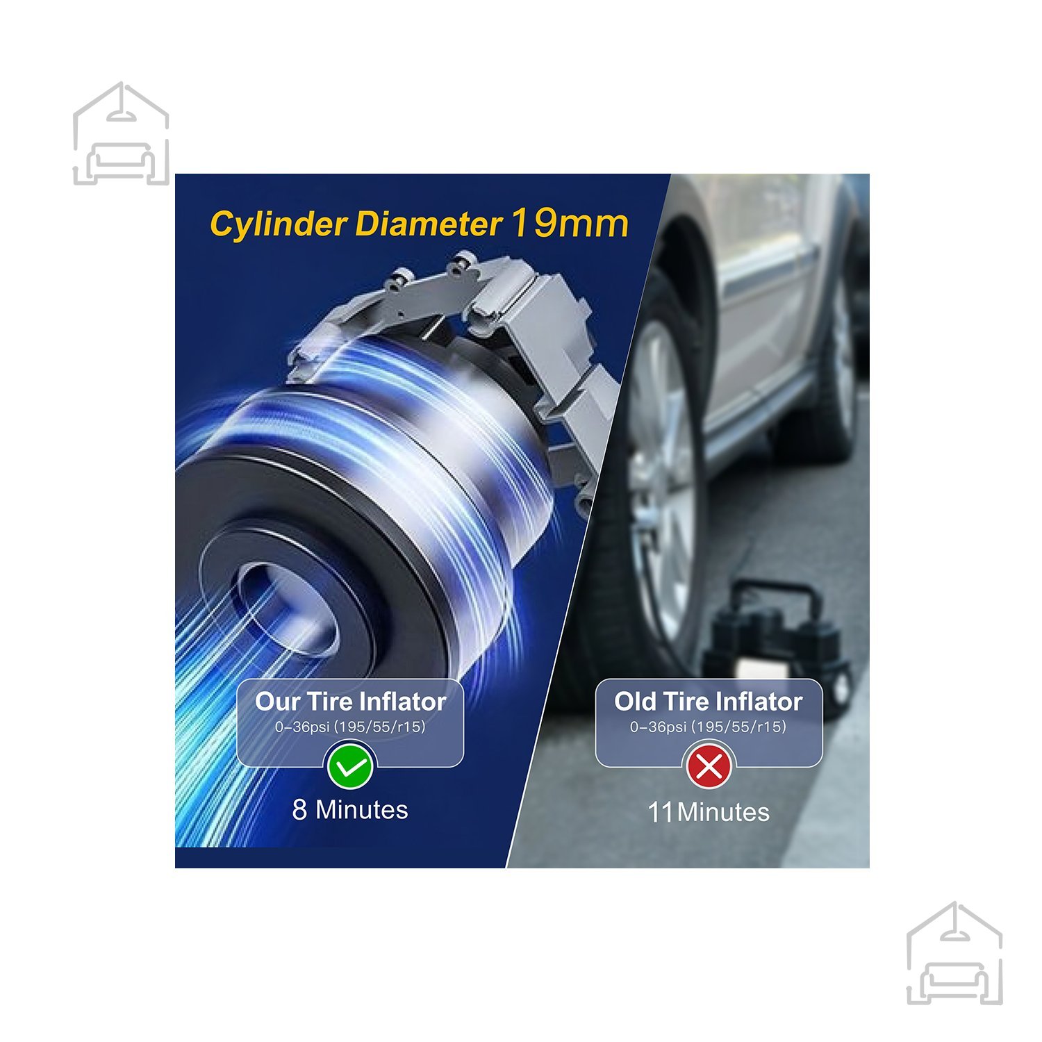 Pri napetosti DC 7,4 V in moči 50 W tlačilka doseže pretok zraka 19 L/min z valjem premera 19 mm. To pomeni, da lahko pnevmatiko velikosti 195/65/R15 pri popolnoma napolnjeni bateriji napolni v približno 7,5 minute (±30 s). Z največjim tlakom 150 PSI / 10,3 BAR je primerna za različne tipe vozil, koles in športnih rekvizitov. Vgrajen hladilni ventilator skrbi, da naprava med delovanjem ostane stabilna, kar podaljšuje njeno življenjsko dobo.
