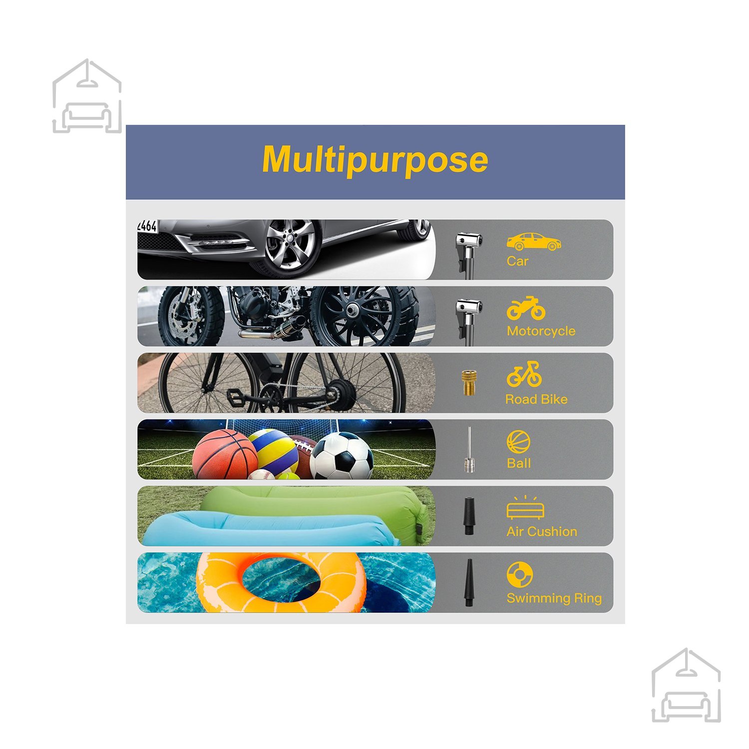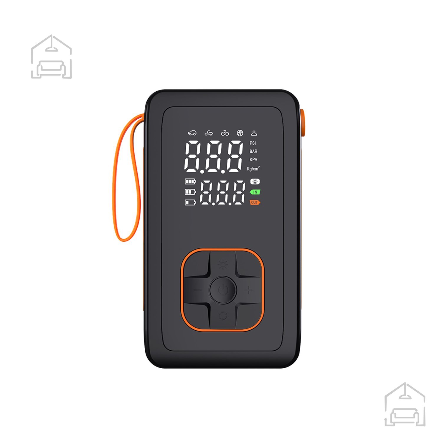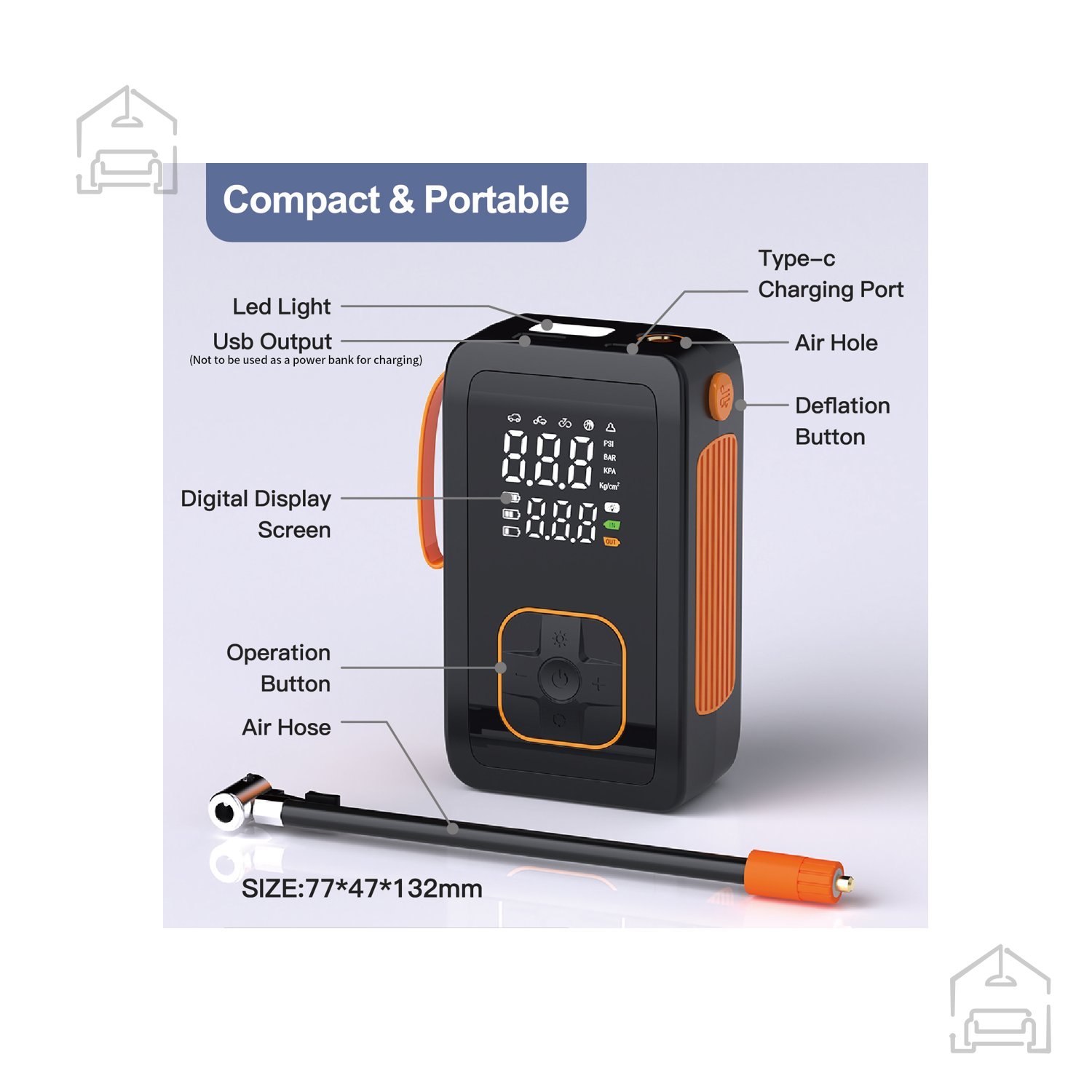 Kompaktna oblika in udoben ročaj omogočata enostavno prenašanje, zato je tlačilka idealna za potovanja, kampiranje ali športne aktivnosti na prostem. Zasnova brez kablov pomeni, da ne potrebujete neposrednega priklopa na vtičnico ali avtomobilski napajalnik – dovolj je, da je baterija napolnjena. Naprava služi tudi kot priročna rezervna svetilka ali vir energije v sili.