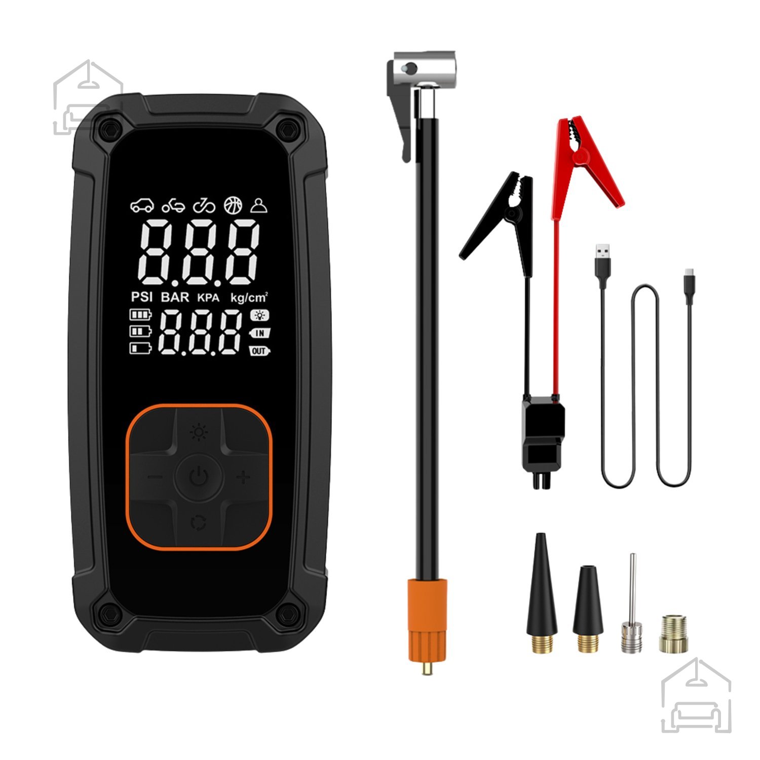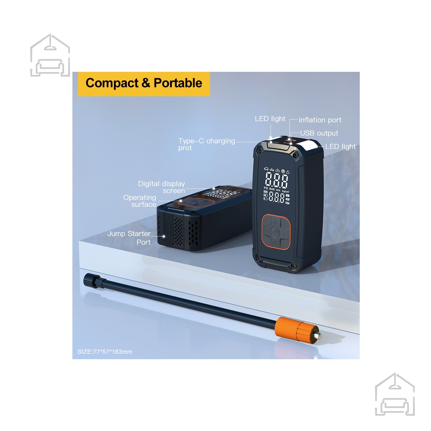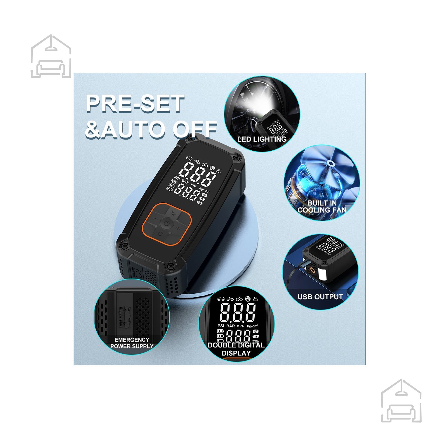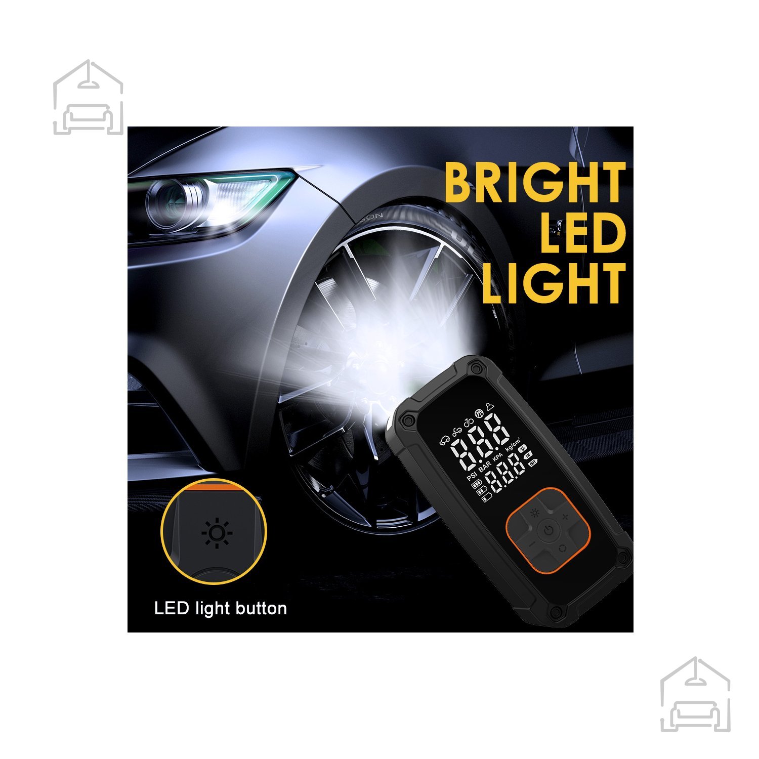 Večnamenska akumulatorska tlačilka z funkcijo zagona v sili je idealna tako za vsakodnevno uporabo kot tudi v nujnih primerih. Opremljena je z jasnim digitalnim zaslonom, vgrajeno LED-svetilko s tremi načini delovanja ter funkcijo powerbank. Naprava samodejno ustavi tlačenje, ko doseže nastavljeni tlak, in omogoča zagon vozila v sili.
