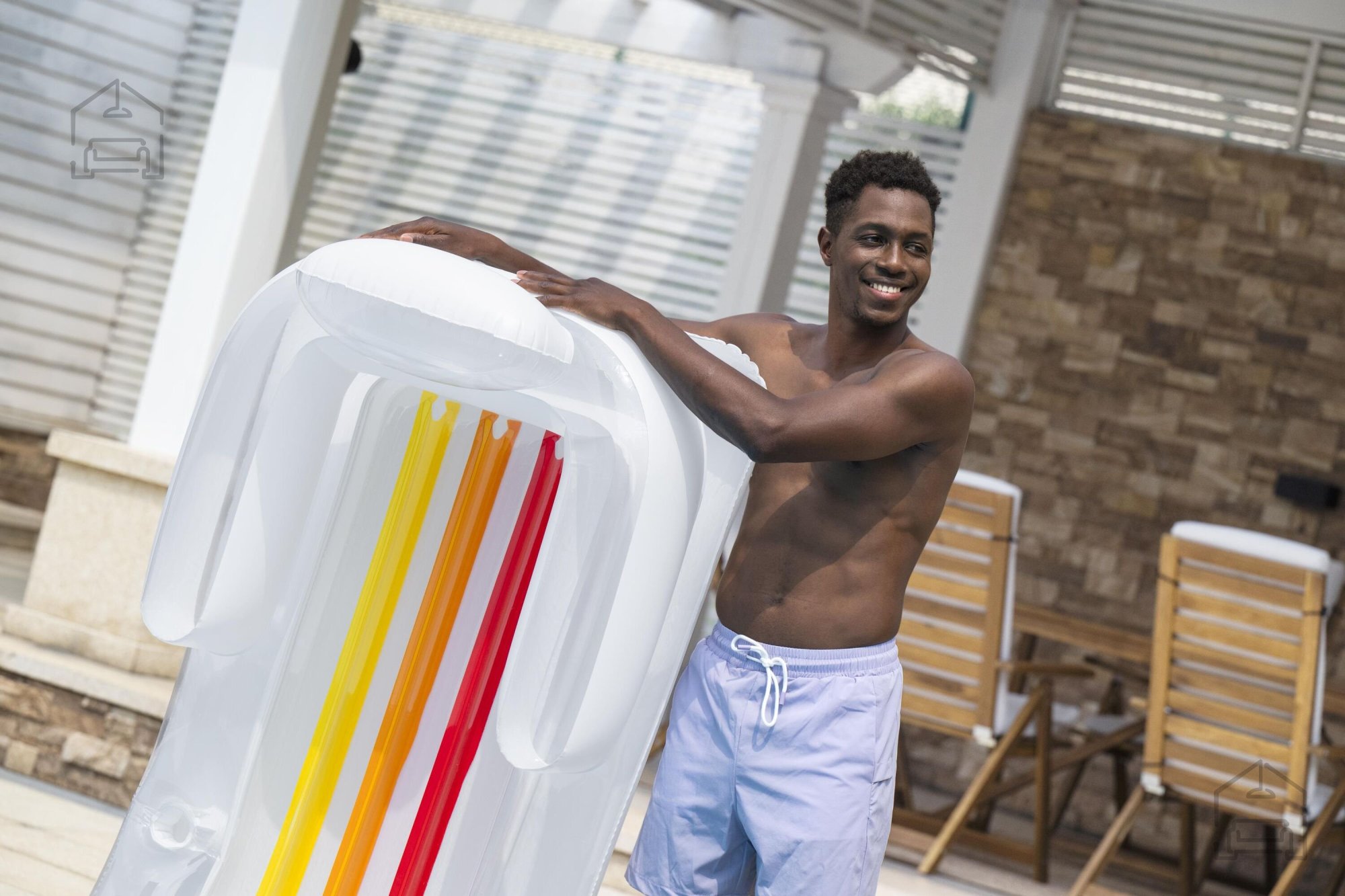 Blazina je idealna za uporabo ob bazenu, na plaži ali na travi. Zaradi svoje lahke konstrukcije jo je mogoče enostavno prenašati in hitro napihniti oziroma izprazniti. Ko je zložena, zavzame zelo malo prostora, kar omogoča priročno shranjevanje in transport. Večbarvna izvedba prinaša živahen, poletno igriv videz, ki se lepo ujema z okolico ob vodi.