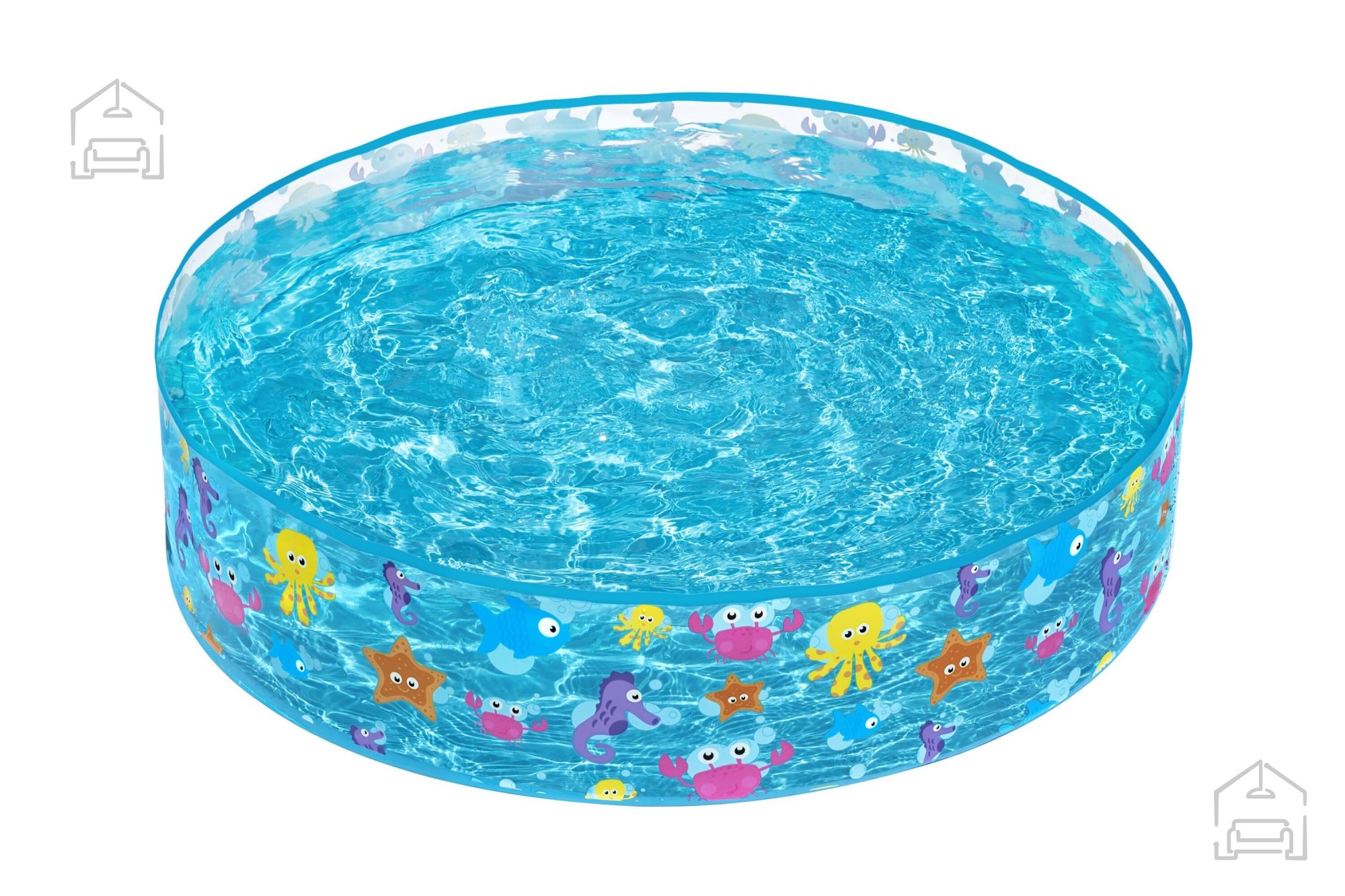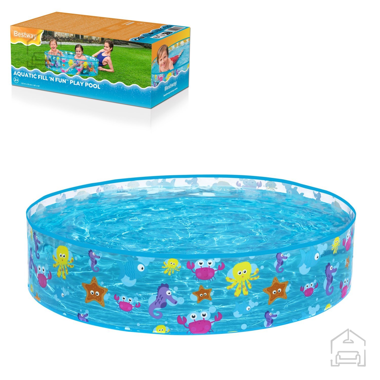 Dimenzije 122×122×25 cm predstavljajo optimalno razmerje med kompaktnostjo in uporabno prostornino. Višina 25 cm omogoča varno uporabo tudi za mlajše otroke, saj nivo vode ostaja primeren za igro in nadzor odraslih. Okrogla oblika omogoča enakomerno porazdelitev vode in stabilno stojišče, kar povečuje varnost med uporabo.