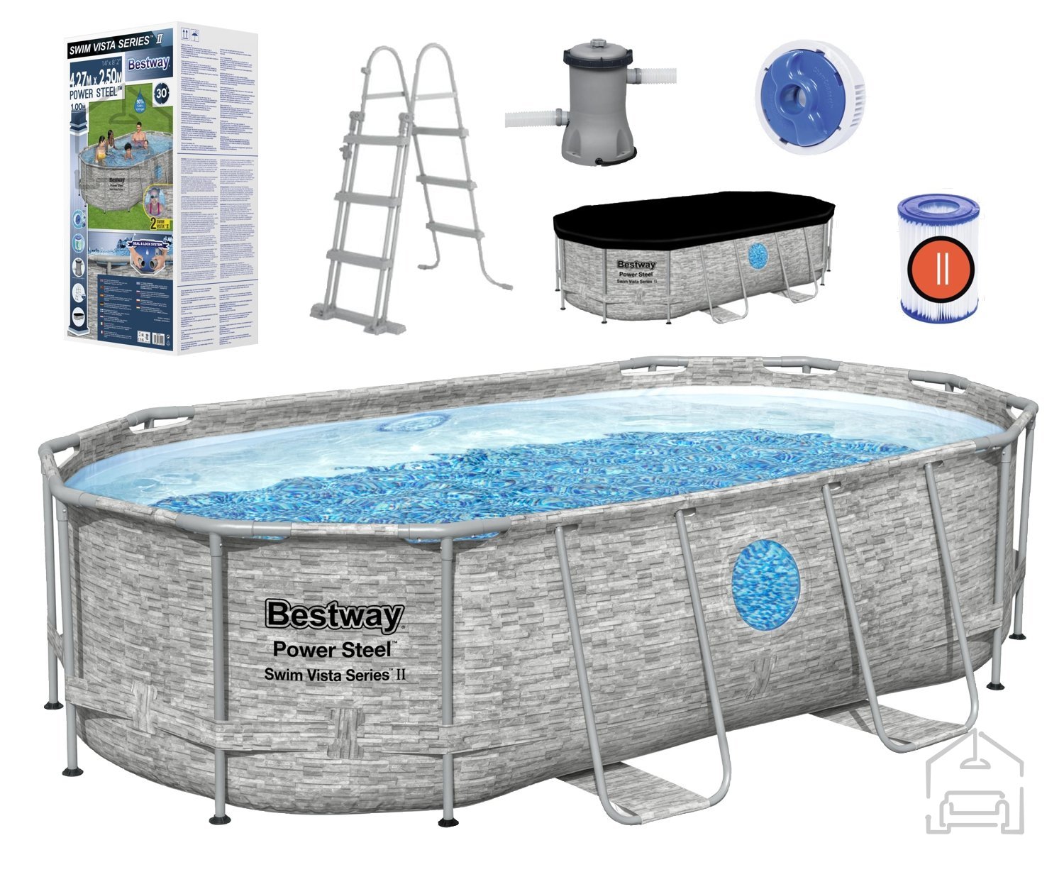 Bazen z ogrodjem in dimenzijami 4,27x2,5x1 m je odlična izbira za vrt, saj ponuja prostornost in udobje. Zahvaljujoč stabilni konstrukciji in kakovostnim materialom zagotavlja varno in prijetno uporabo. V kompletu so priloženi filtrirna črpalka, lestev, pokrov in dozator, kar omogoča enostavno in udobno uporabo bazena. Idealna rešitev za poletne dni, ki ponuja popolne pogoje za sprostitev.